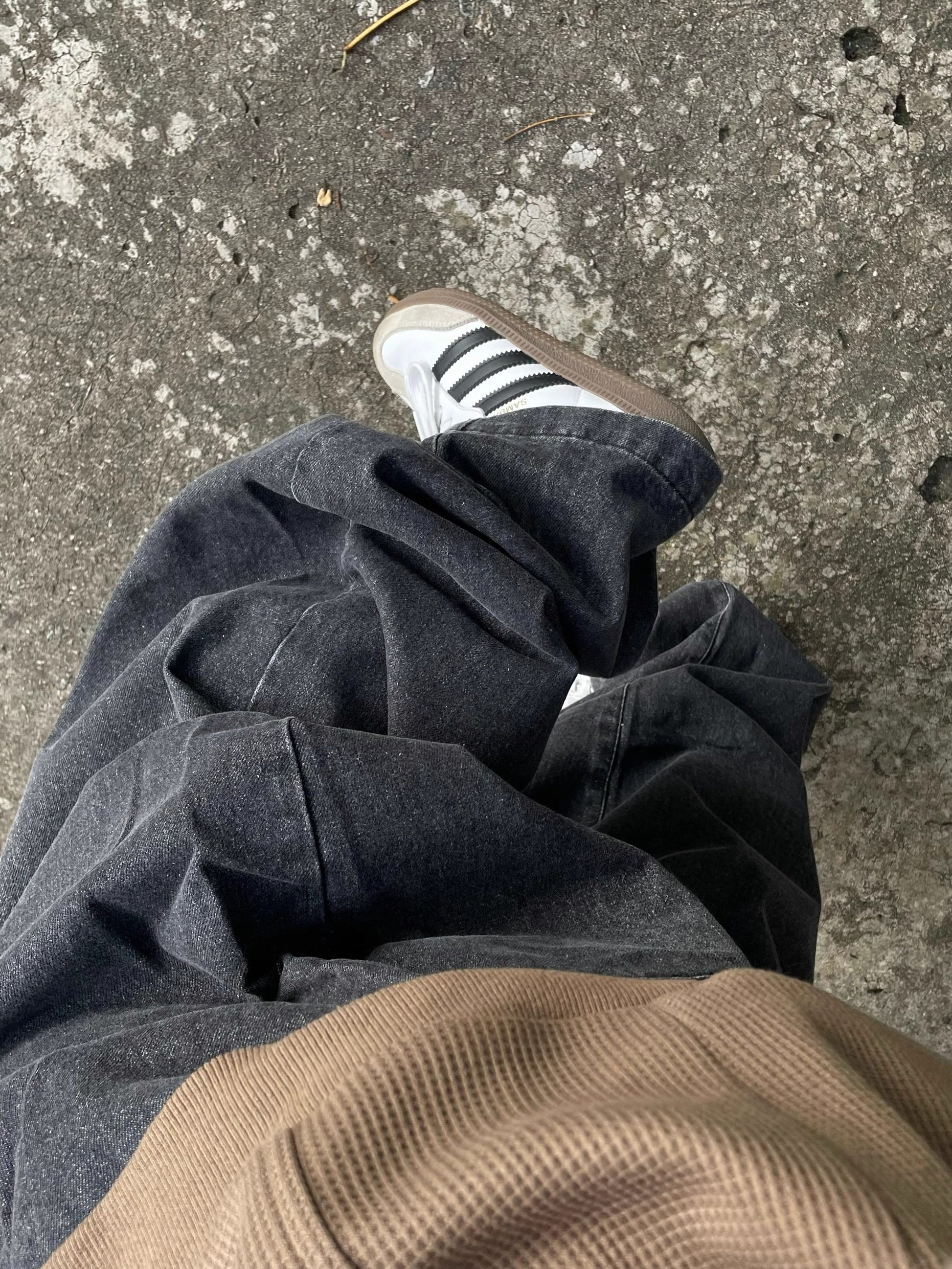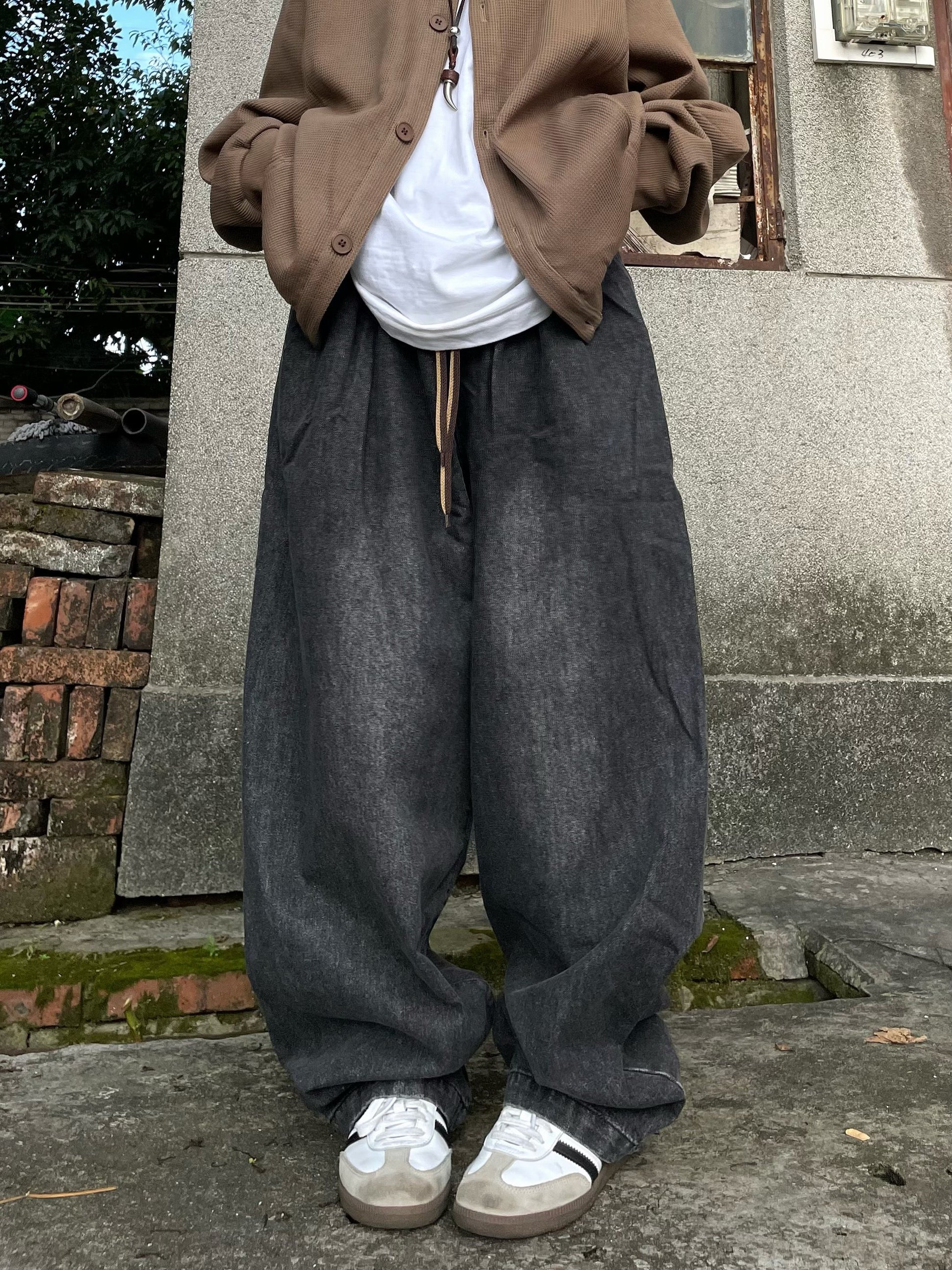 340gの重厚デニムでシルエットが崩れず美しく出るワイドパンツ。ウエストは紐で調整でき、男女問わず着用可能。