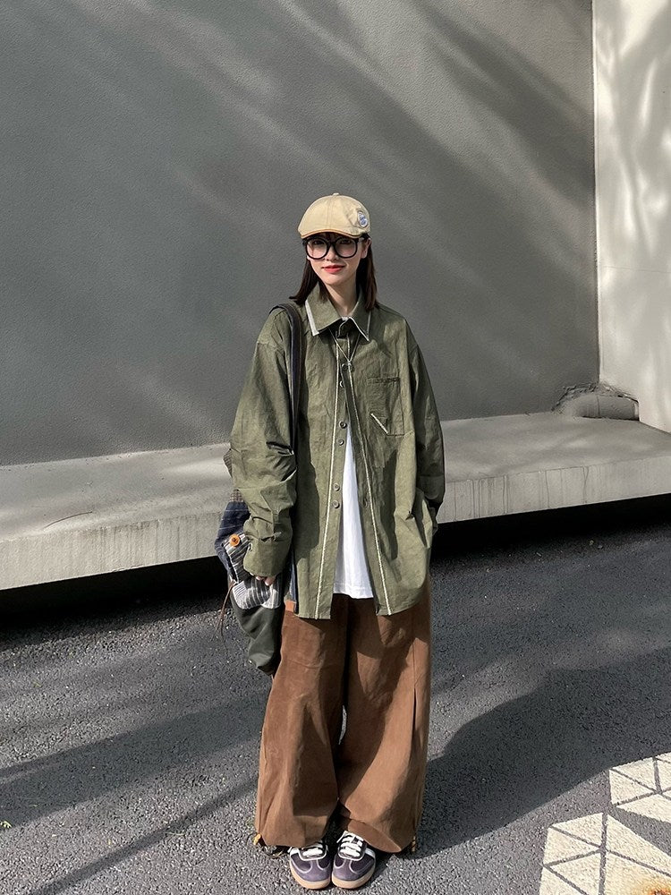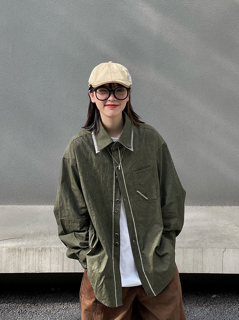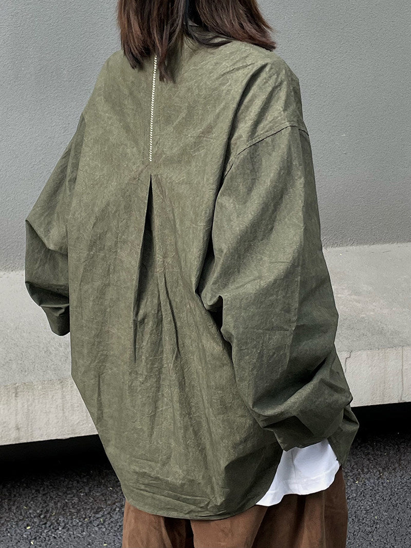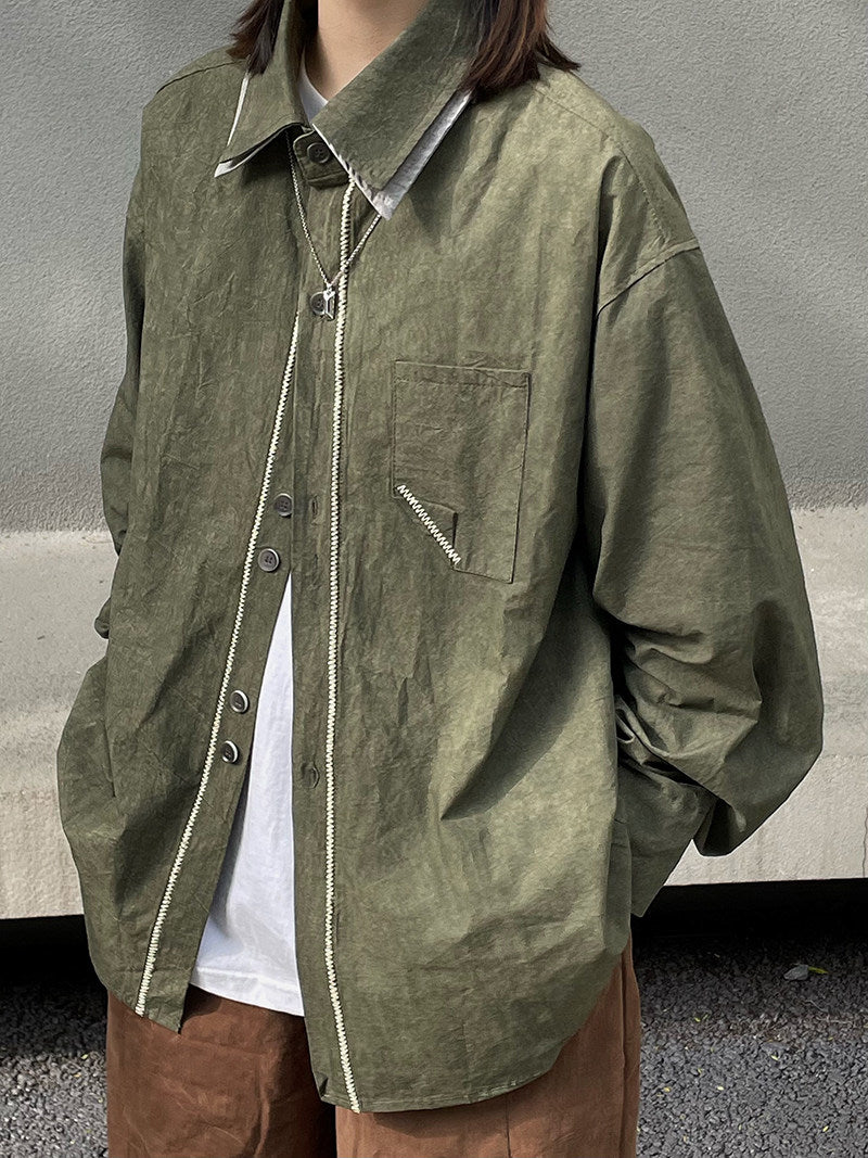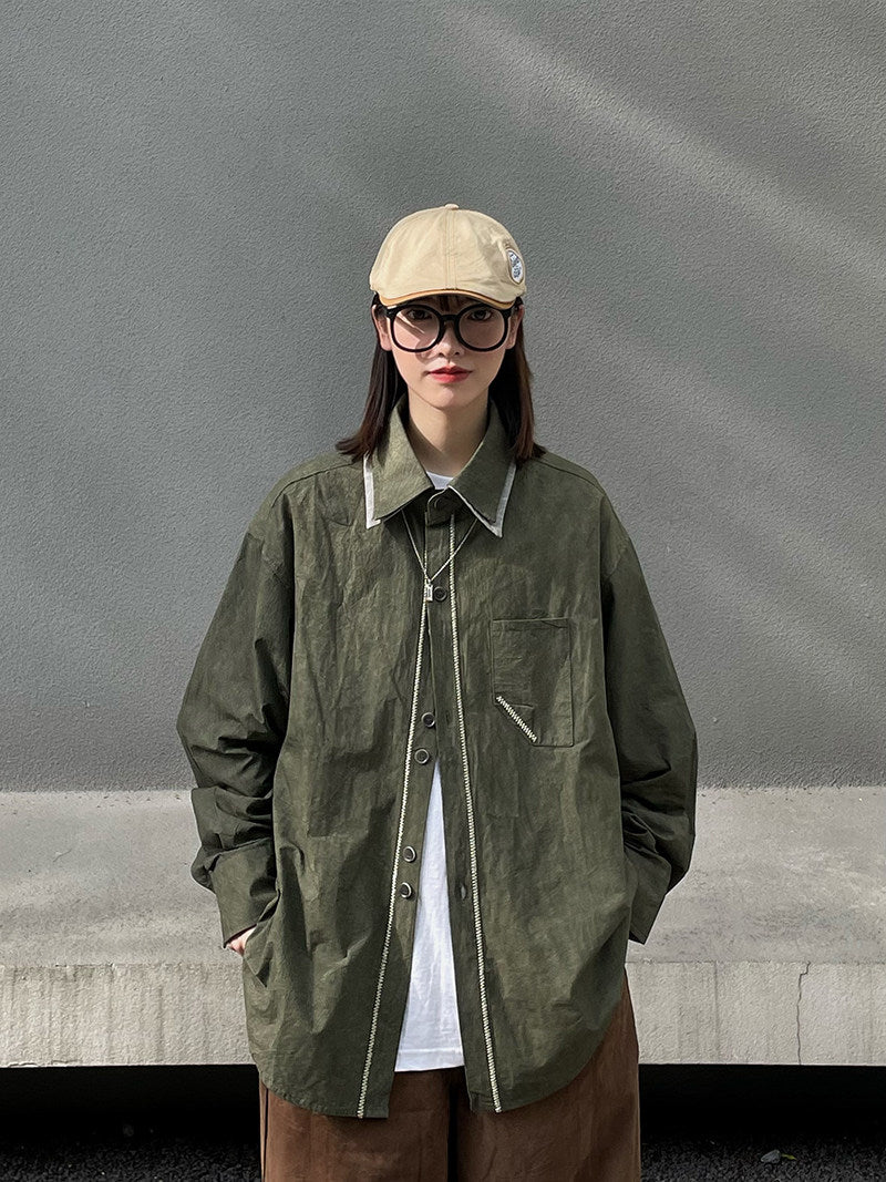 レトロ感あふれる扎染加工と個性的な二重襟デザインが特徴のユニセックスシャツ。ゆったりとしたシルエットで男女問わず着用でき、グリーン・ライトグレー・ブラウンの3色展開。
