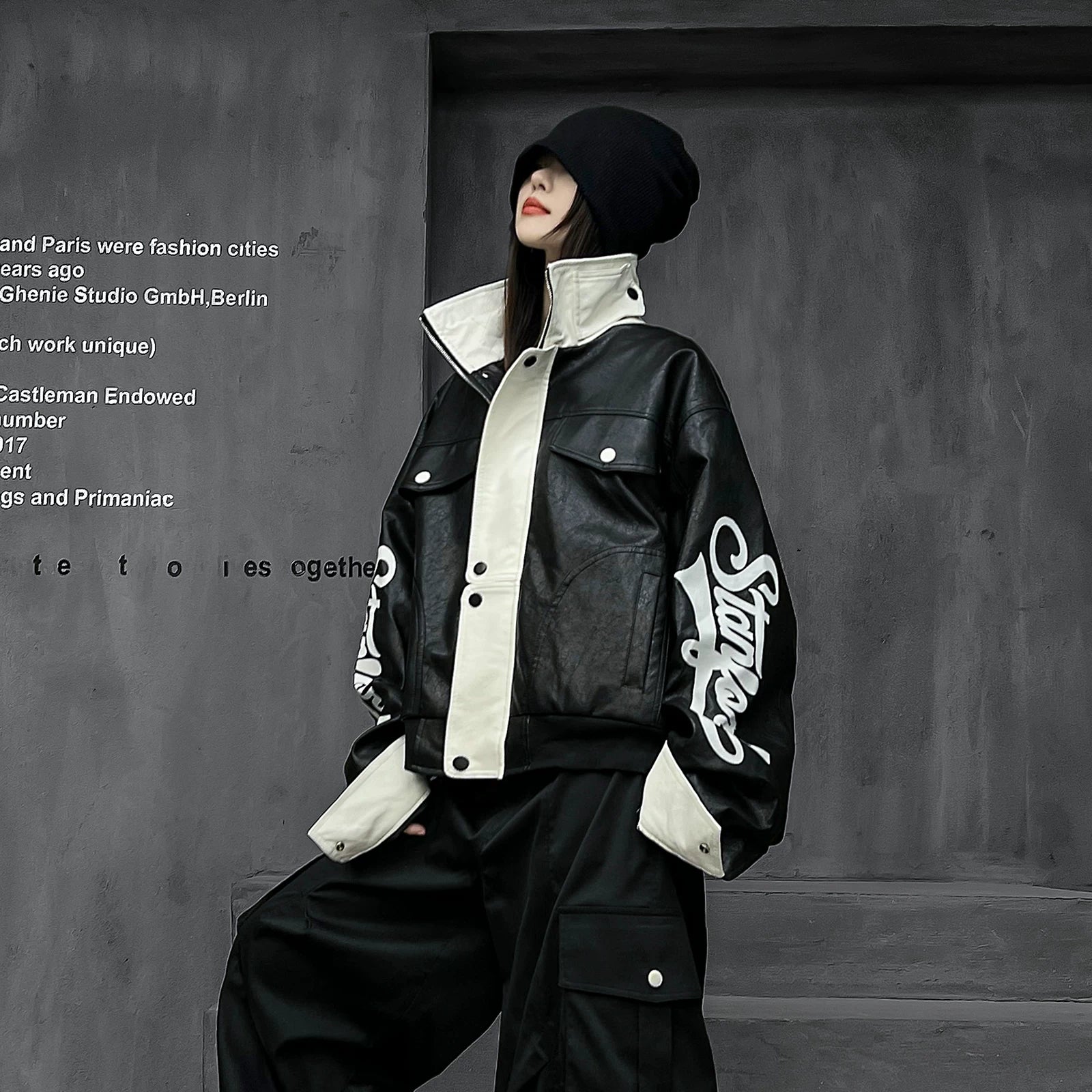 ストリートムード漂うPUレザージャケット。軽量で扱いやすいフェイクレザー素材を使用し、立ち襟×ゆるシルエットが高街系の雰囲気を演出。袖の大胆なロゴデザインがアクセントとなり、Tシャツ・パーカーとのレイヤードにも最適な一枚。