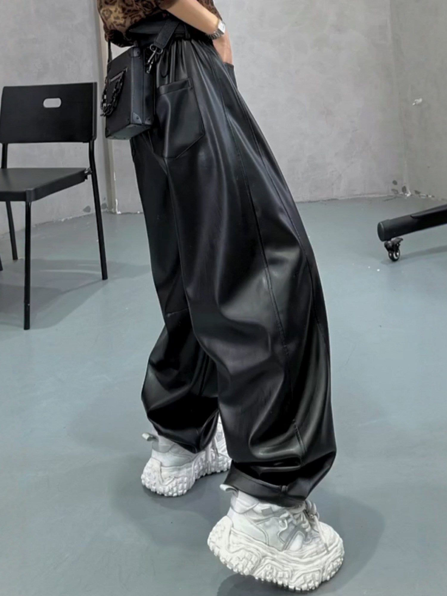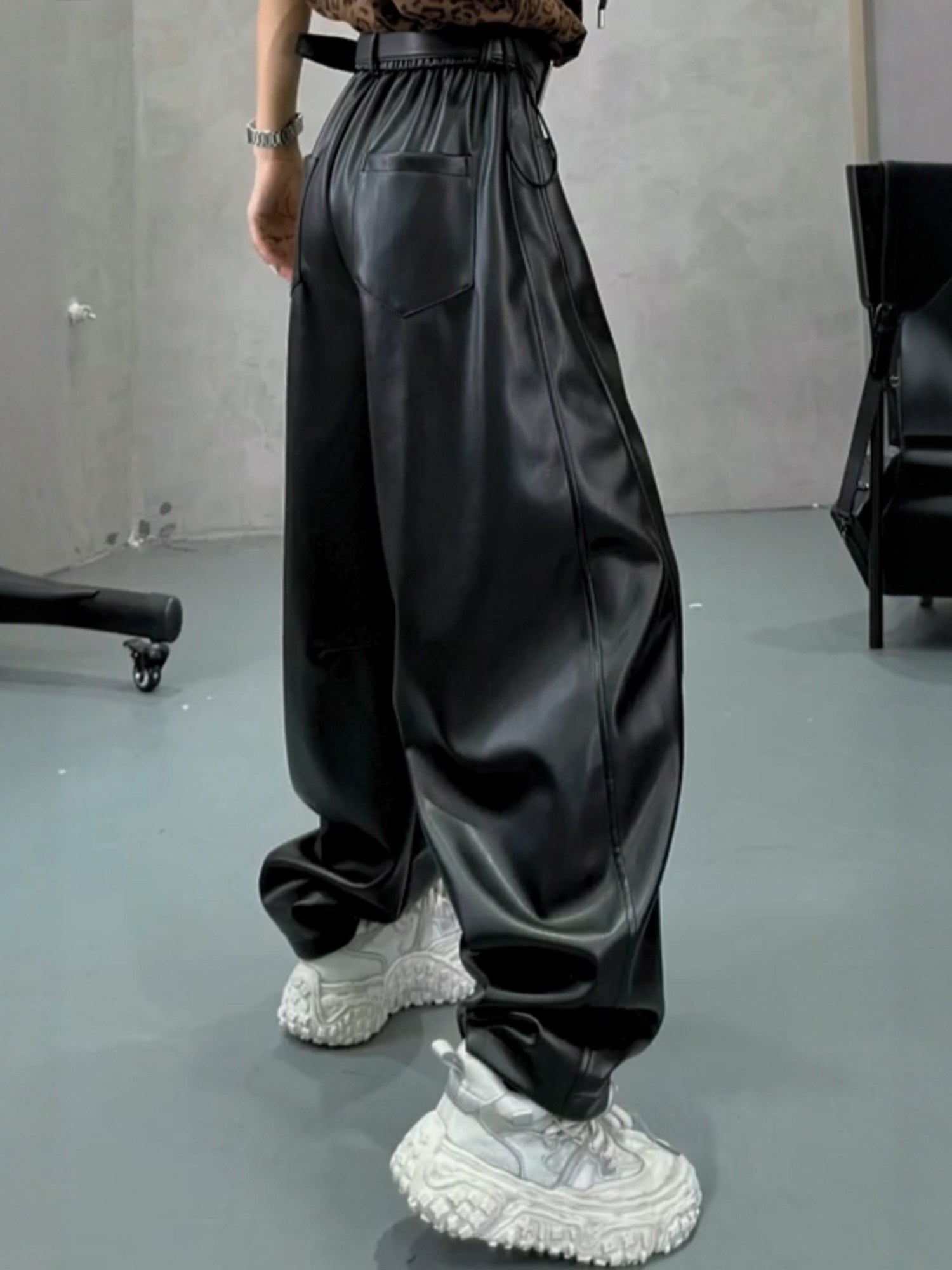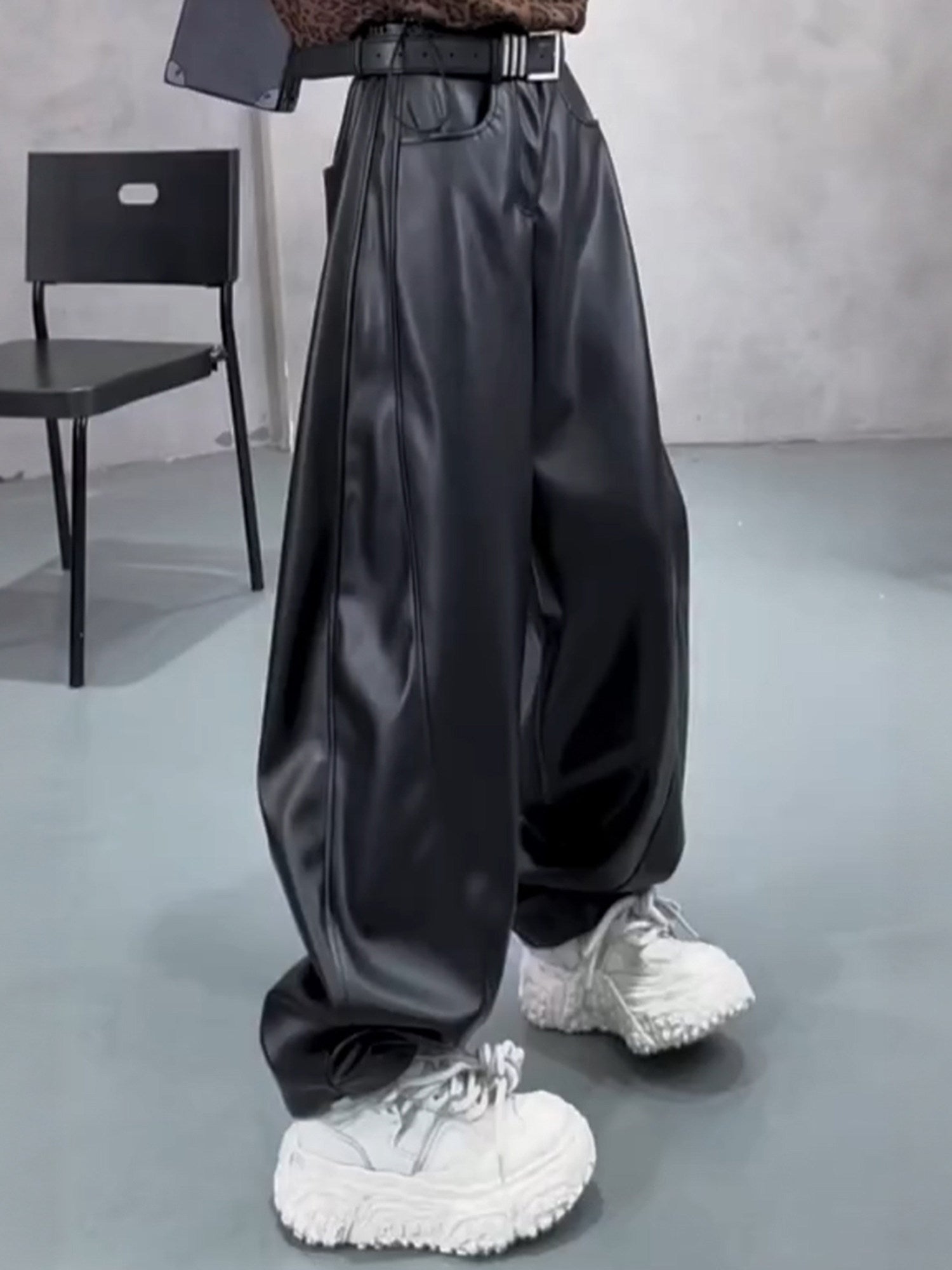 艶感のあるしなやかなPUレザーに加え、暖かい裏起毛仕様で冬でも快適な高街系ワイドパンツ。立体的なカーブラインが脚のラインを拾わず、体型カバー効果も抜群。たっぷりとしたボリュームのあるシルエットがストリート・モード・韓国系コーデに相性抜群の一枚。【カラー】ブラック(裏起毛・加厚)
