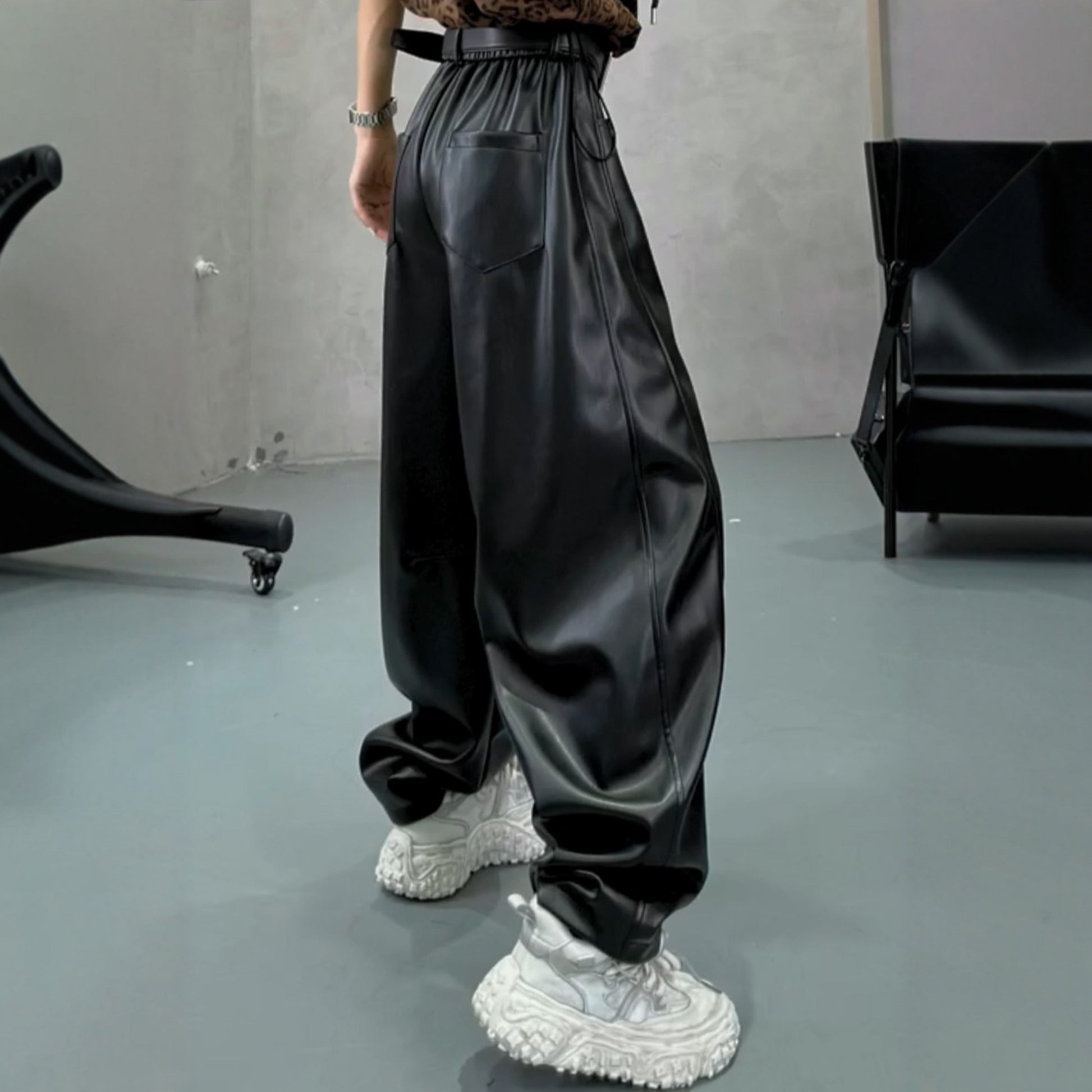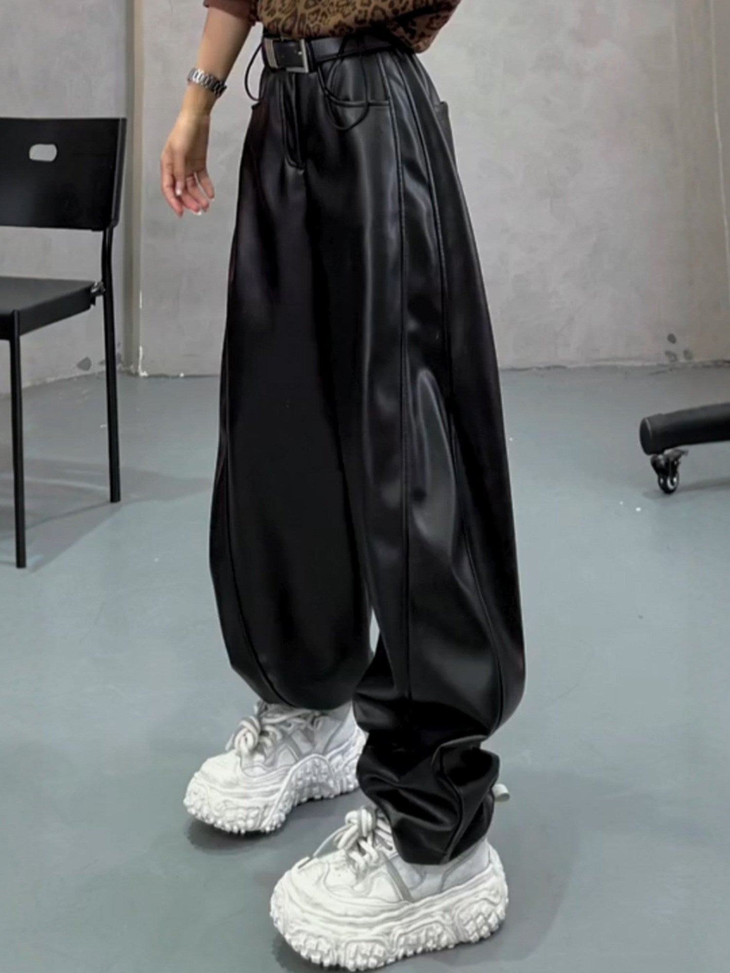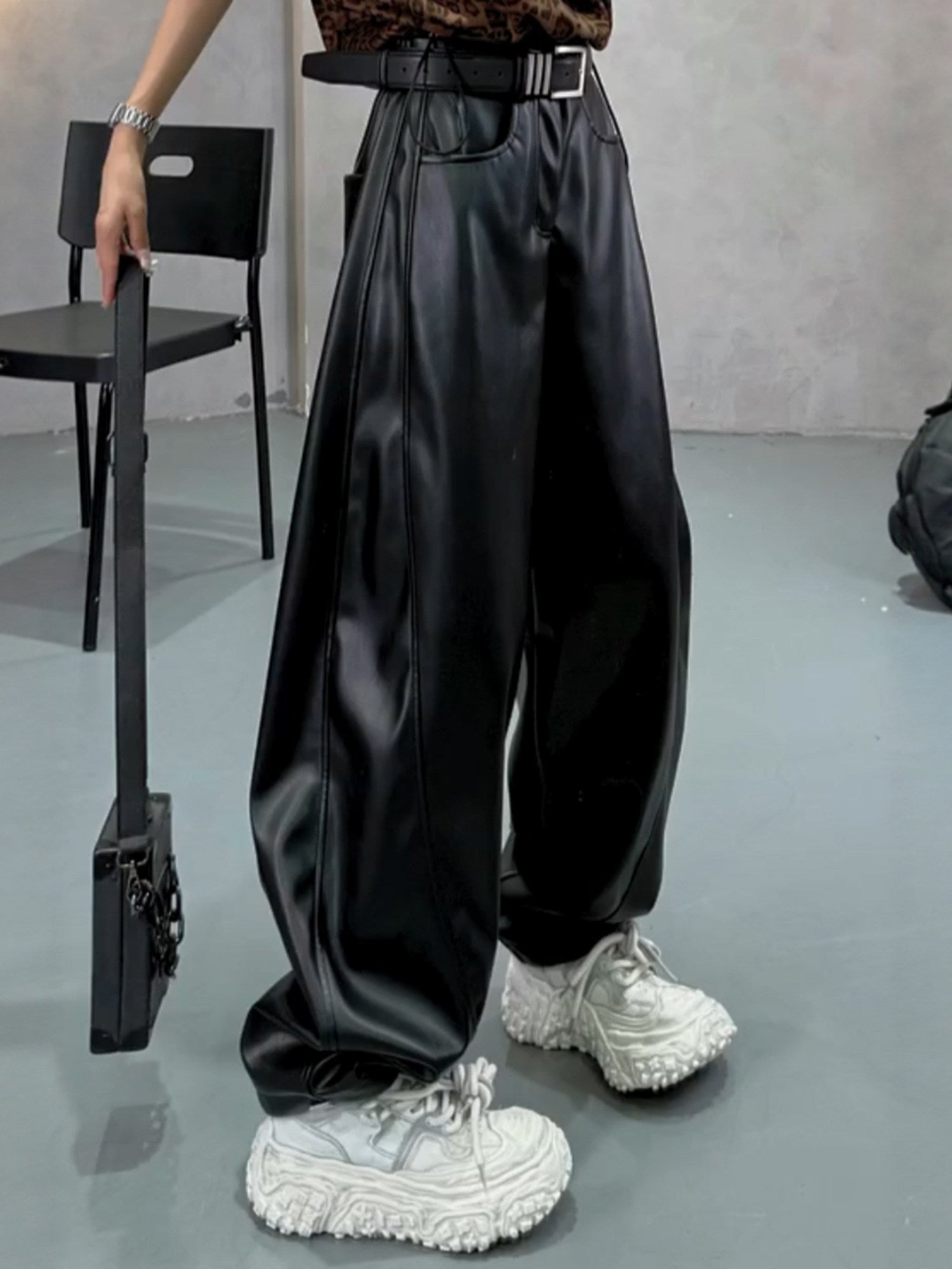 艶感のあるしなやかなPUレザーに加え、暖かい裏起毛仕様で冬でも快適な高街系ワイドパンツ。立体的なカーブラインが脚のラインを拾わず、体型カバー効果も抜群。たっぷりとしたボリュームのあるシルエットがストリート・モード・韓国系コーデに相性抜群の一枚。【カラー】ブラック(裏起毛・加厚)