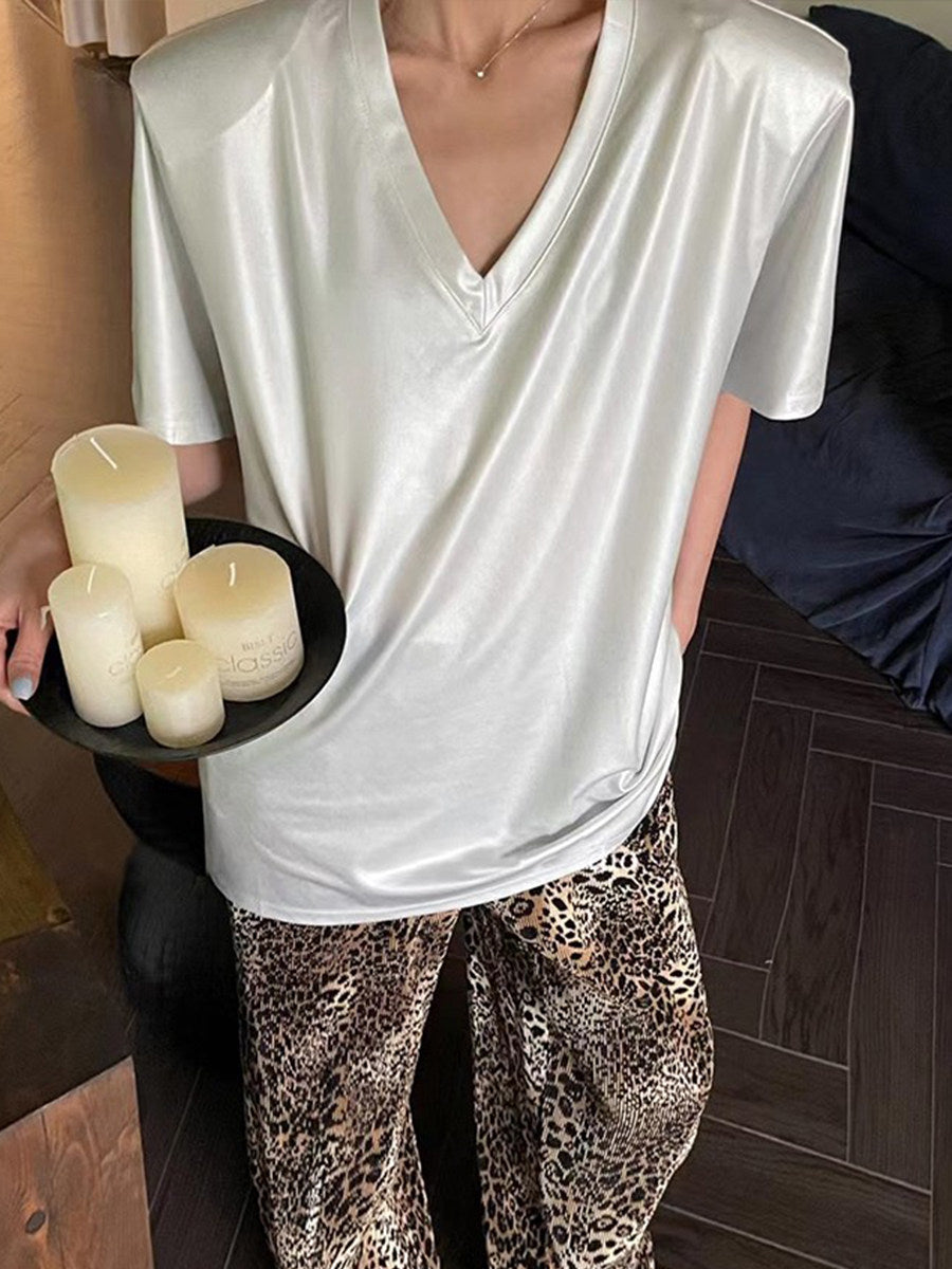 MVネック垂れ艶ショルダーパッド半袖Tシャツ(AVN020)