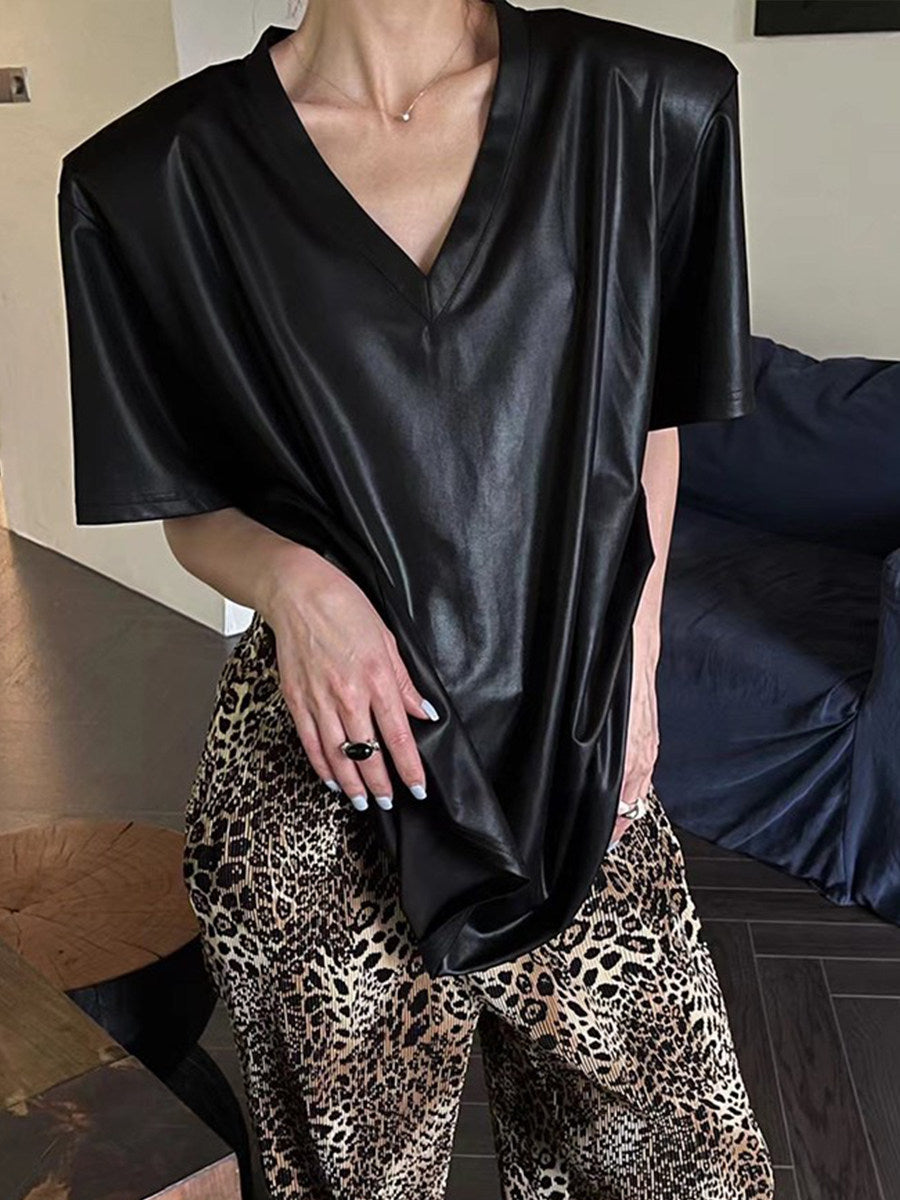 光沢感のある艶素材を使用したVネックTシャツ。肩パッド入りで肩〜腕がシャープに見え、スタイルアップ効果抜群。ゆったり落ち感のあるシルエットで体型カバーに優れ、ヒップまで隠れるロング丈。デイリーからモード系コーデまで幅広く使える1枚。