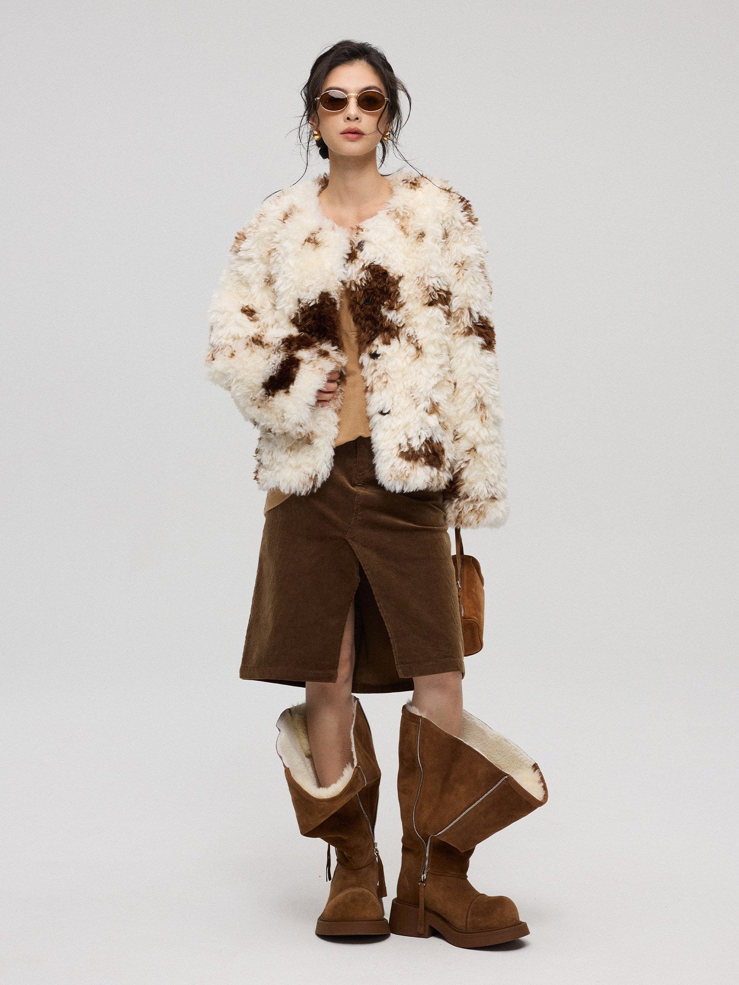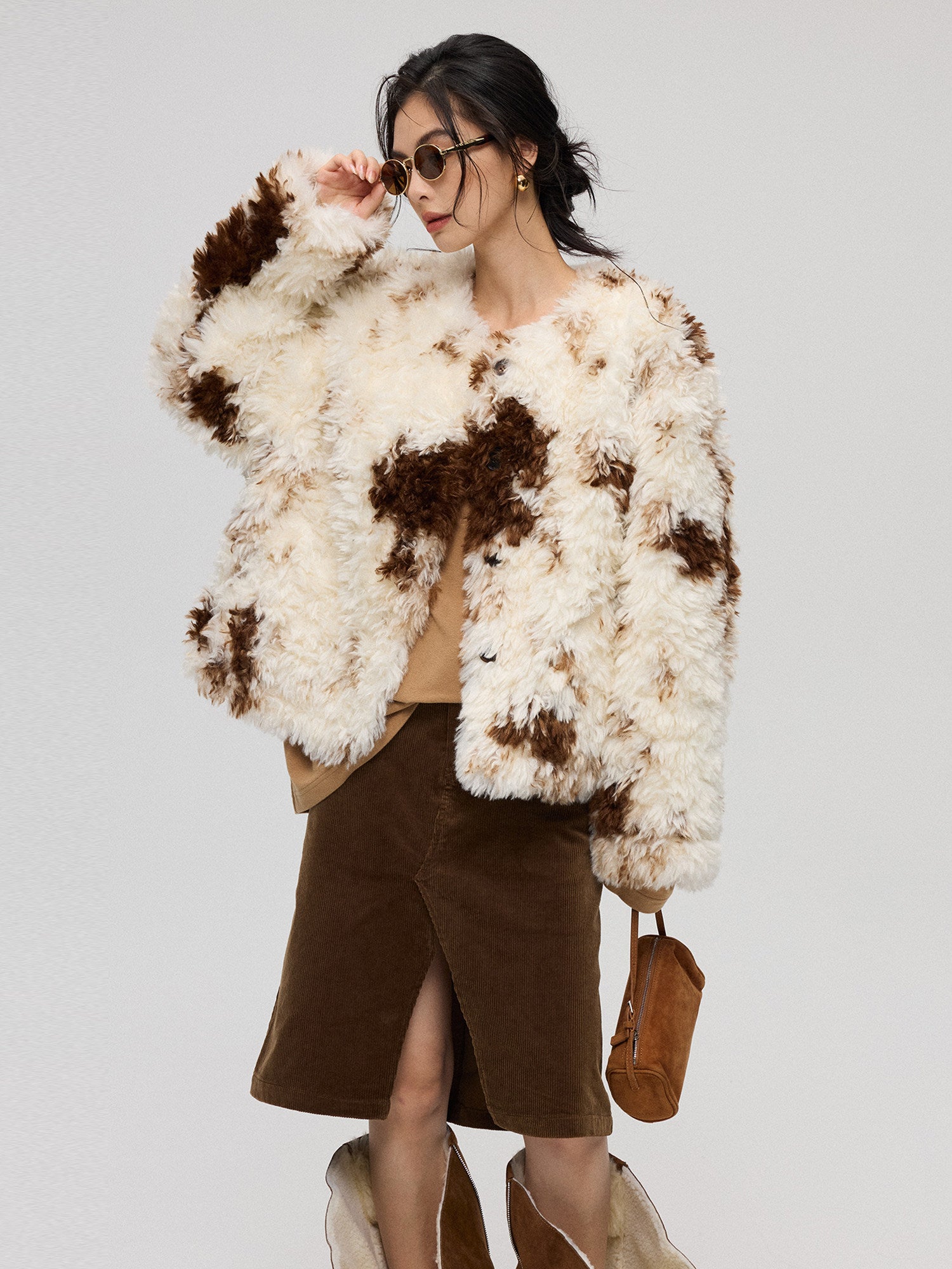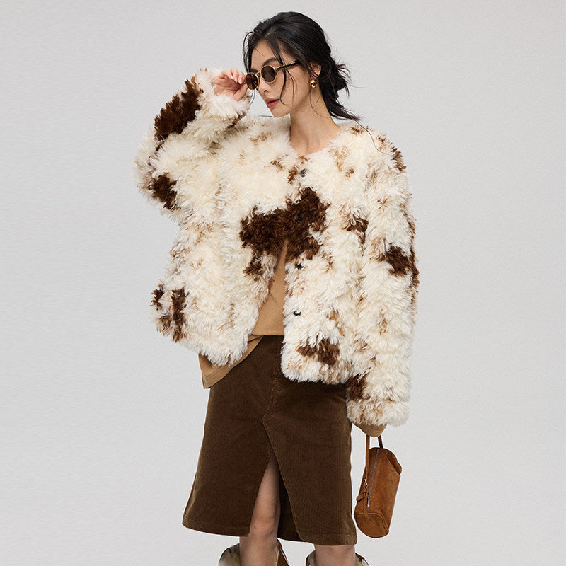 混色プリントが特徴のエコファー短丈アウター。ふんわり柔らかい質感で高級感のある仕上がり。付属のマフラーとセットで防寒性とデザイン性を両立。軽量で着回しやすく、秋冬コーデの主役になるアイテム。