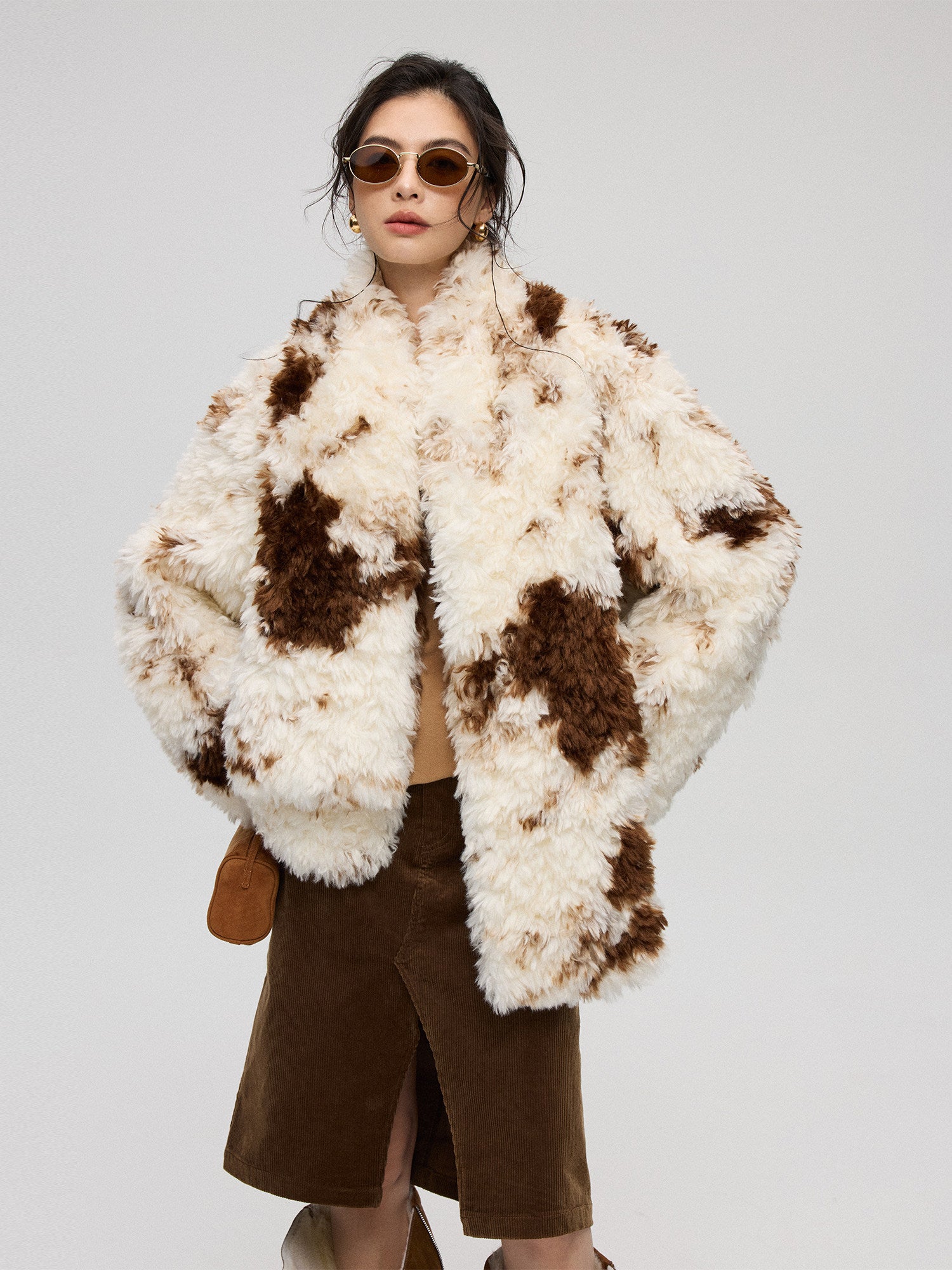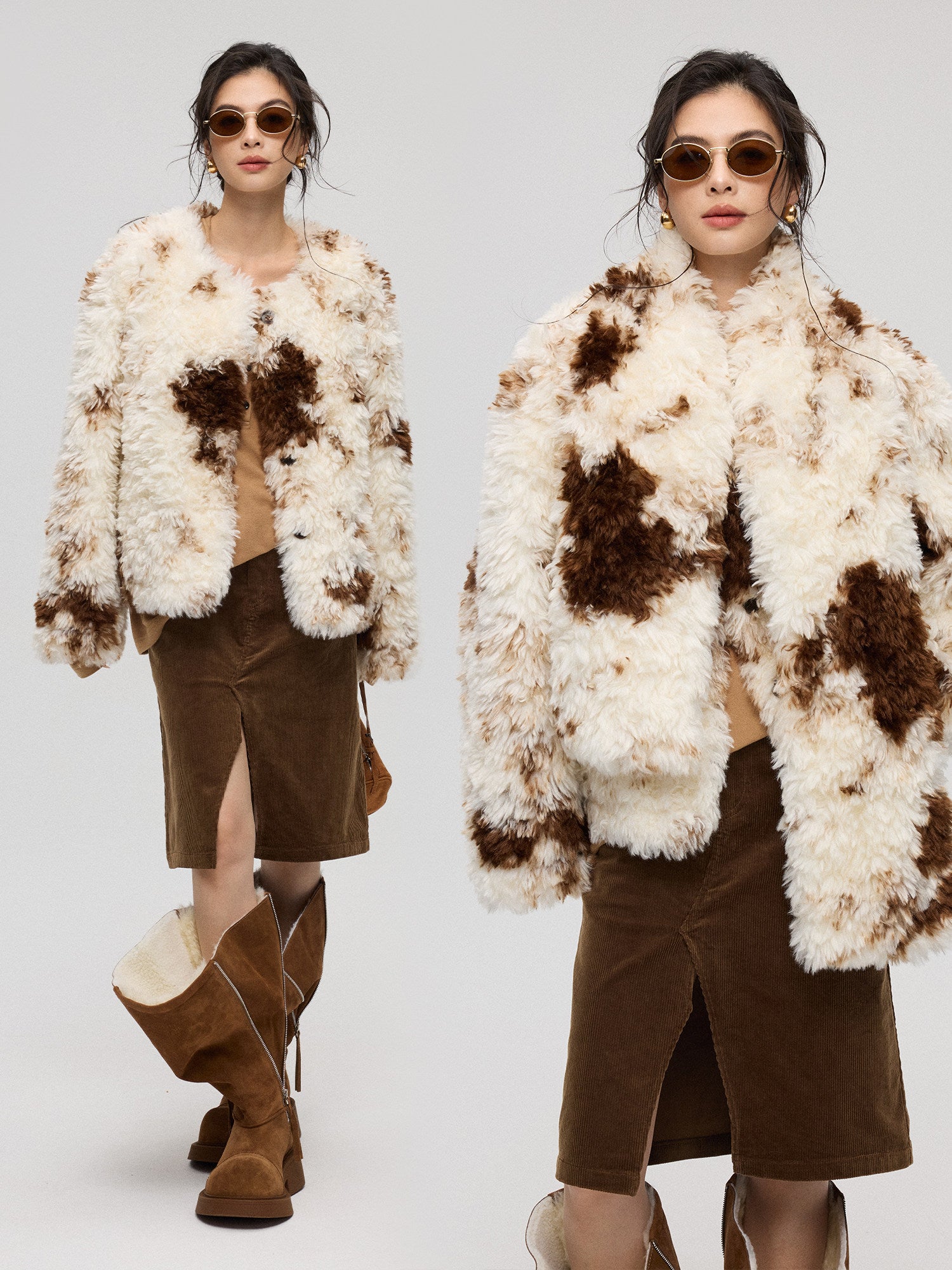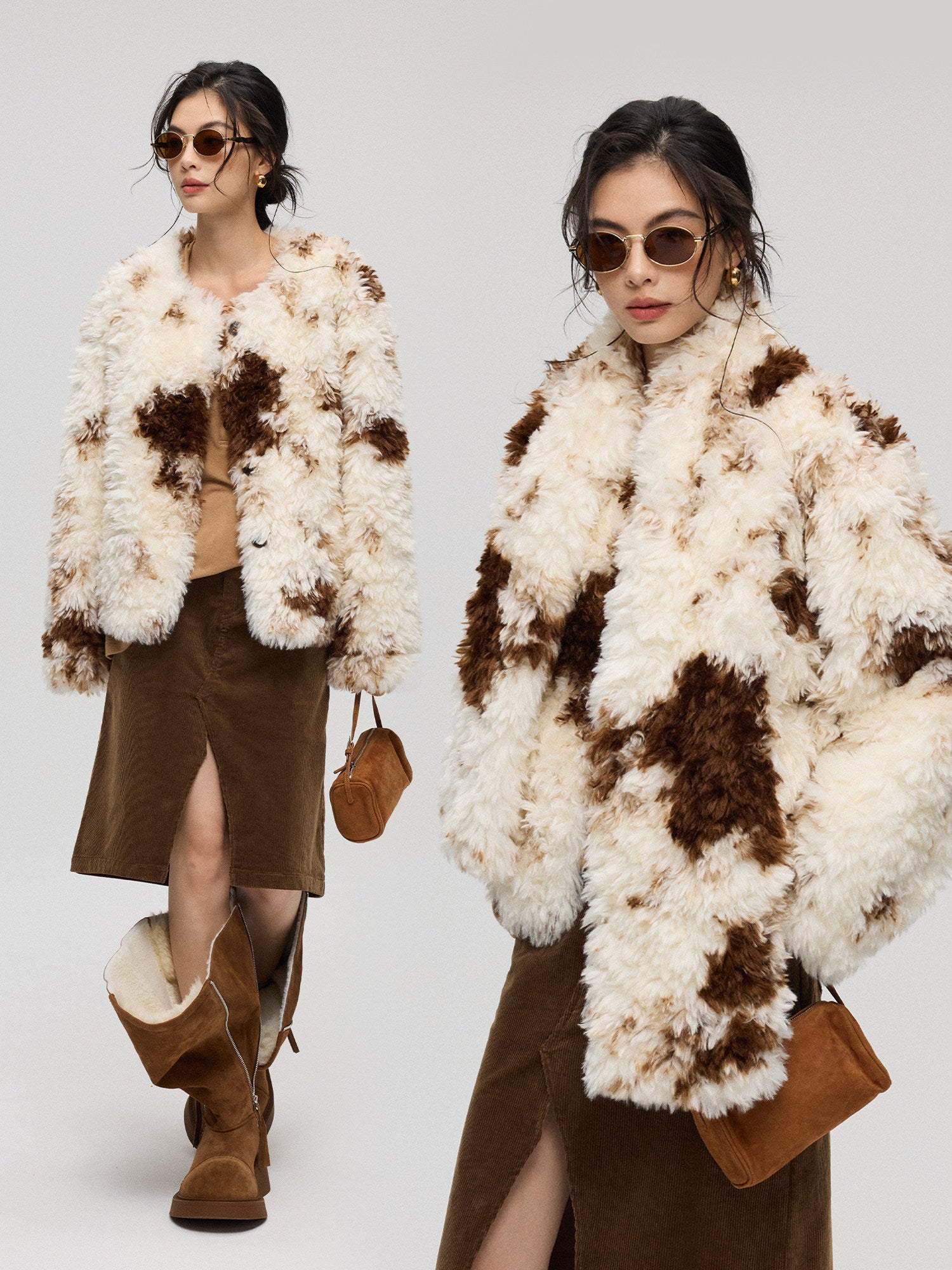 混色プリントが特徴のエコファー短丈アウター。ふんわり柔らかい質感で高級感のある仕上がり。付属のマフラーとセットで防寒性とデザイン性を両立。軽量で着回しやすく、秋冬コーデの主役になるアイテム。
