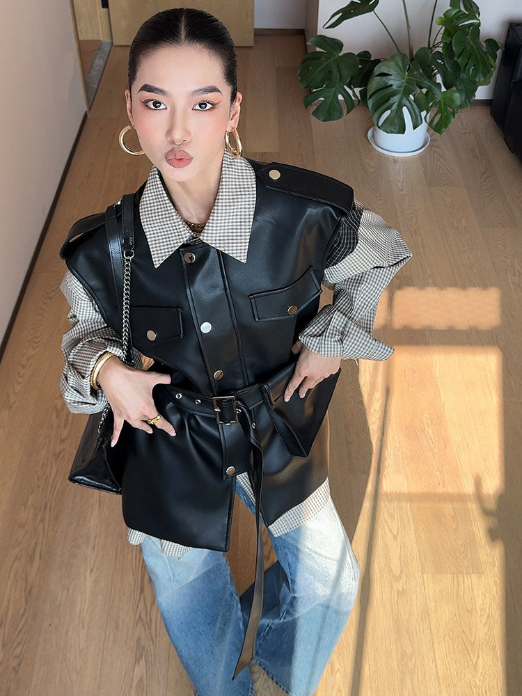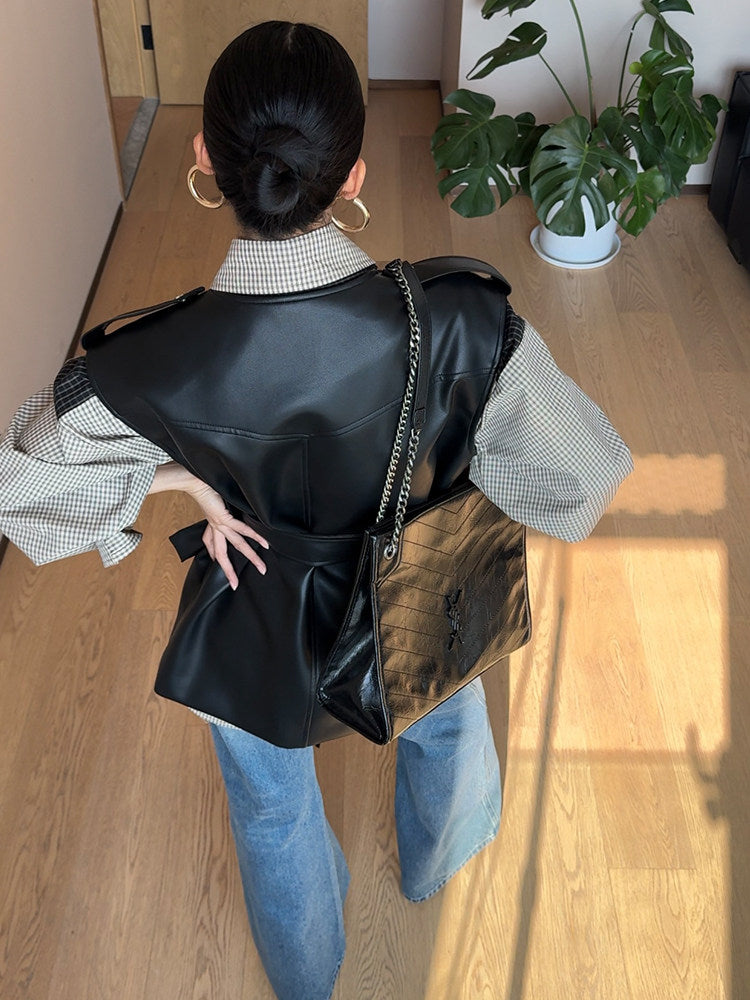 ウエストベルト付き フェイクレザー デザインベスト(AVN025)