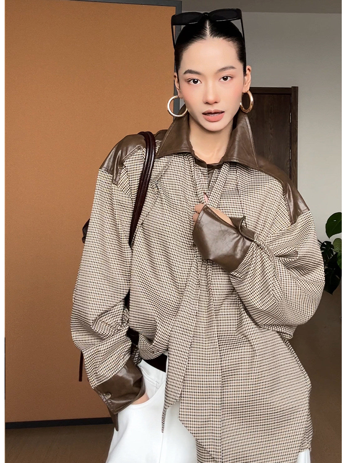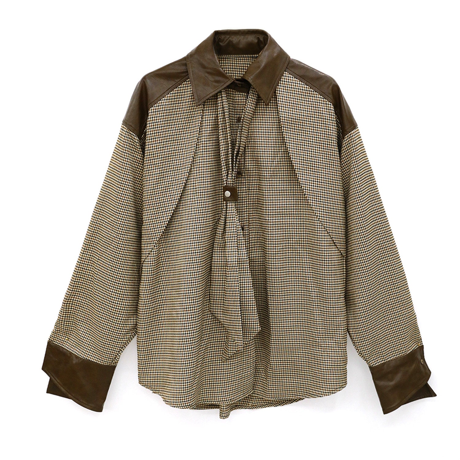 千鳥格チェックにメラードトーンの配色とレザー切替を組み合わせたデザイン性の高いシャツ。タイデザインが縦ラインを強調し、スタイリングに程よいモード感をプラス。ゆったりとしたシルエットで体型を選ばず、1枚でもレイヤードでも存在感のある一着。