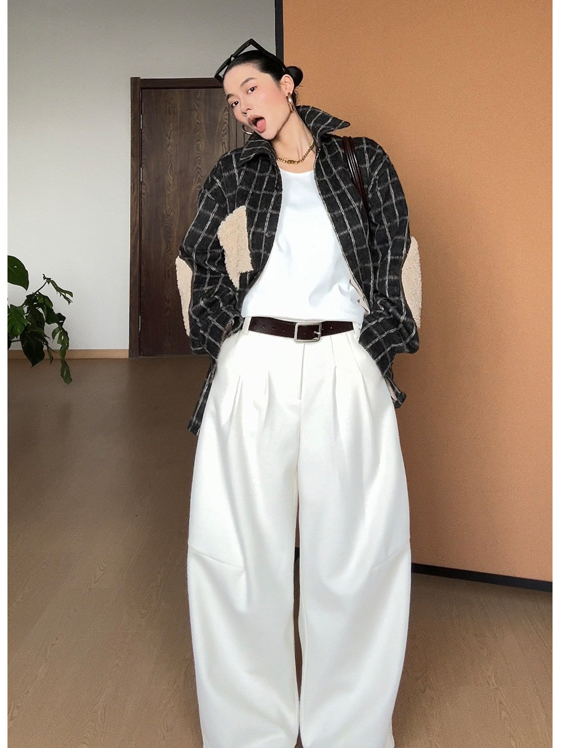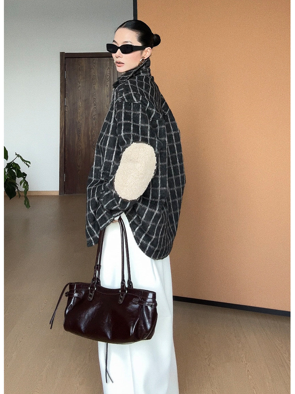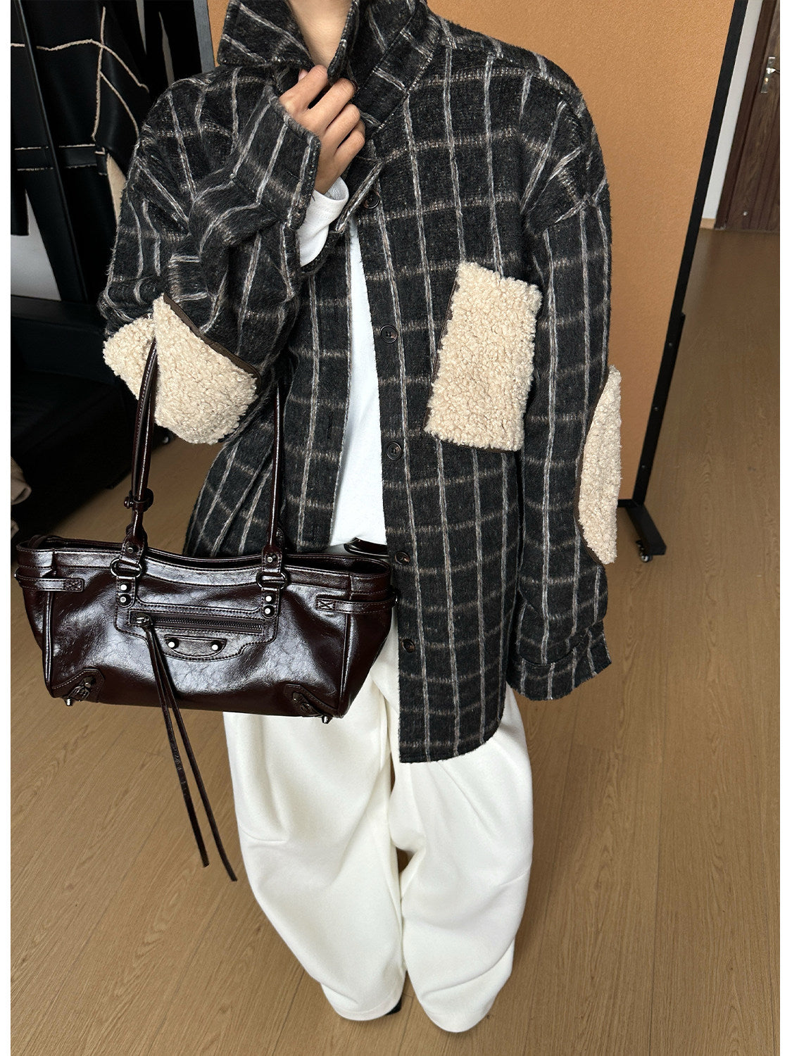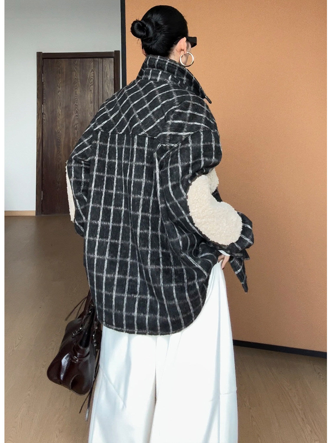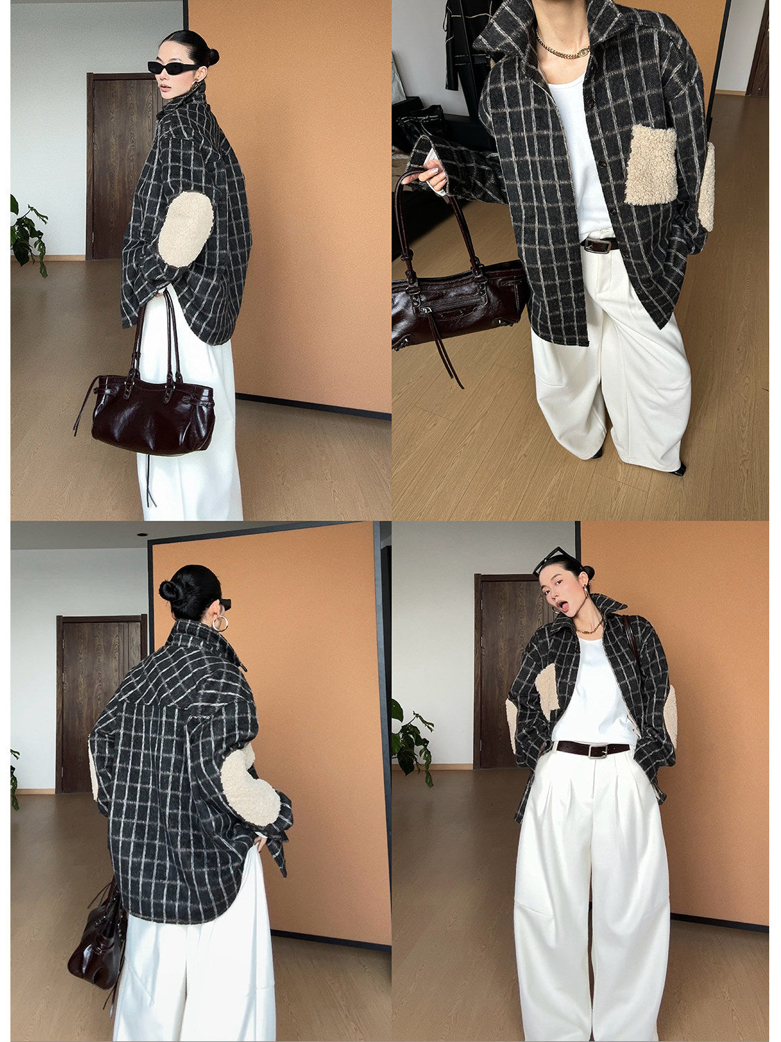起毛感のあるチェック生地に、内側は羊羔绒(ボア)仕様でしっかり保温性を確保したシャツジャケット。程よくゆとりのあるシルエットで、アウター感覚でも着用可能。肘部分の切替デザインがアクセントになり、シンプルなコーデに映える一着。