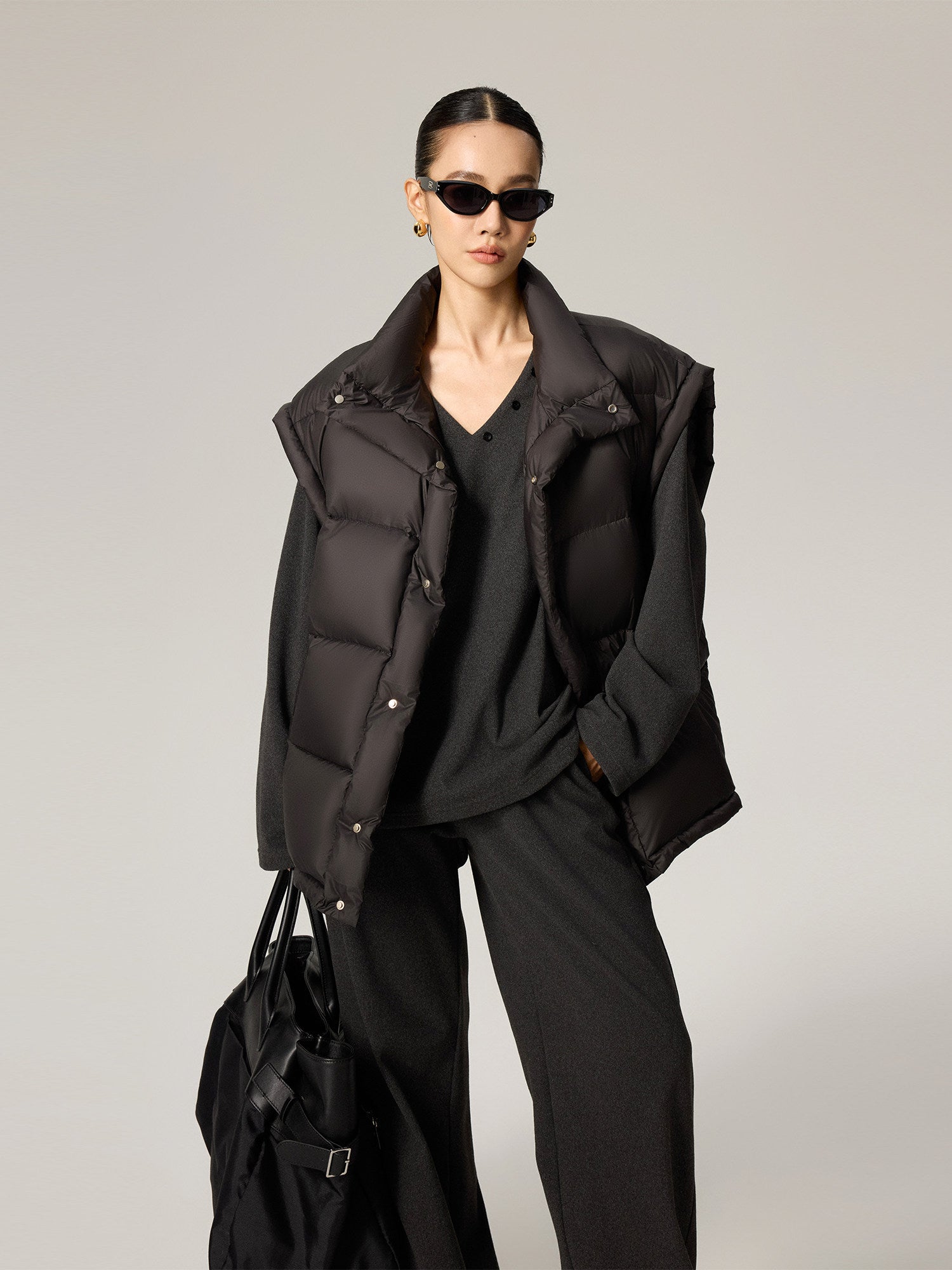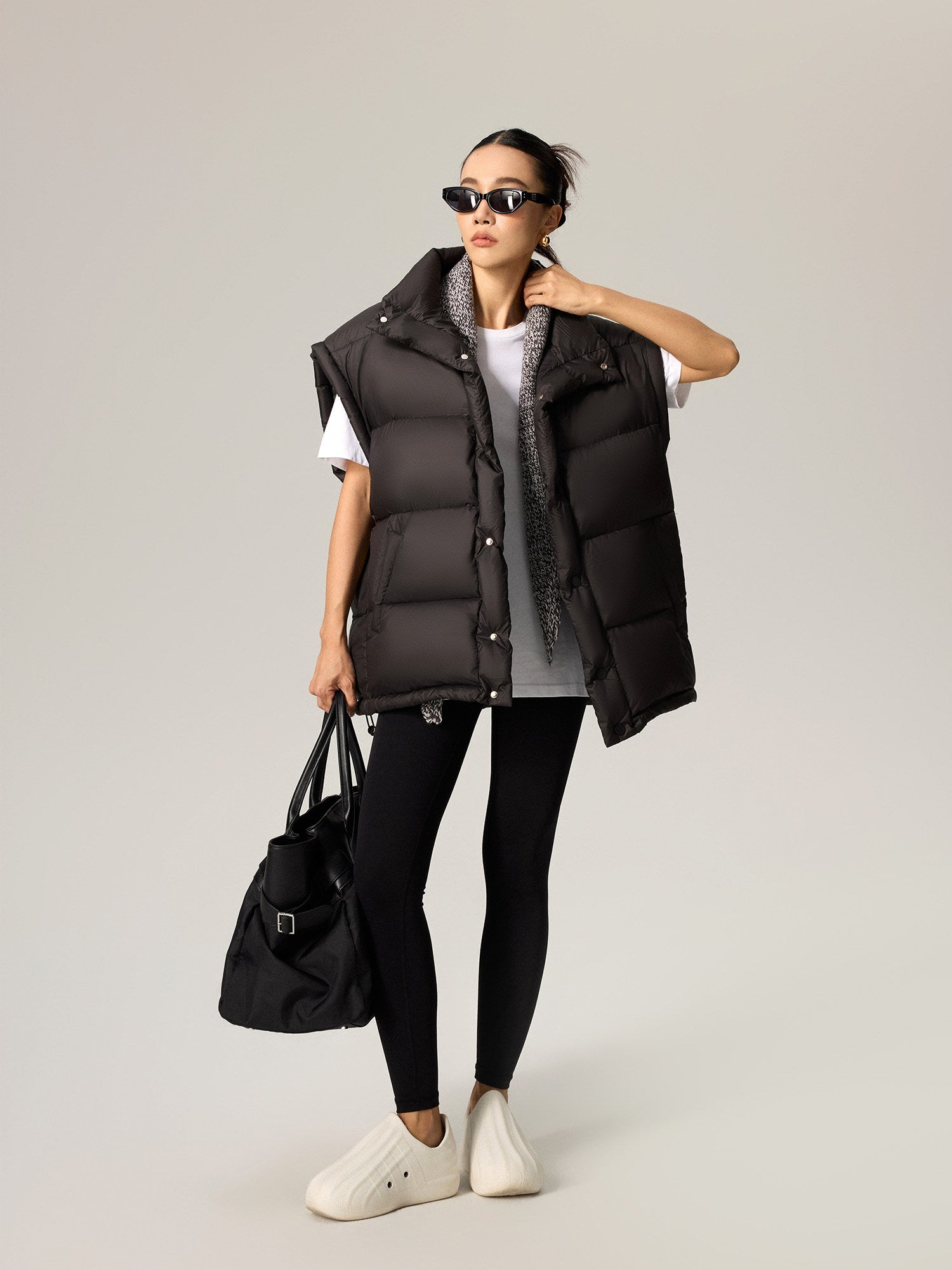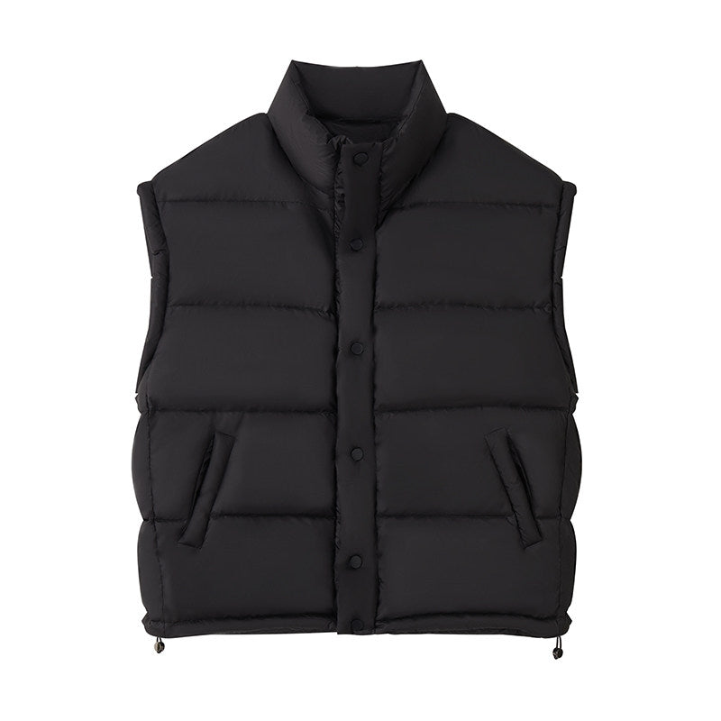 雲を纏うような“パフ”な膨らみと軽さを両立した、90%ホワイトダックダウン使用の中綿ダウンベスト。立体的に区切られたボリューム構造が身体を包み込みつつ、着膨れせずシャープなシルエットをキープします。アームホールを広めに取った設計で、スウェットやニットの上からも重ねやすく、インナー・アウター両対応。ヒップにかかる丈感で腰回りを自然にカバーし、タウンユースから移動・旅行まで幅広く活躍します。