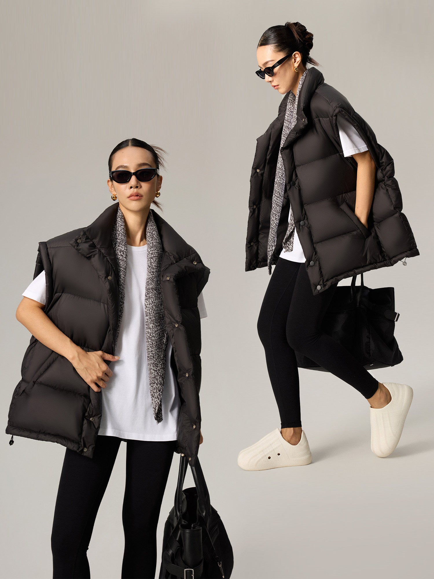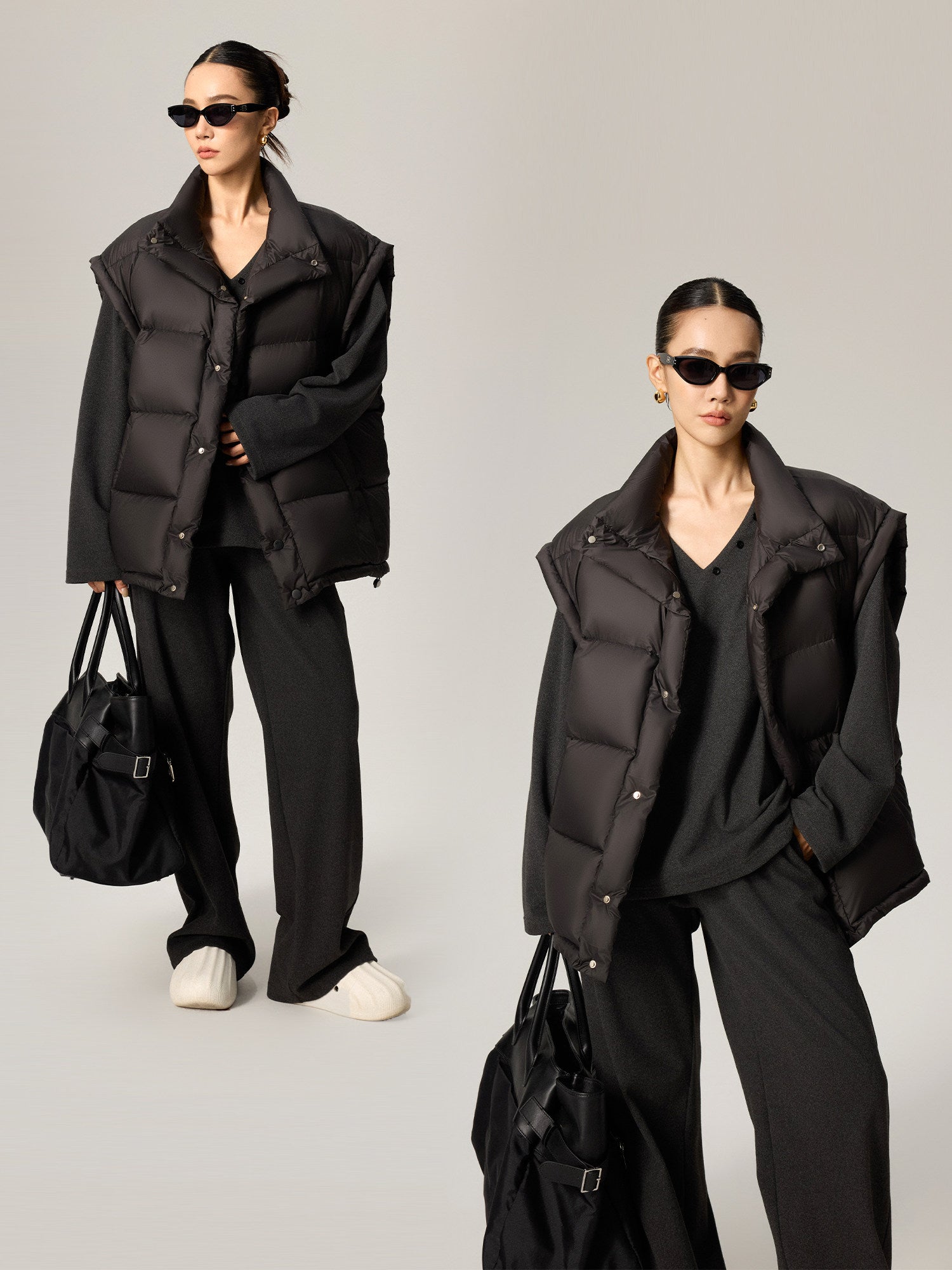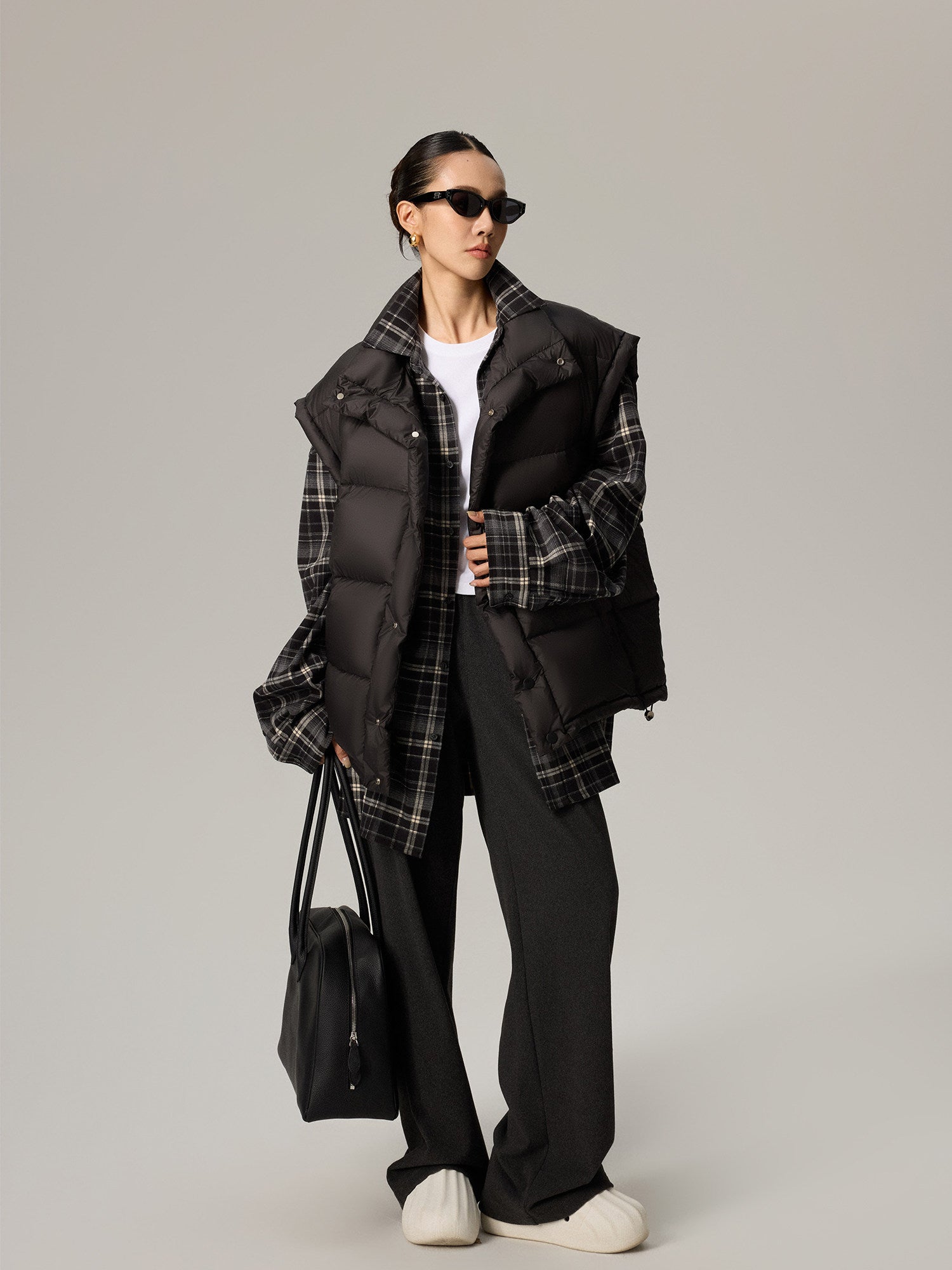 雲を纏うような“パフ”な膨らみと軽さを両立した、90%ホワイトダックダウン使用の中綿ダウンベスト。立体的に区切られたボリューム構造が身体を包み込みつつ、着膨れせずシャープなシルエットをキープします。アームホールを広めに取った設計で、スウェットやニットの上からも重ねやすく、インナー・アウター両対応。ヒップにかかる丈感で腰回りを自然にカバーし、タウンユースから移動・旅行まで幅広く活躍します。