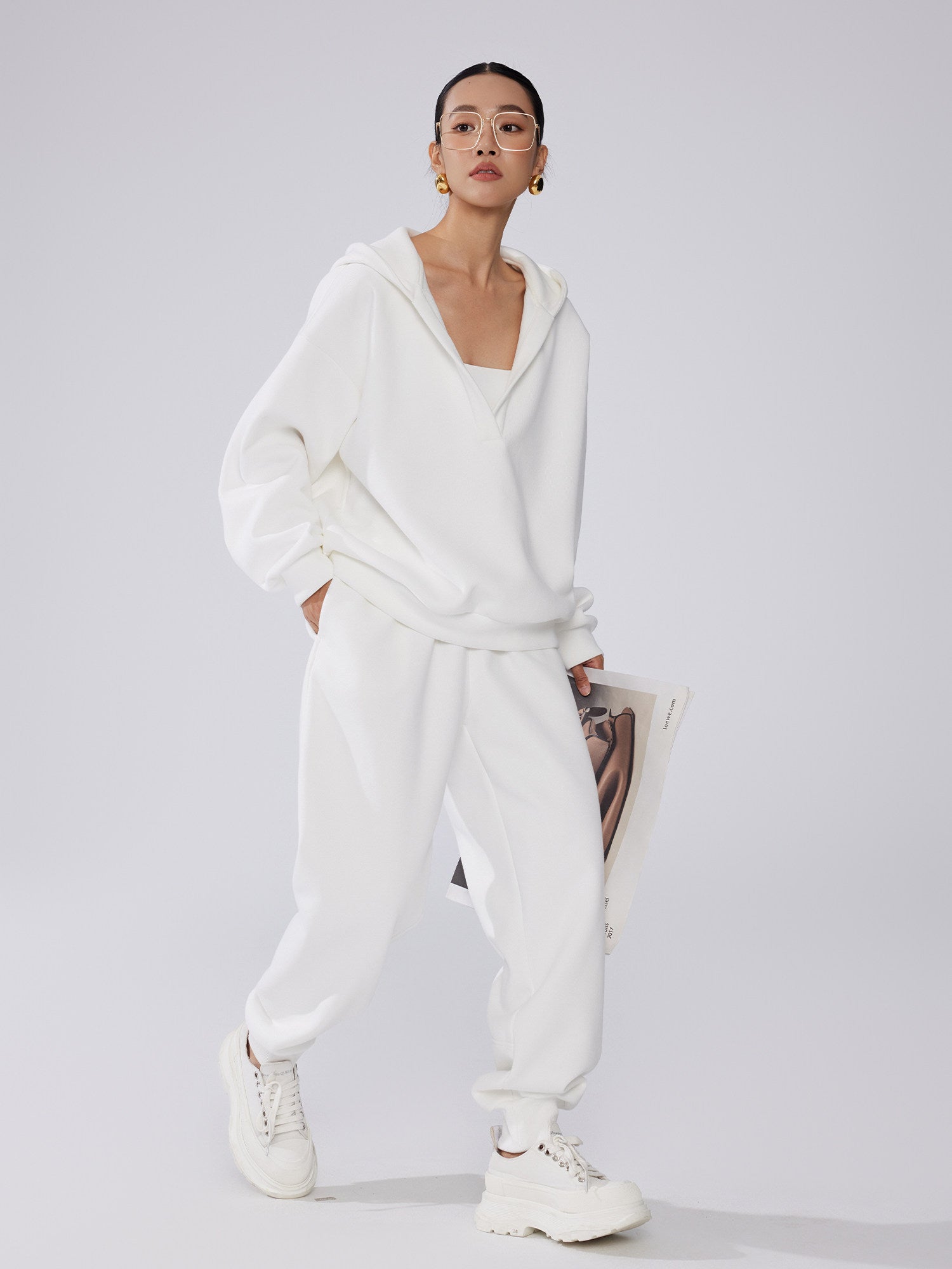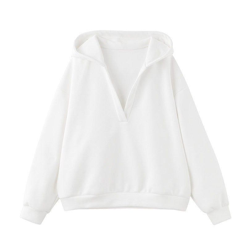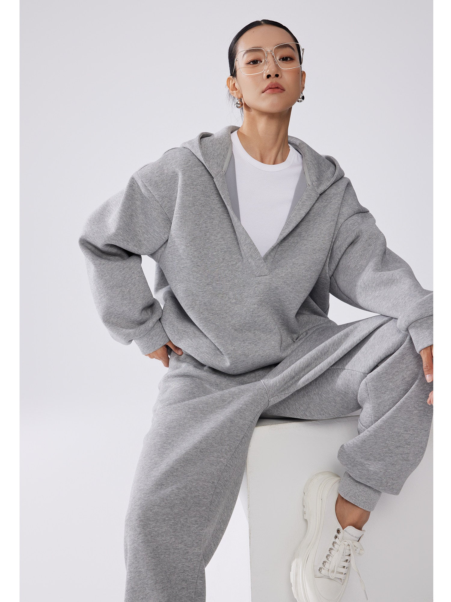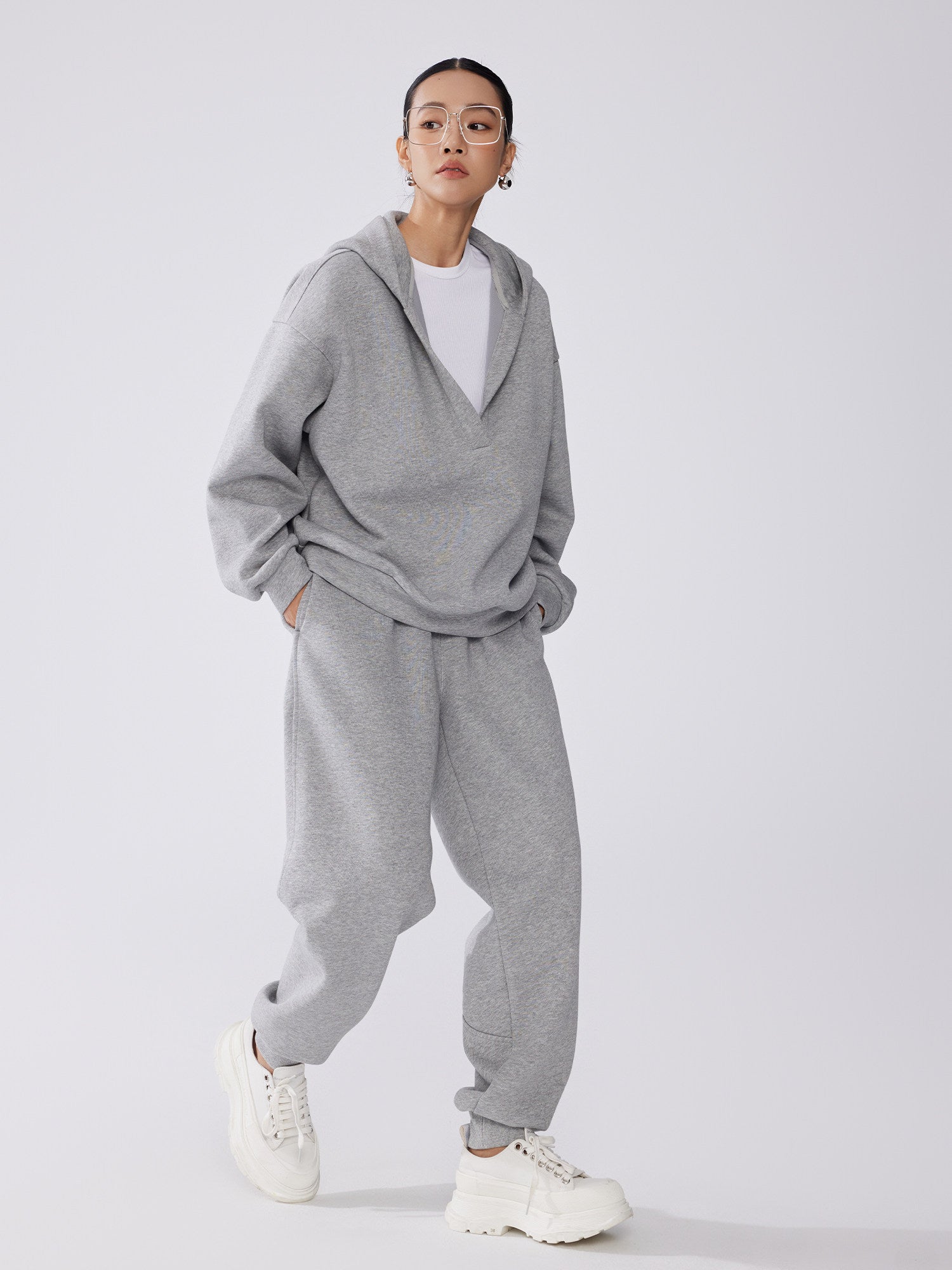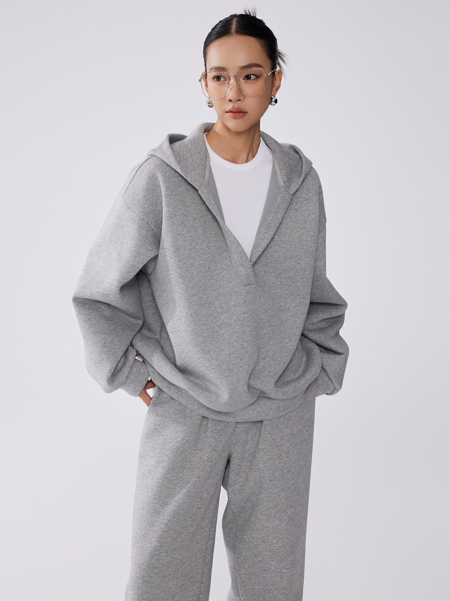 深めのVネックデザインが抜け感を演出する連帽スウェットトップスと、すっきり履ける束脚(ジョガー)パンツを組み合わせたリラックスセットアップ。ゆったりとしたシルエットながら縦ラインを意識した設計で、体型を拾いにくく大人のカジュアルスタイルに最適。上下別々でも着回しやすく、デイリーからワンマイルまで幅広く活躍。