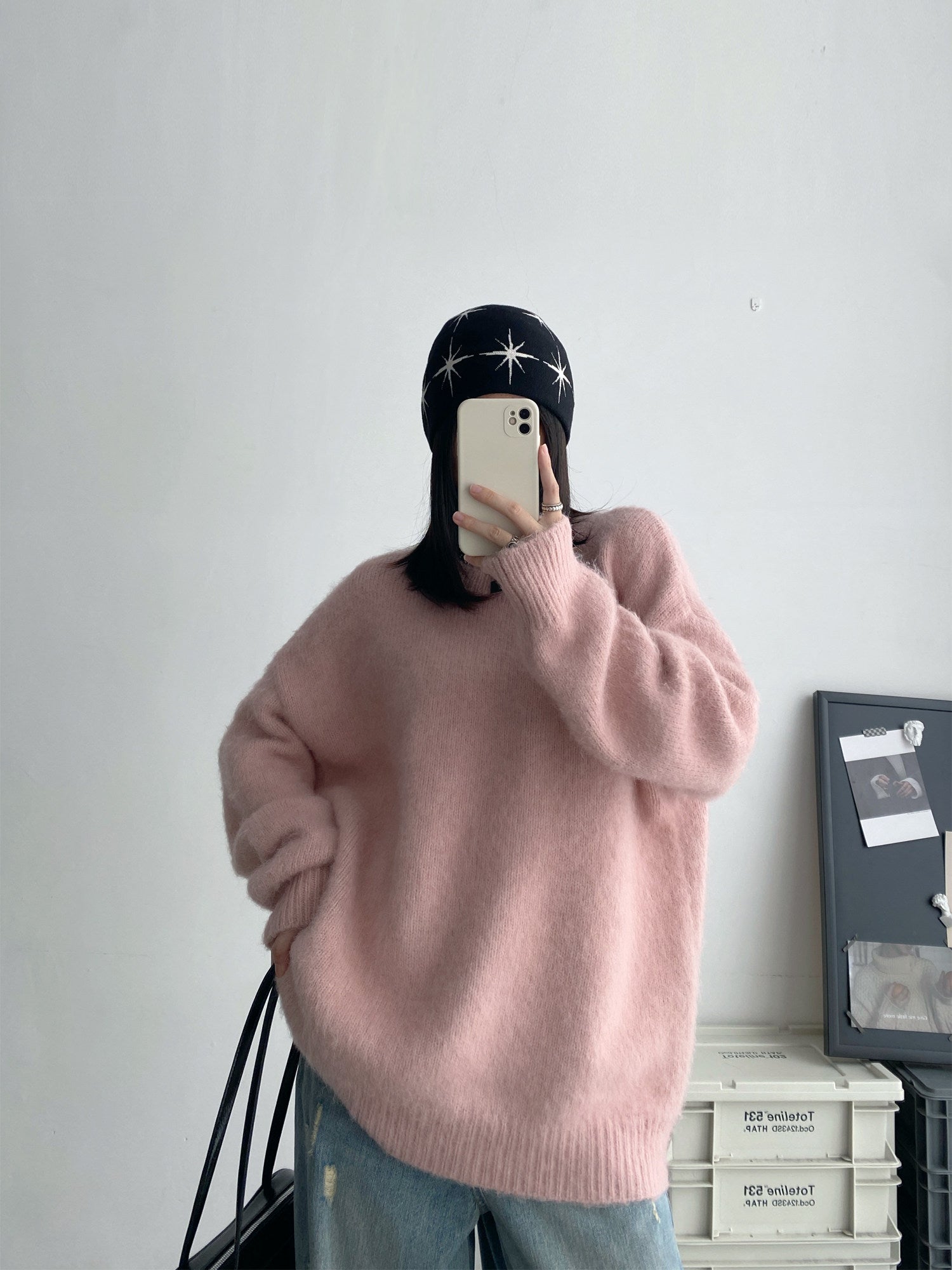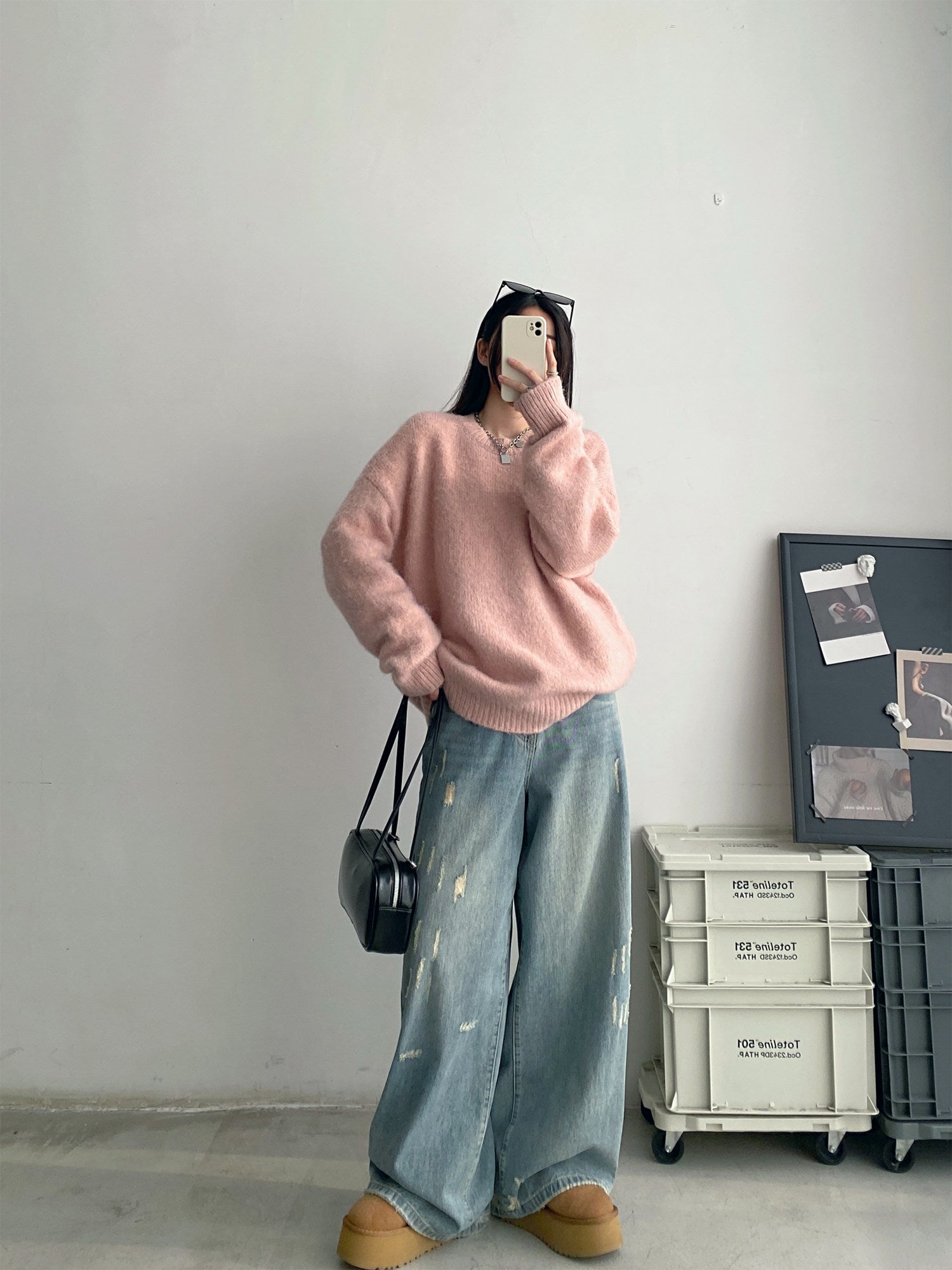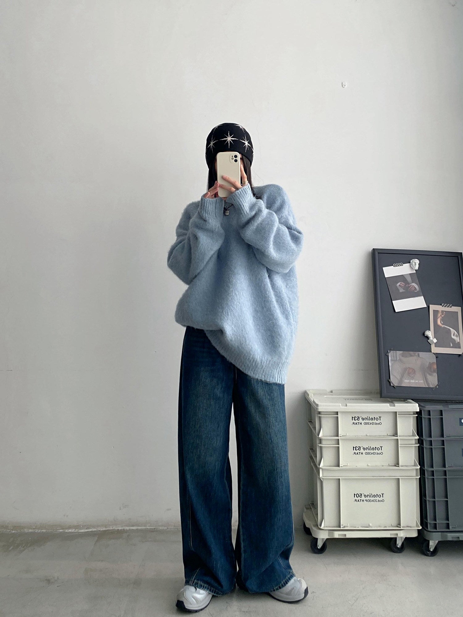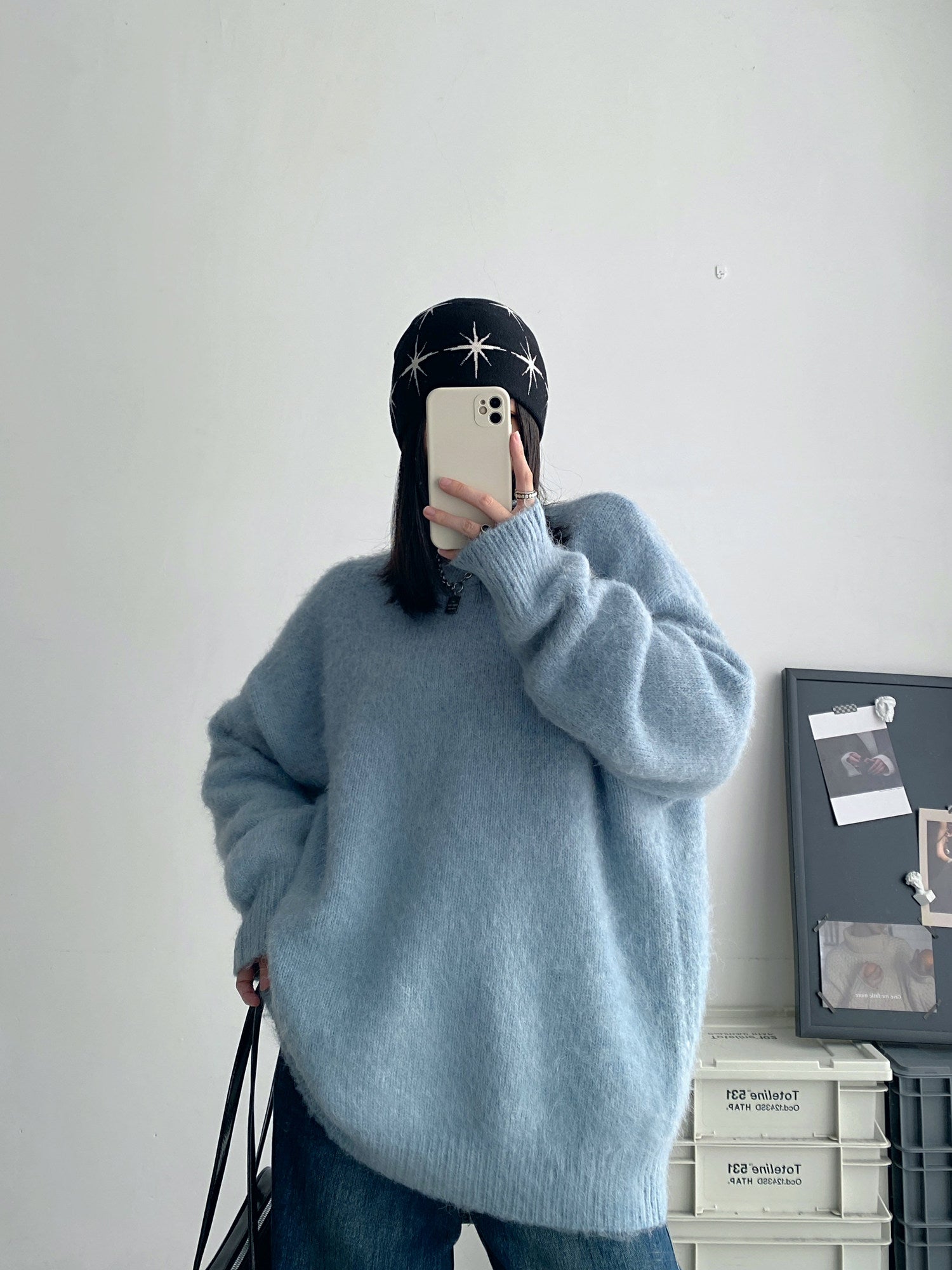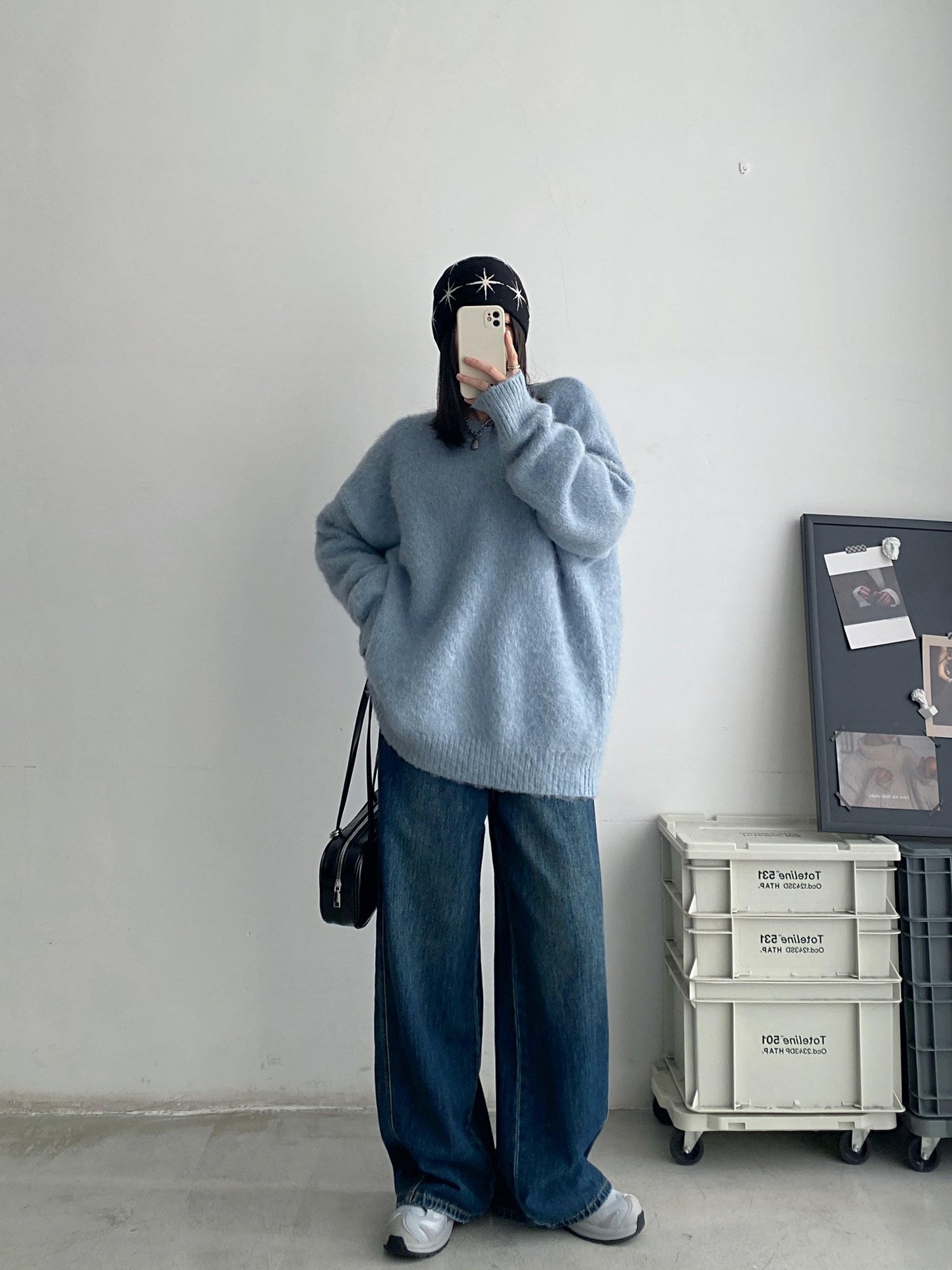 軽くてふんわりとした起毛感のある素材を使用した、リラックスシルエットのクルーネックニット。肩を落としたオーバーサイズ設計で体型を選ばず、自然に抜け感を演出。デニムやワイドパンツと相性が良く、秋冬のデイリーコーデに取り入れやすい一枚。