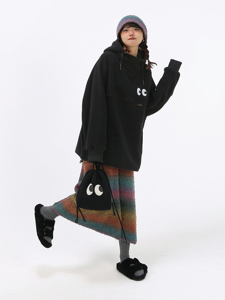 ワイドシルエット フリース裏起毛フーディ(ブラック)(AVN056)