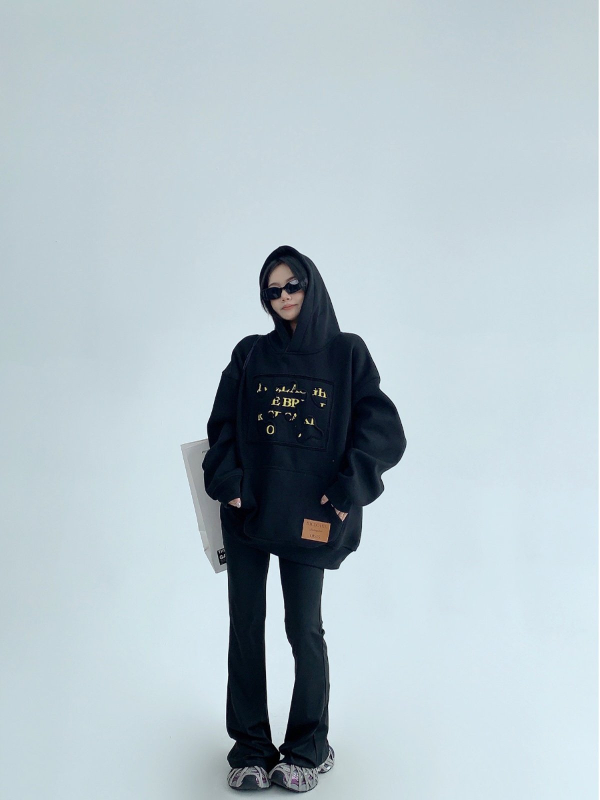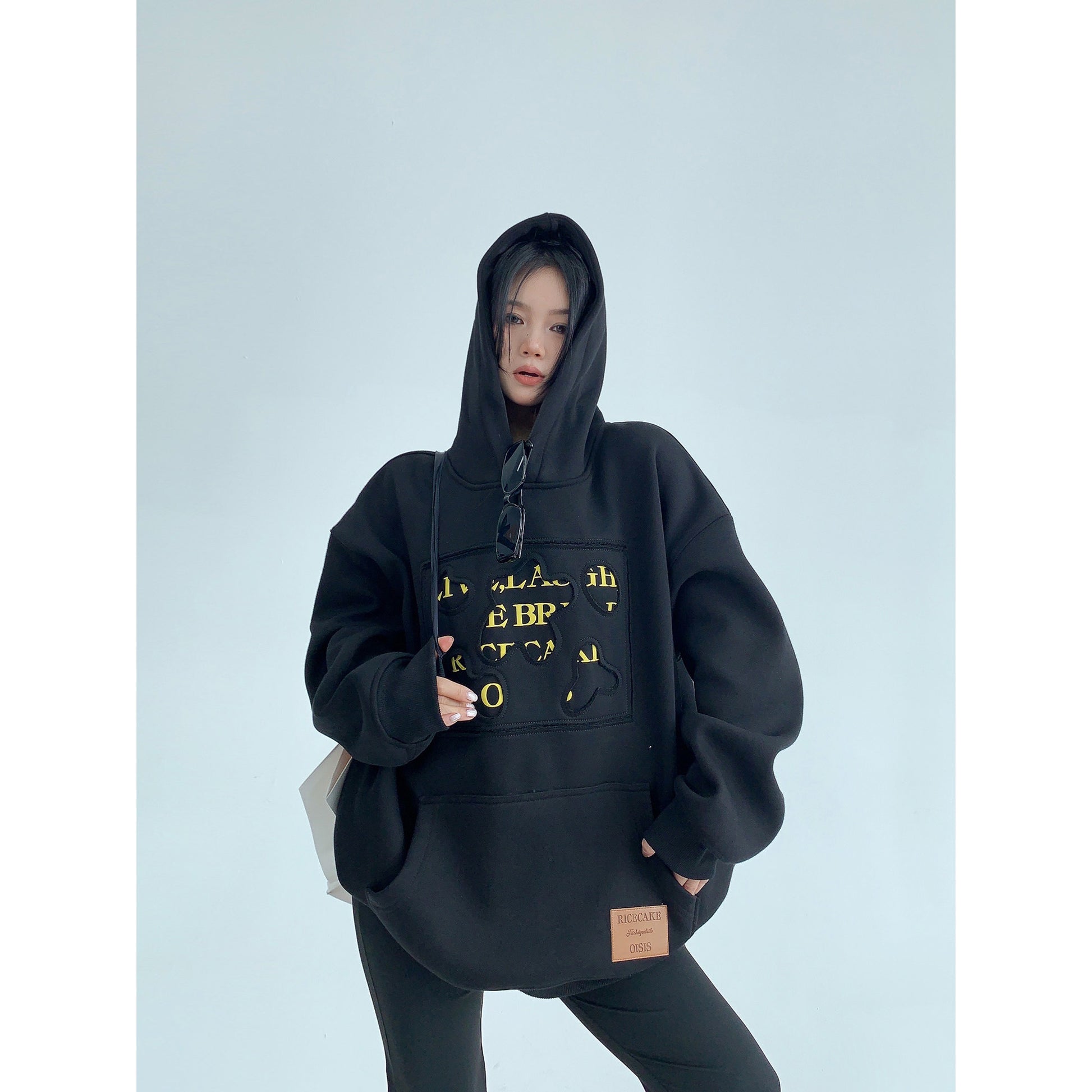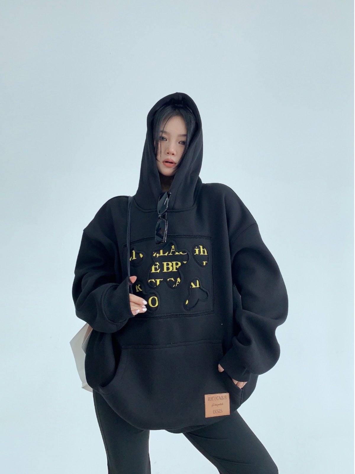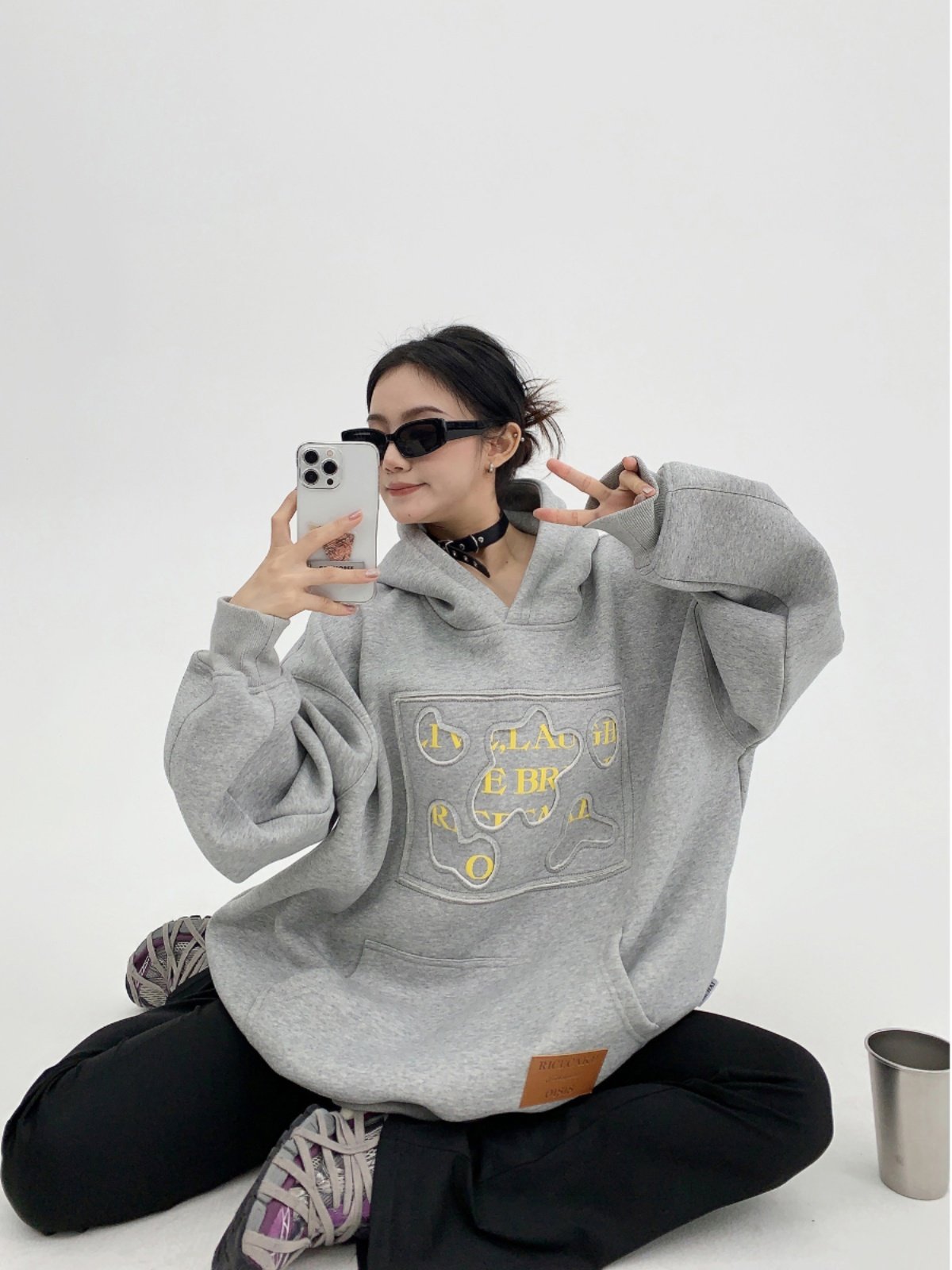 フロントに貼布デザインとダメージ風刺繍を施した、韓国系テイストの裏起毛フーディ。加厚仕様で保温性が高く、ゆったりとしたオーバーサイズシルエット。ストリートからカジュアルまで幅広く対応し、ユニセックスで着用可能。
