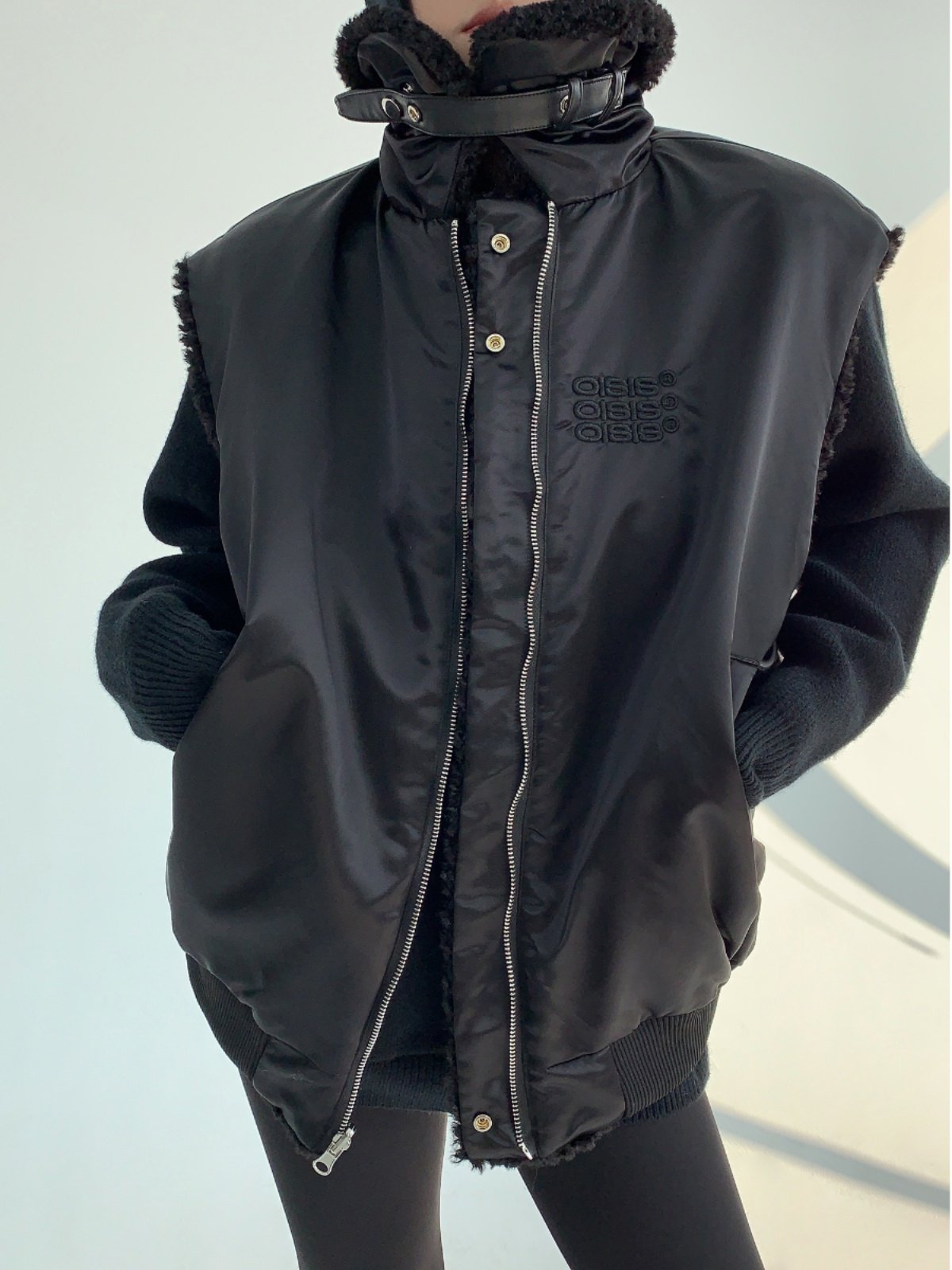 刺繍入り 双面着用 ボア中綿ベスト(ブラック)(AVN067)