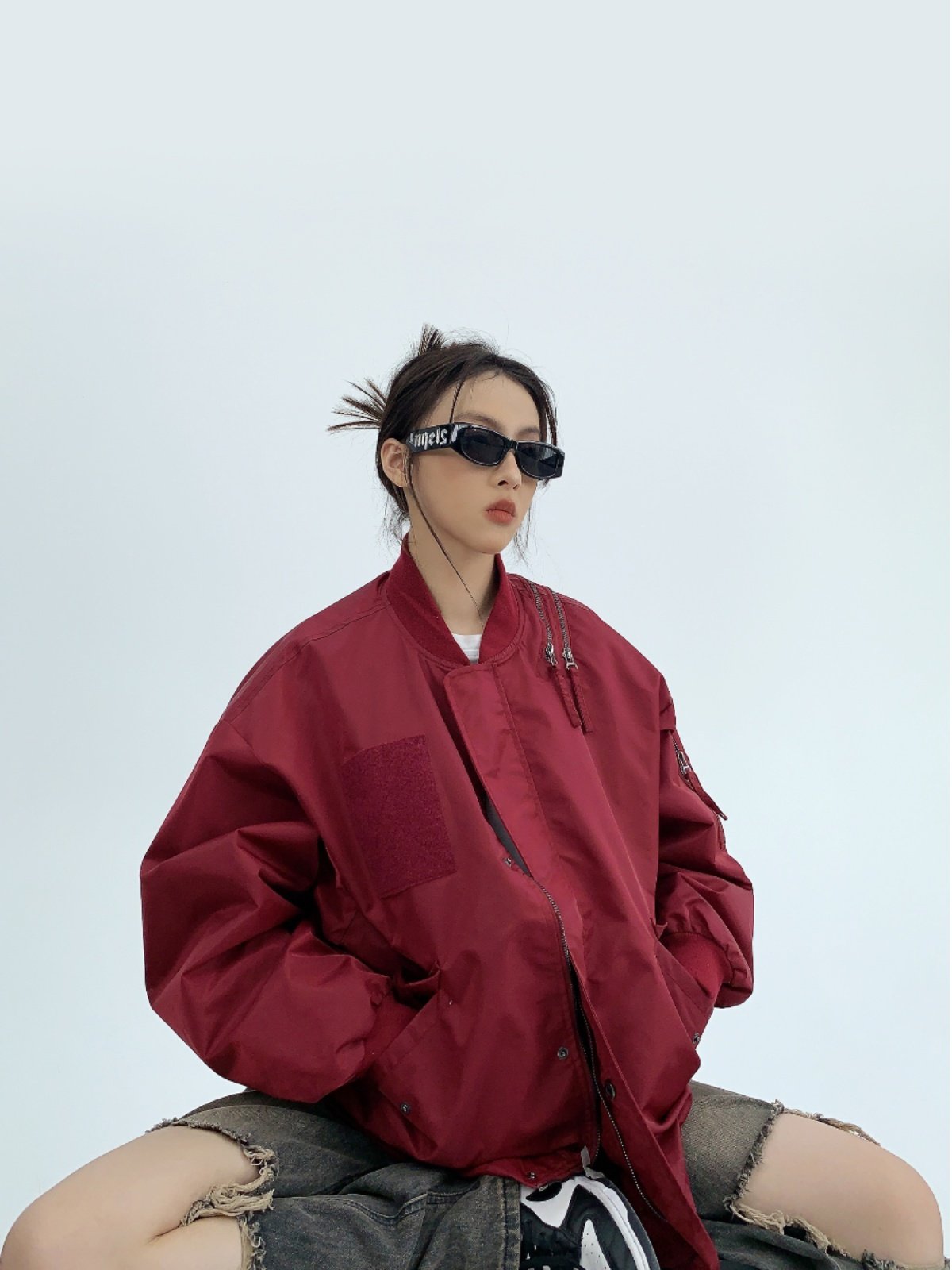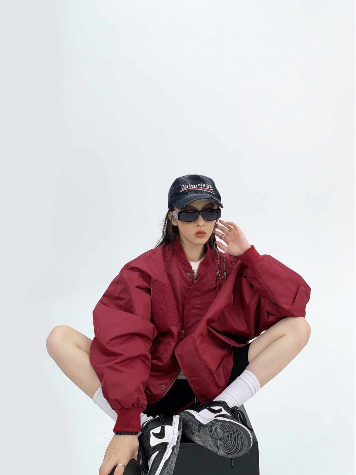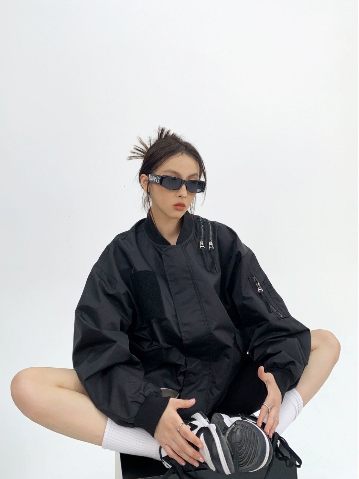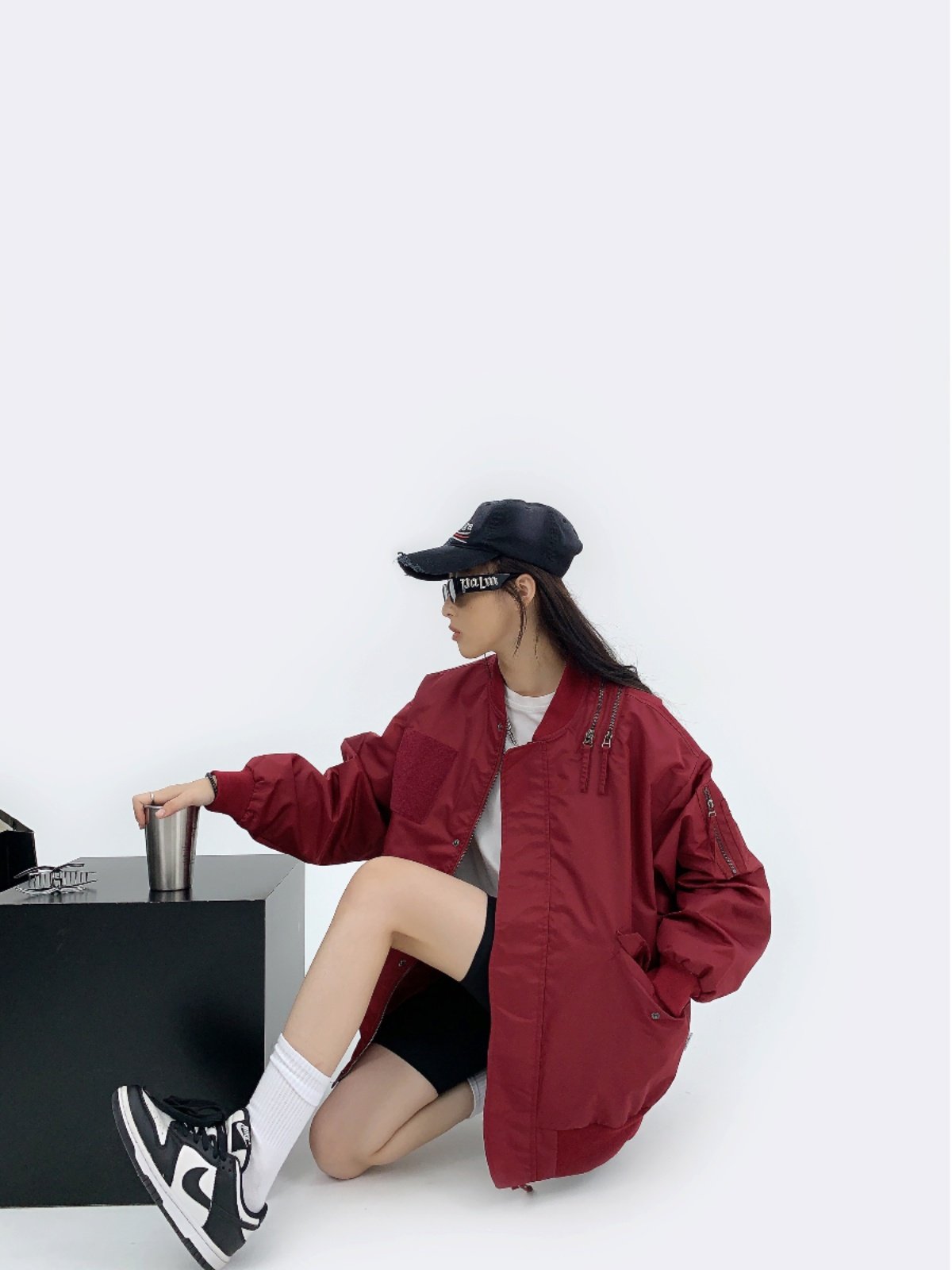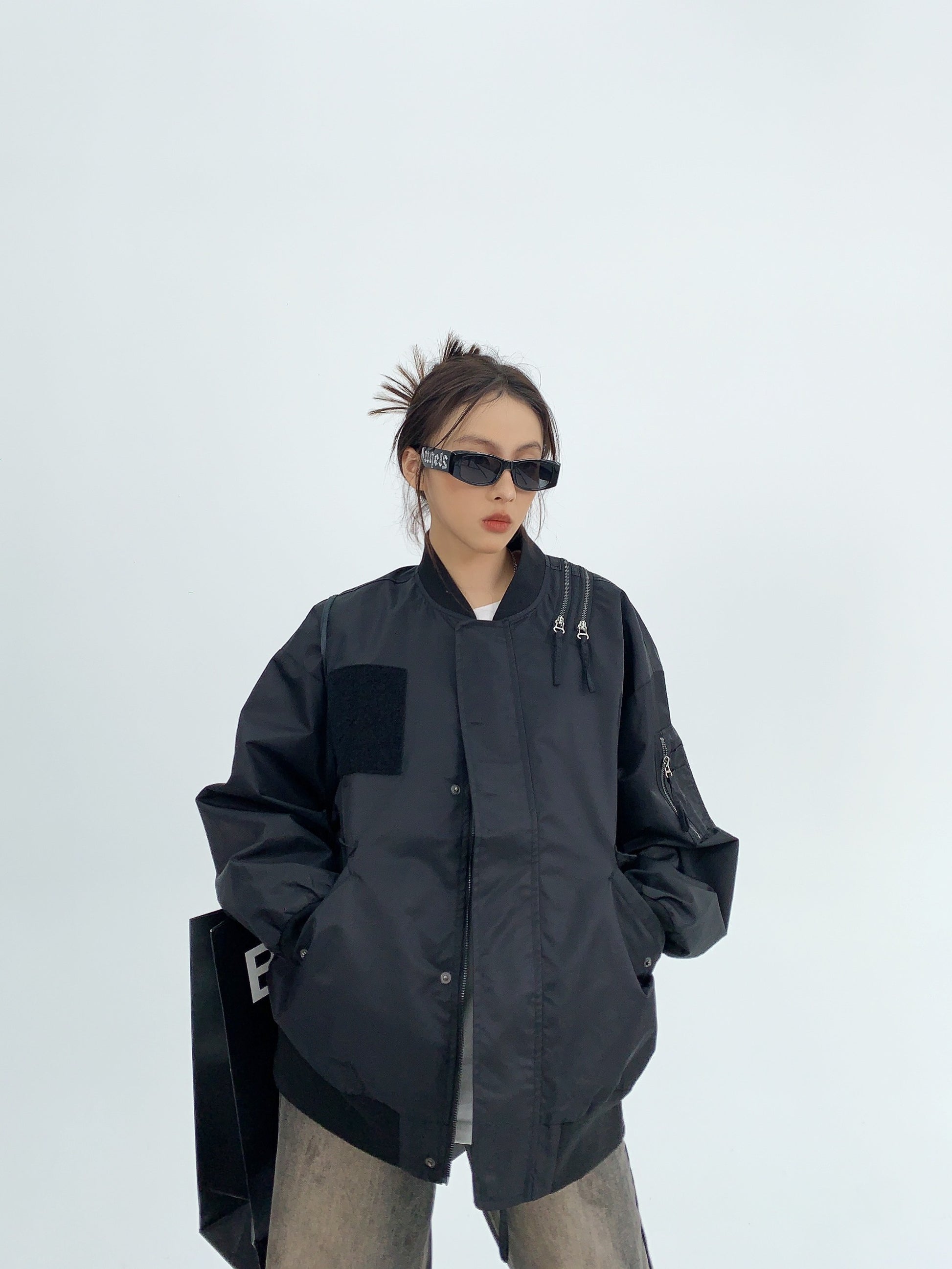 美式テイストの廓形シルエットが特徴のジップアップボンバージャケット。小众デザインで存在感があり、軽めの中綿入りで秋〜初冬まで活躍。リラックス感のあるオーバーサイズ設計でユニセックス対応。
