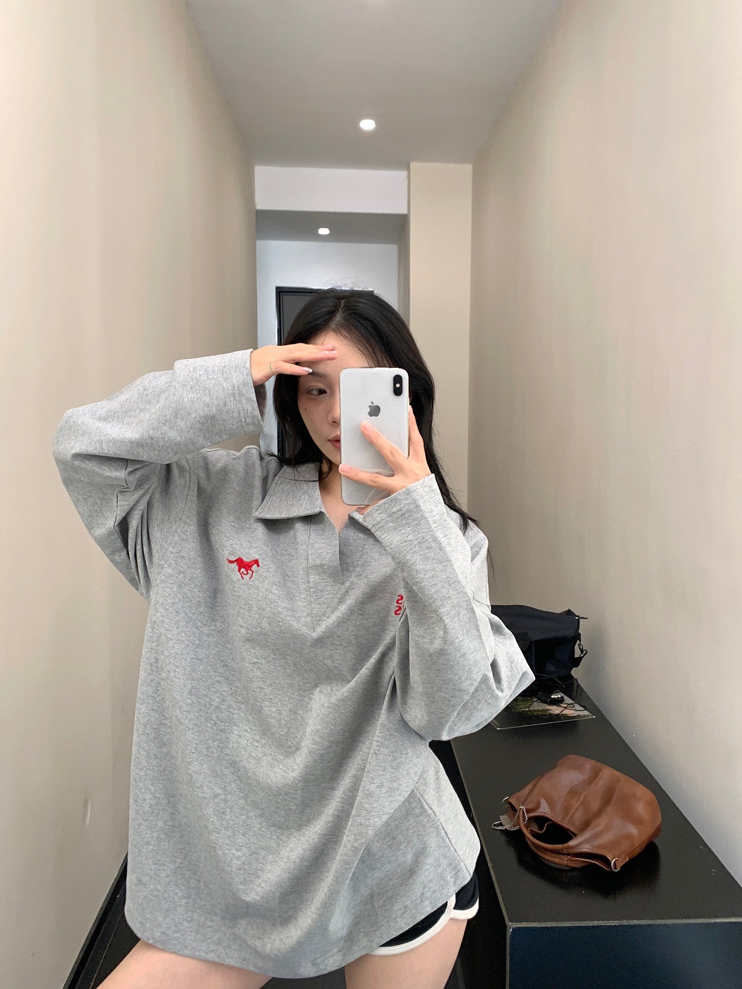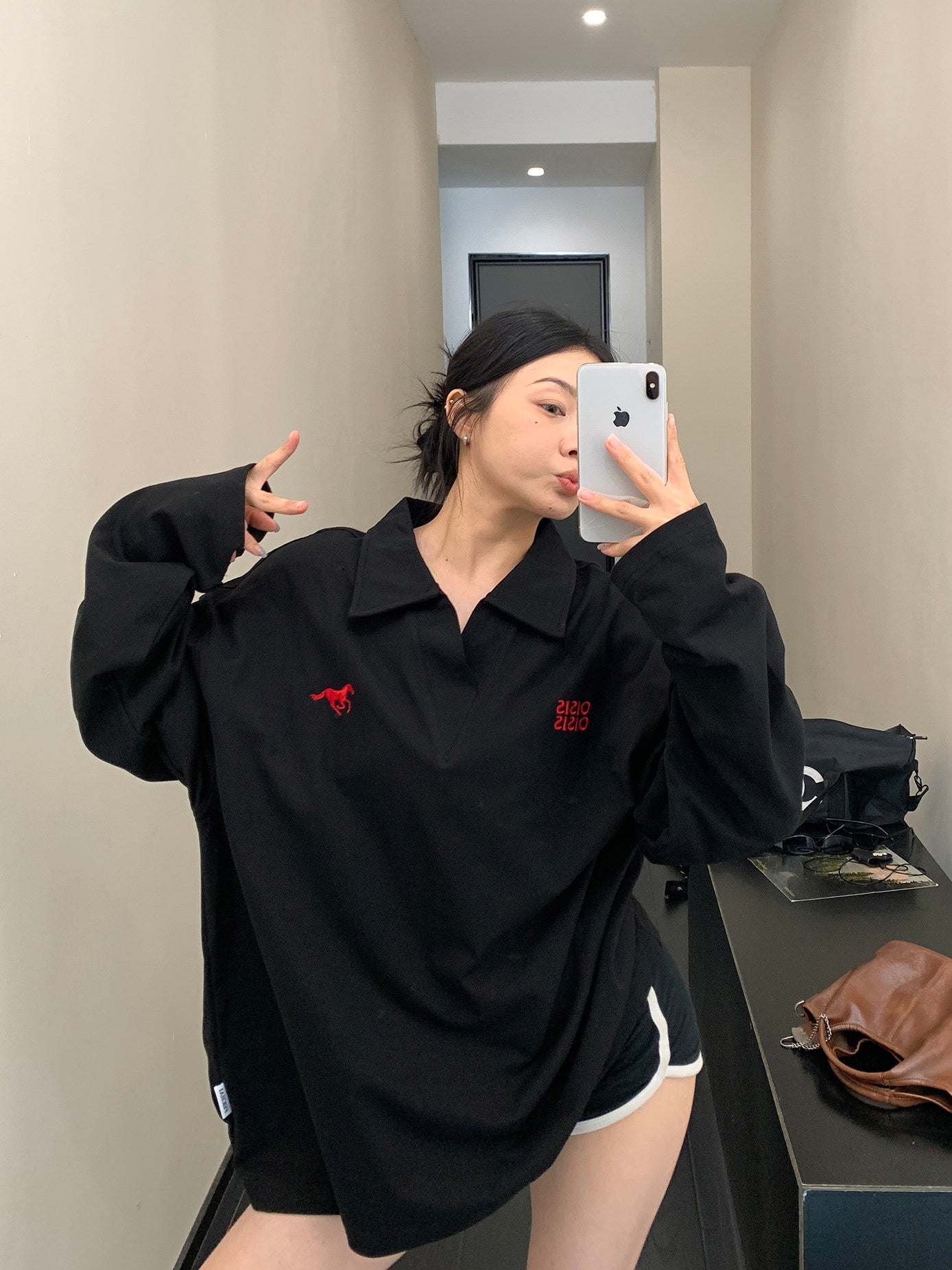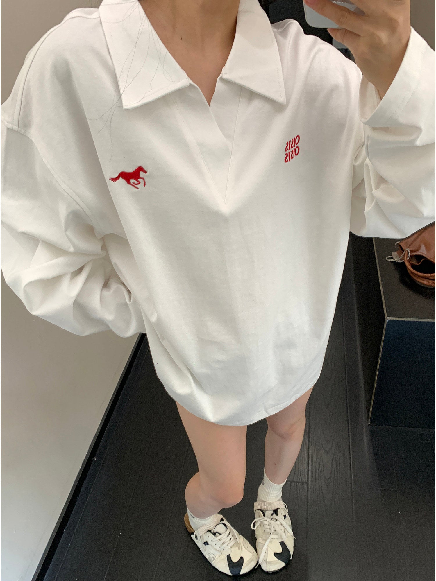 美式Vネック 刺繍入り コットン長袖Tシャツ(オーバーサイズ)(AVN072)