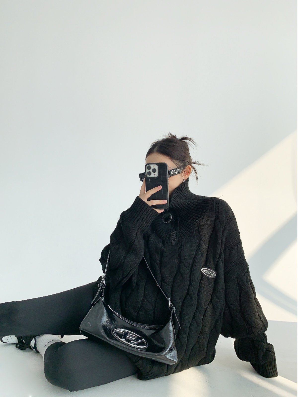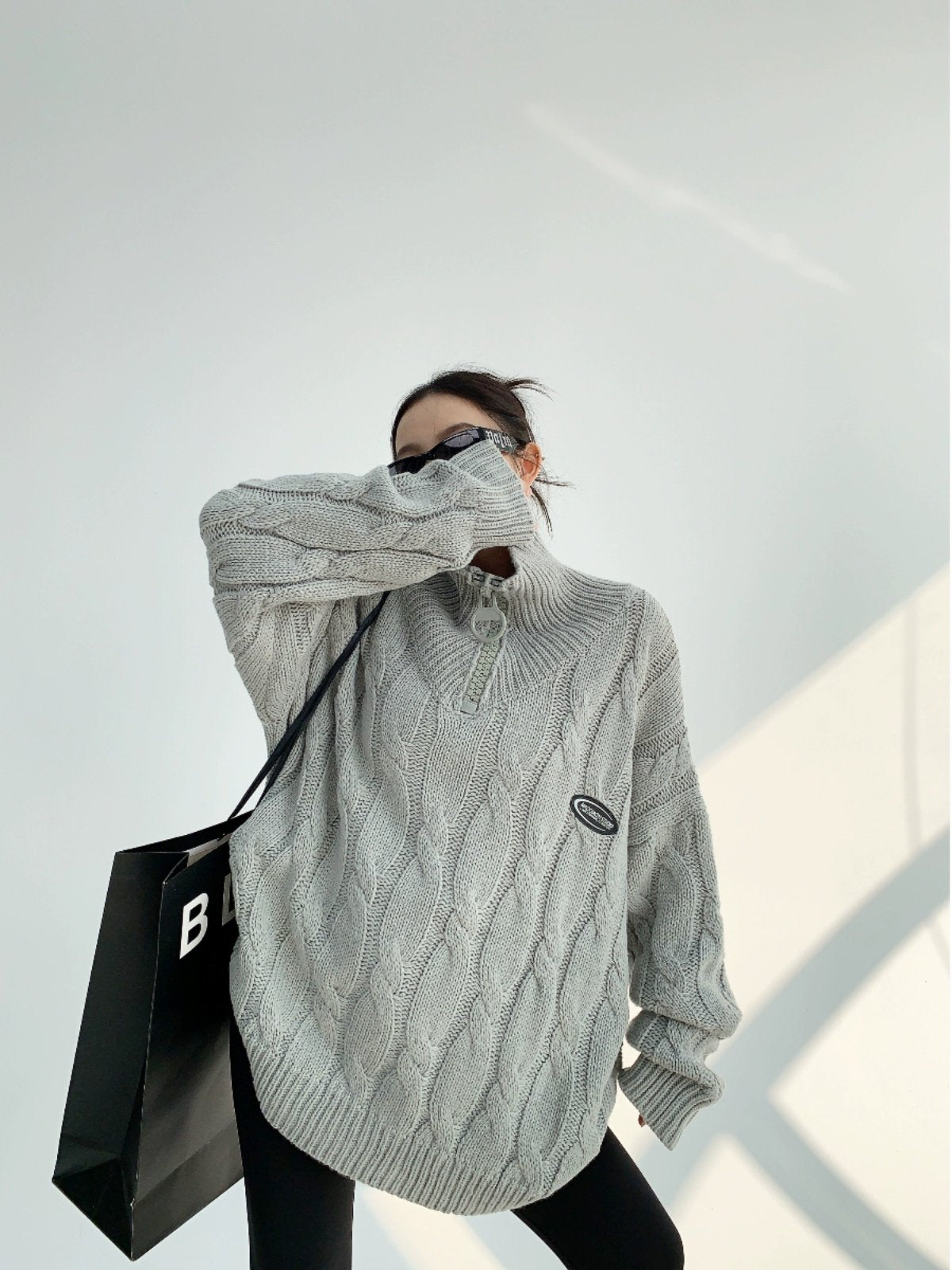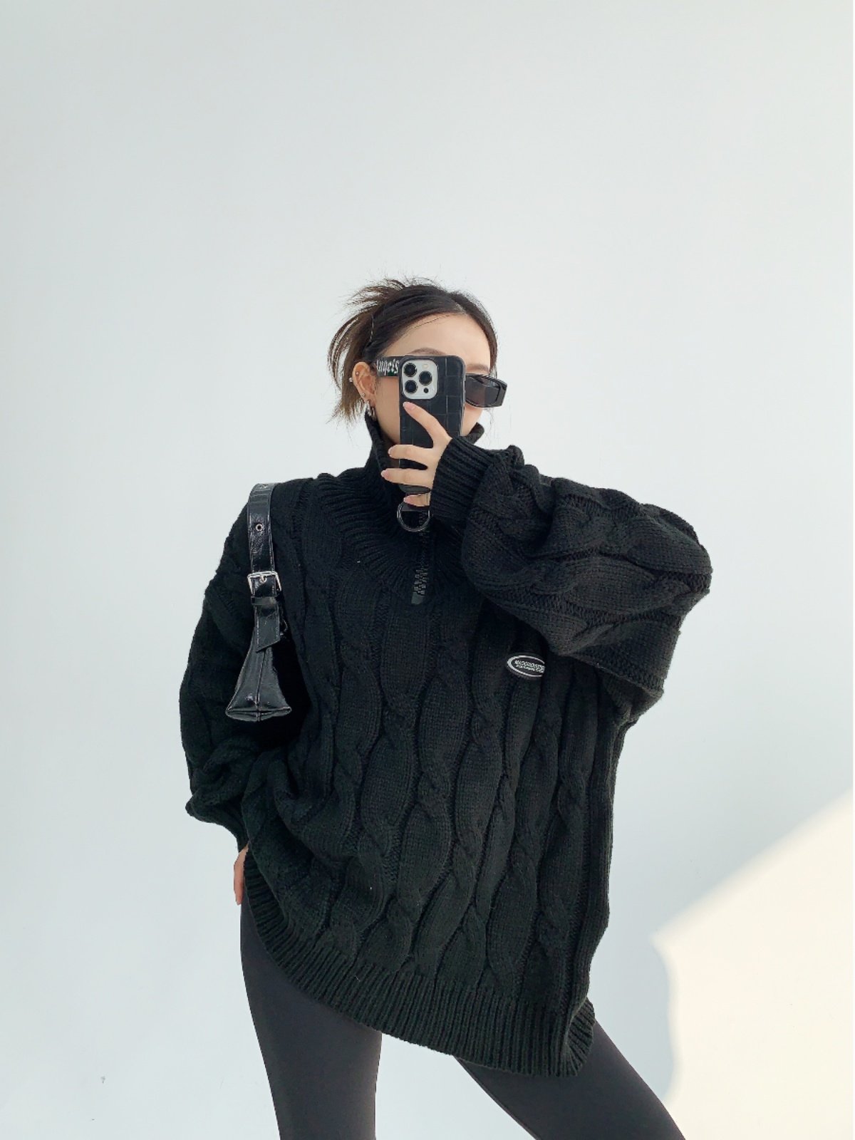 厚手の加厚ニット素材を使用した、立ち襟ハーフジップデザインのプルオーバー。ゆったりとしたオーバーサイズで、秋冬の主役トップスとして活躍。