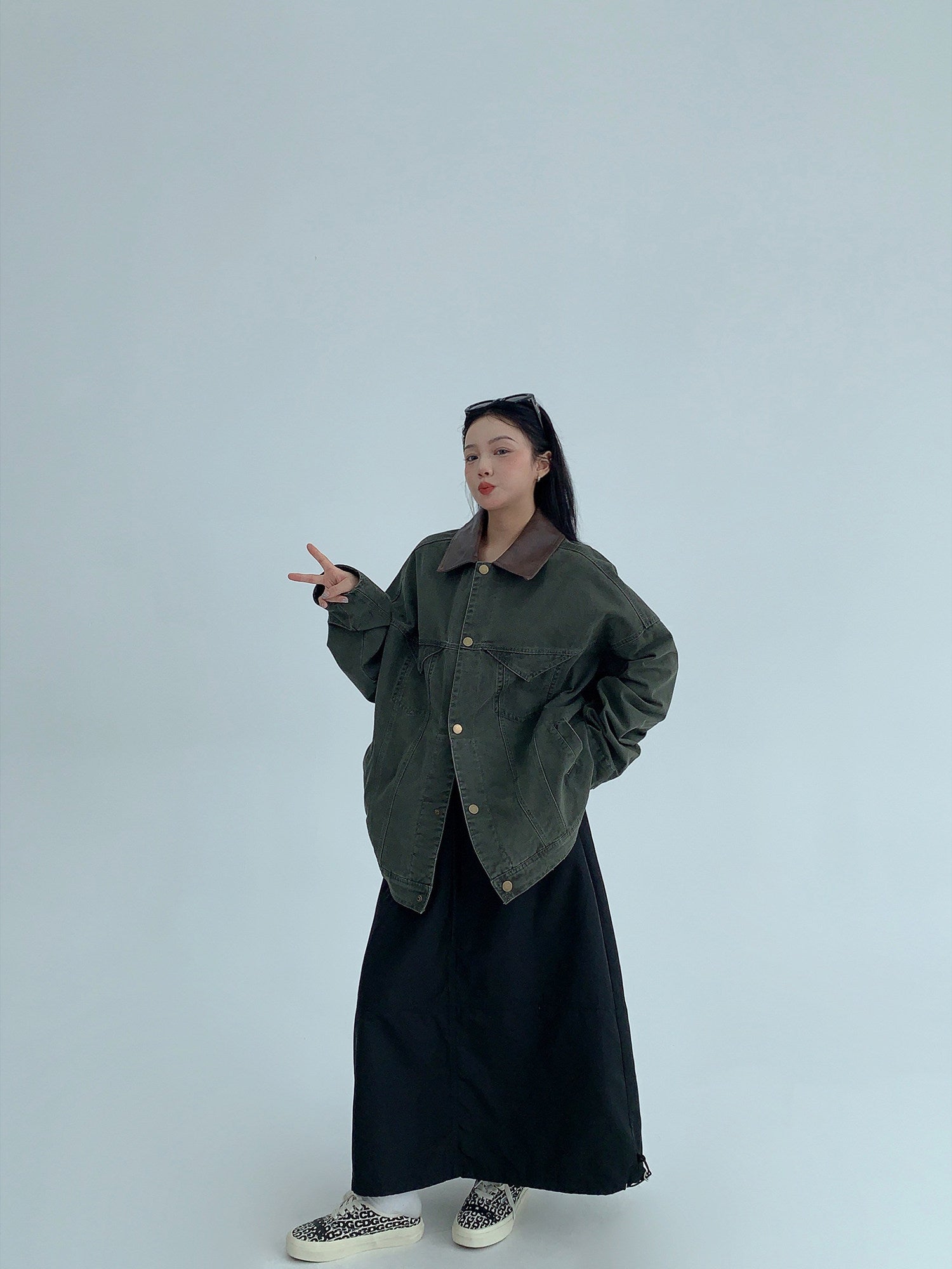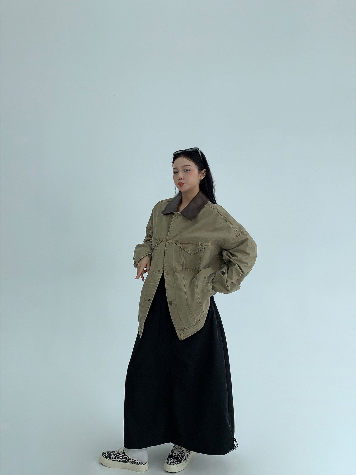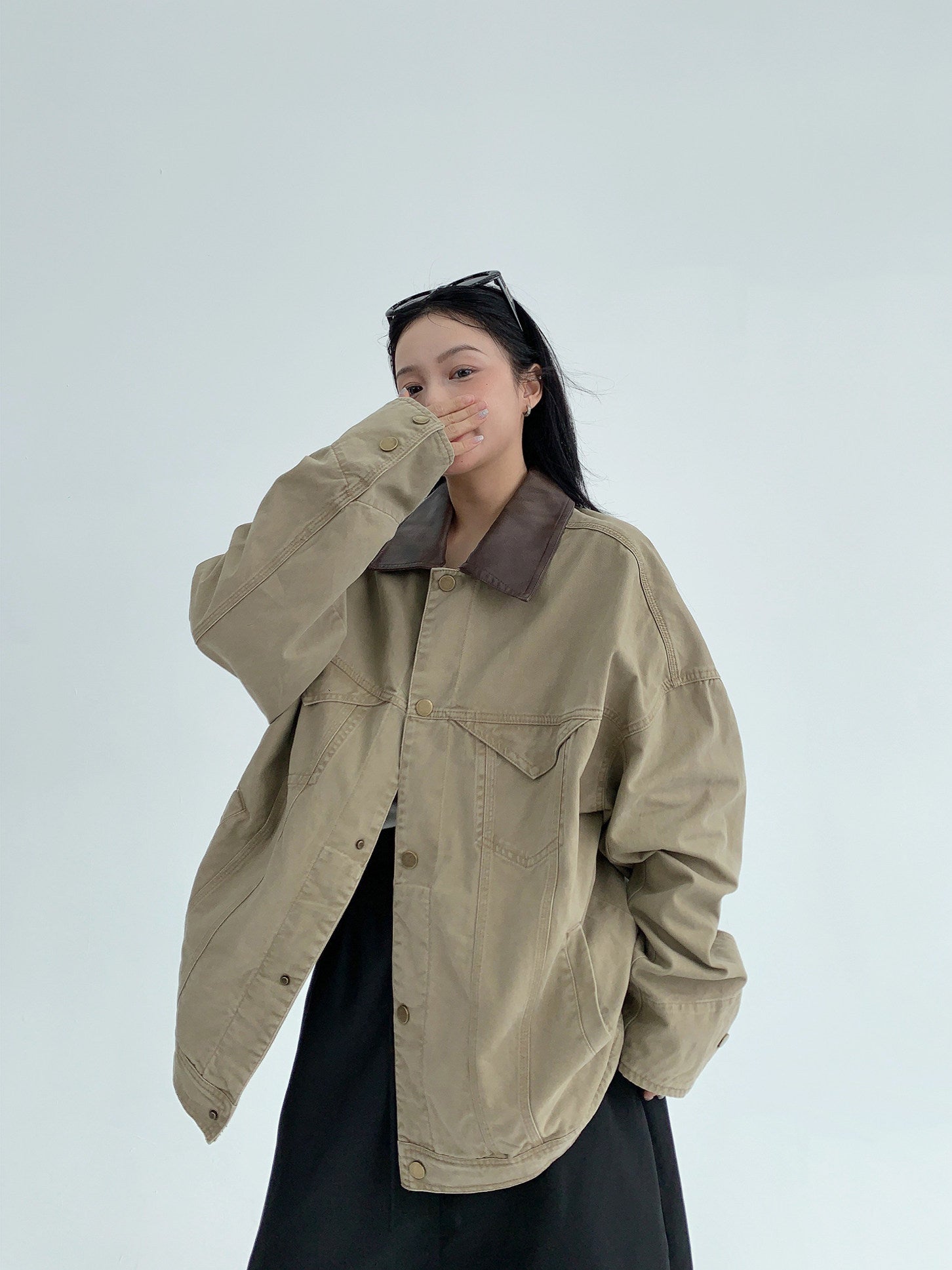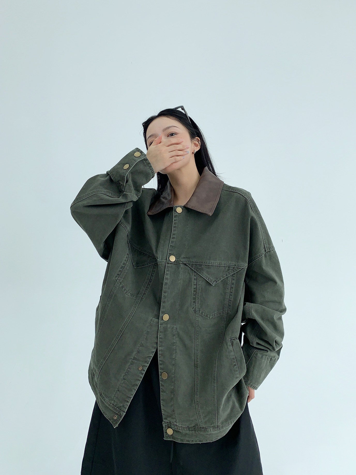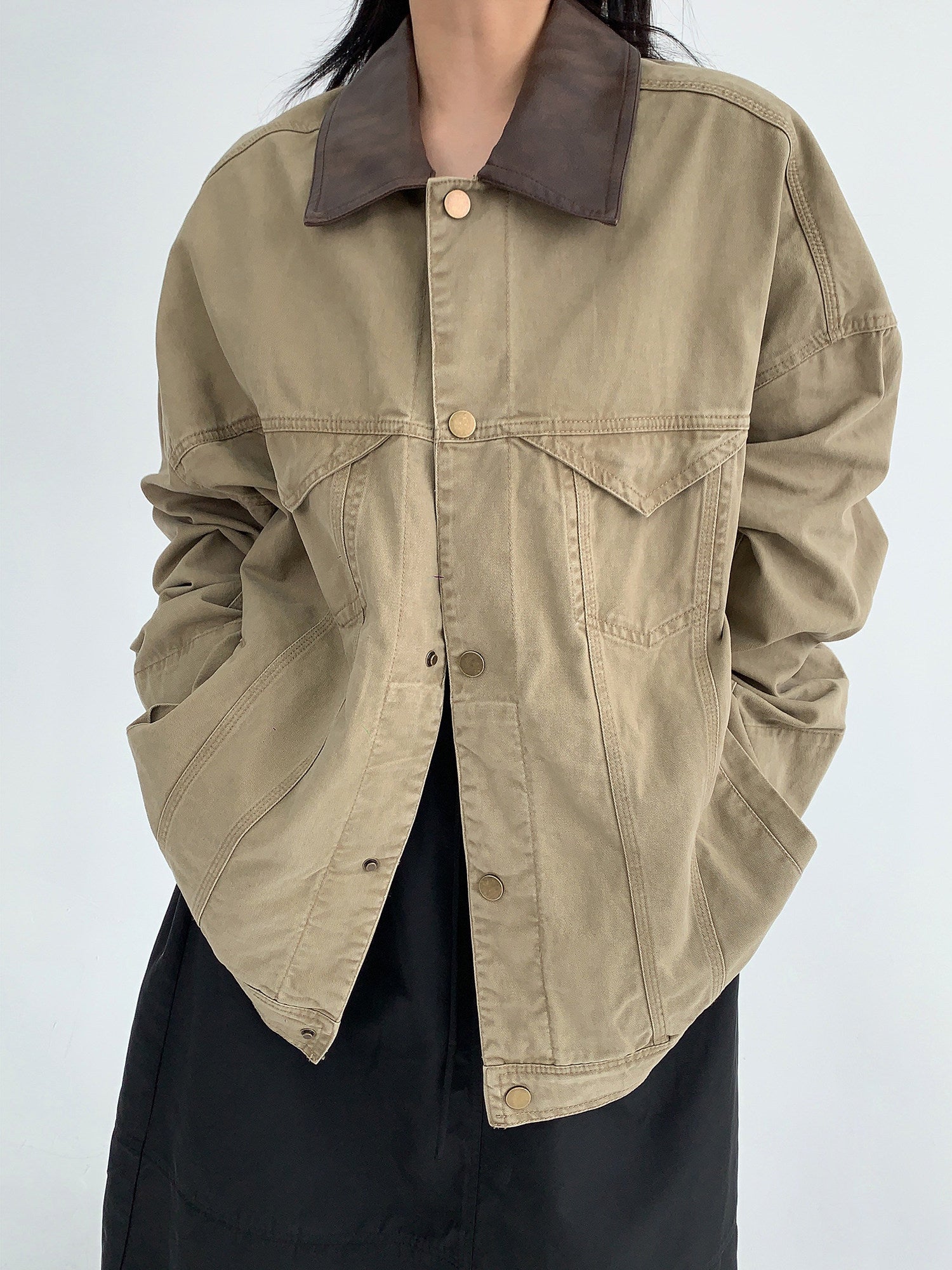 ヴィンテージ加工を施したデニム素材にPUレザー切替襟を組み合わせた、バーン風デザインのオーバーサイズジャケット。程よい厚みで秋冬の羽織に最適。ユニセックス対応。