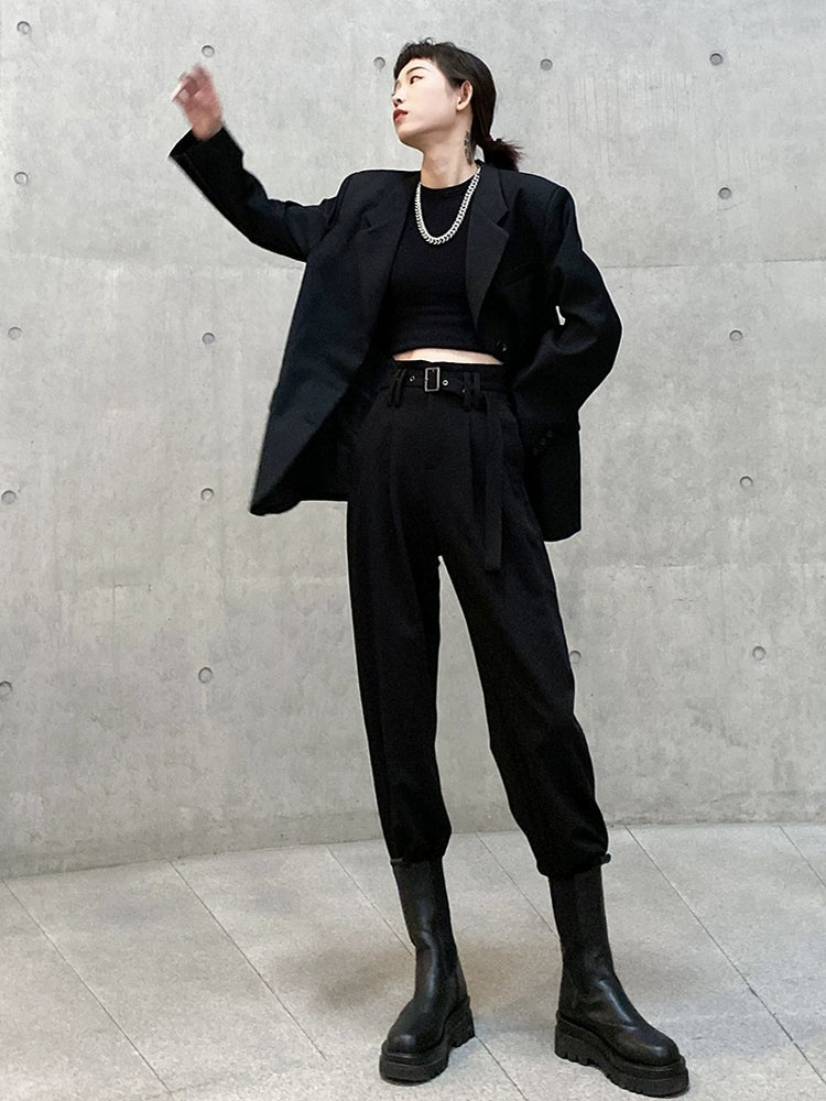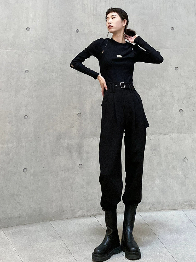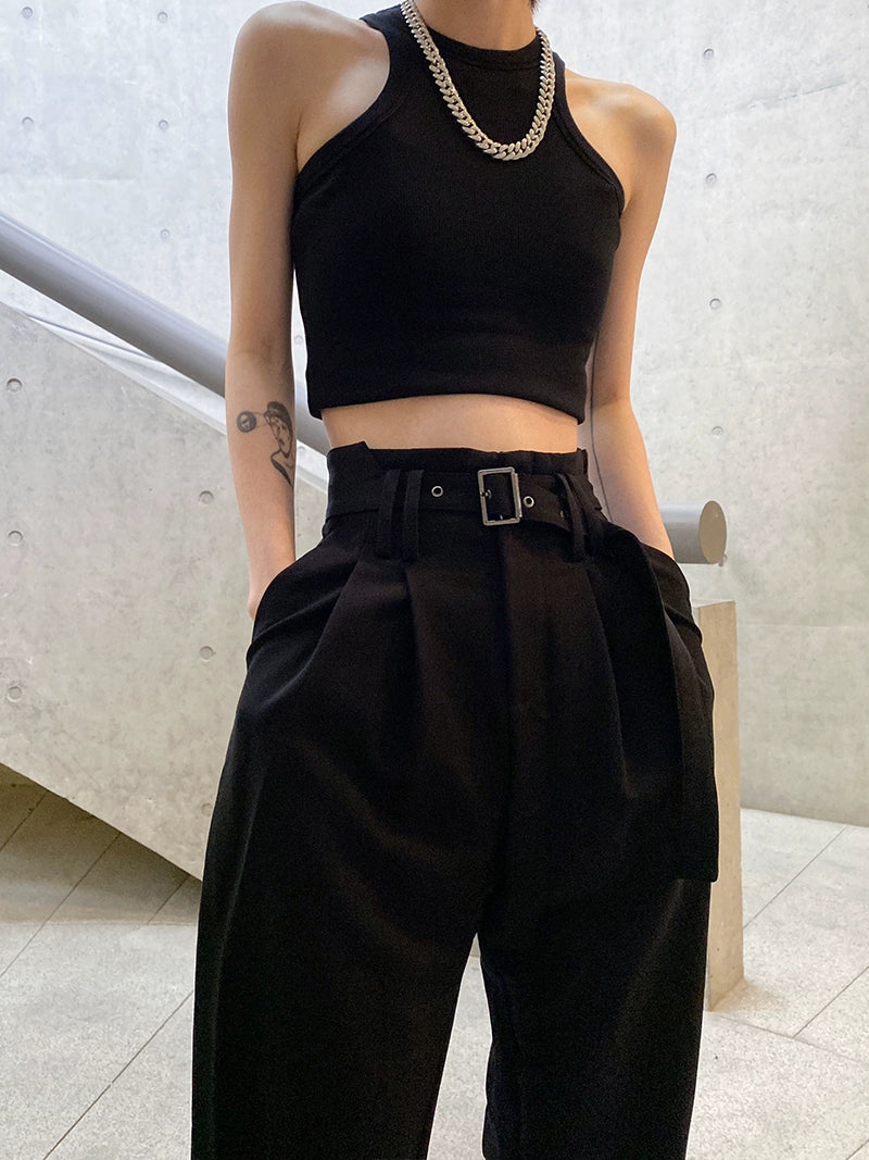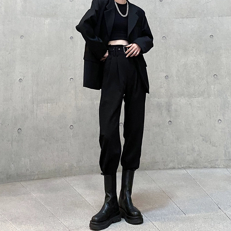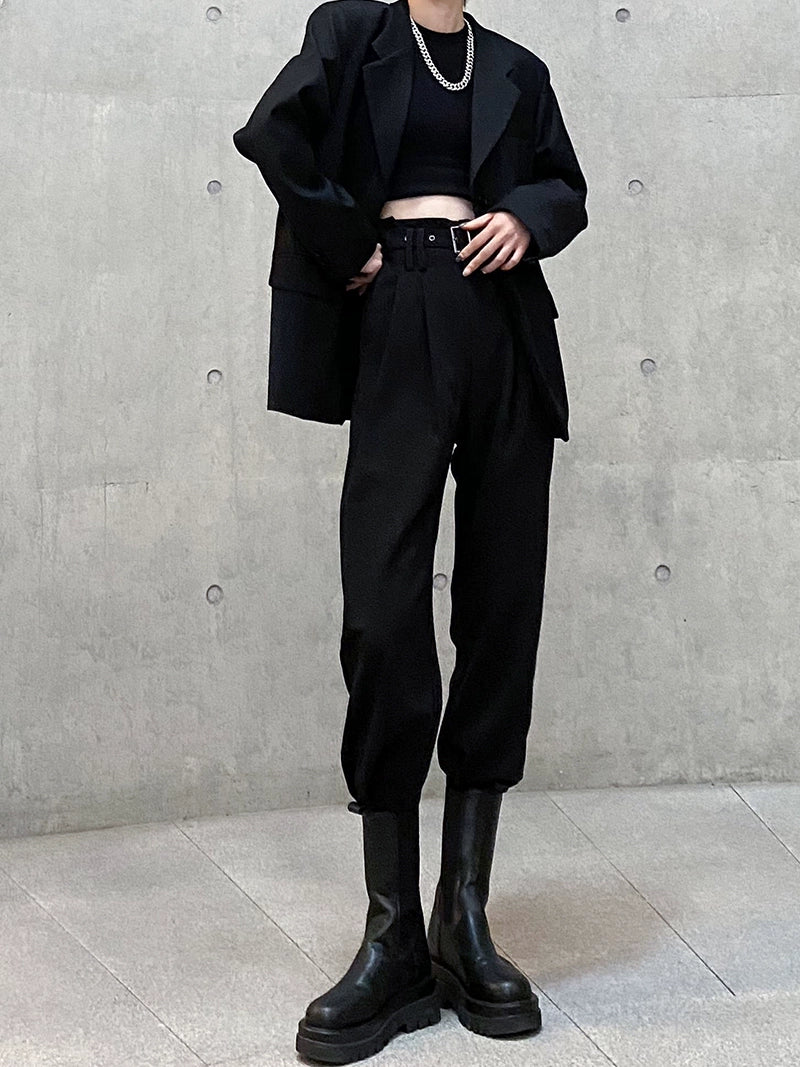 モードとストリートを融合した新作スラックス。ウエストベルト付きのハイウエスト設計で脚長効果が抜群。裾はタック入りのジョガーデザインになっており、ヒールにもブーツにも合わせやすい万能シルエット。軽くてハリのあるポリエステル素材で、春秋〜冬までロングシーズン着用可能です。