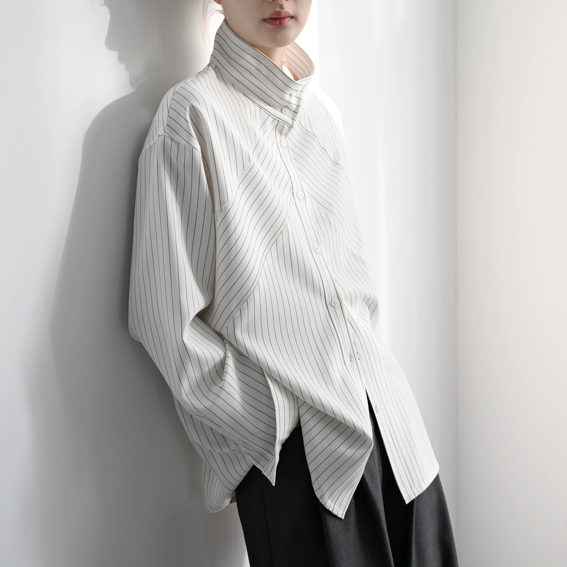 上質なストライプ柄のファブリックを使用した立体デザインシャツ。クロスラインの切り替えと立ち上がる襟元が印象的で、シンプルながら存在感のある一枚。フォーマルにもカジュアルにも着回せる大人のためのデザイン。春秋の通勤コーデにおすすめ。