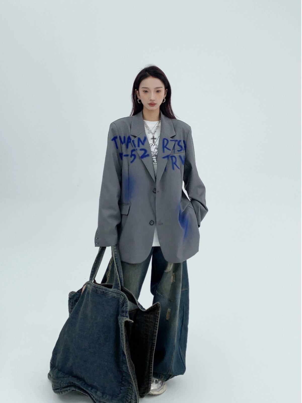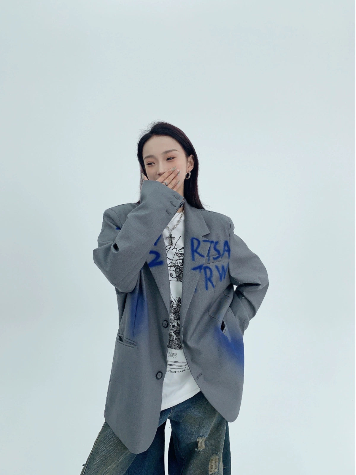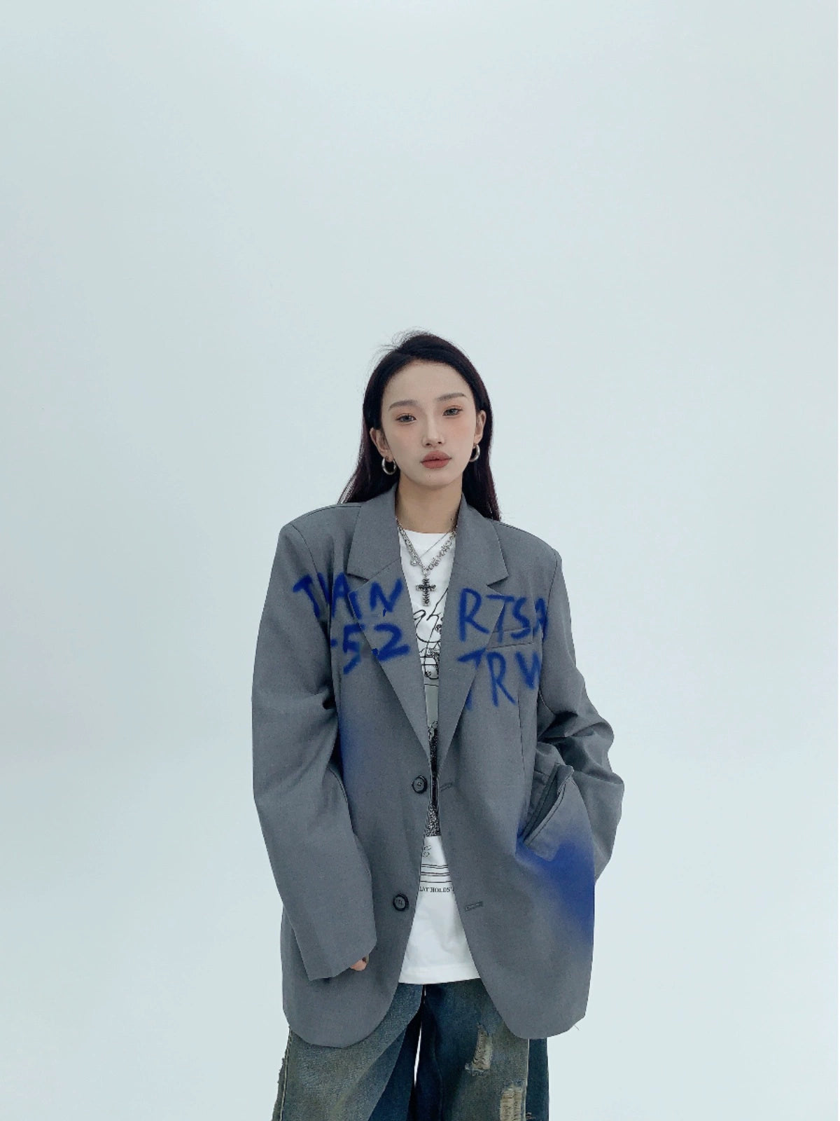 マットな質感のグレーポリエステル地に、ハンドペイント風のブルーグラフィティを施したデザインジャケット。肩にしっかりとしたパッド入りで、メンズライクな直線的シルエットを実現。程よい厚みで秋から春先まで着用可能。ユニセックス仕様で、カジュアルにもストリートにも映える一枚。