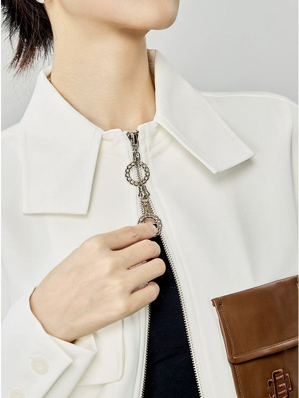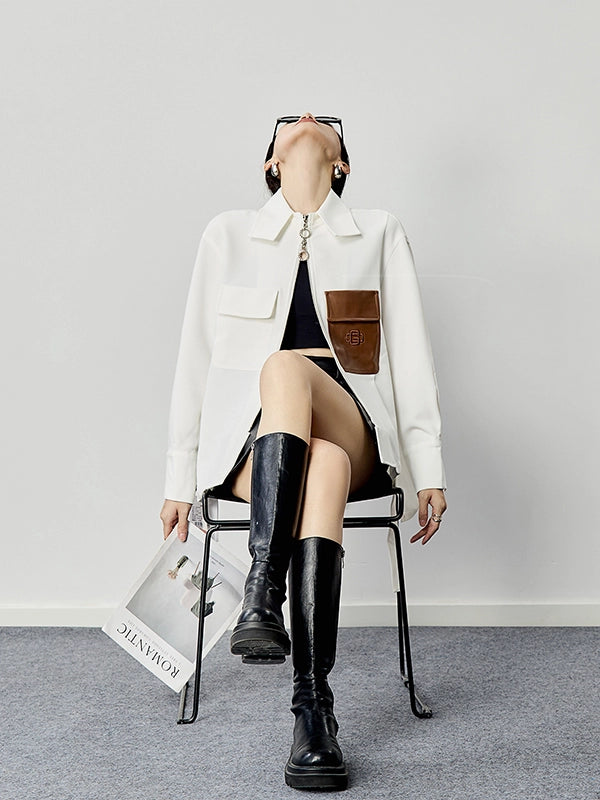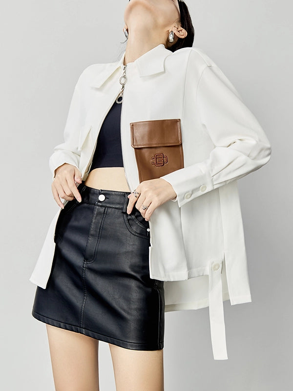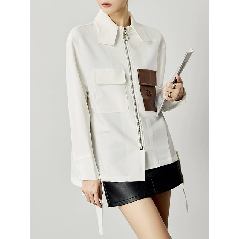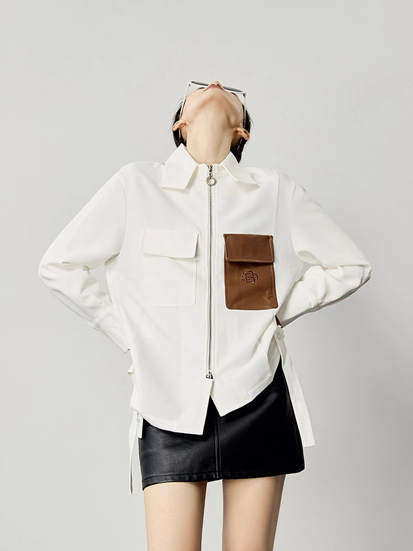 上品なホワイトベースにブラウンのフェイクレザーポケットを配した、存在感抜群のアシンメトリーデザインシャツ。ややハリのある生地感で、シャツとしても軽アウターとしても活躍。ボックスシルエットでスタイルを選ばず、スカートやデニムとも好相性。