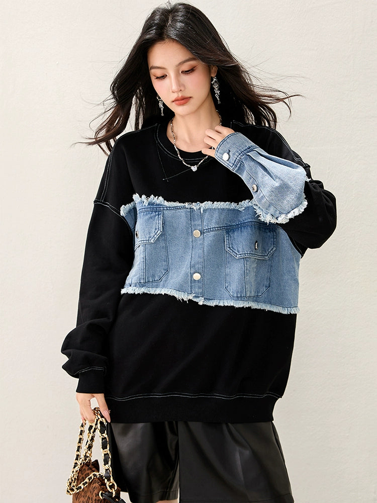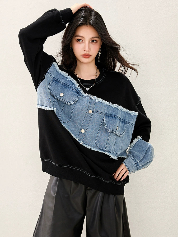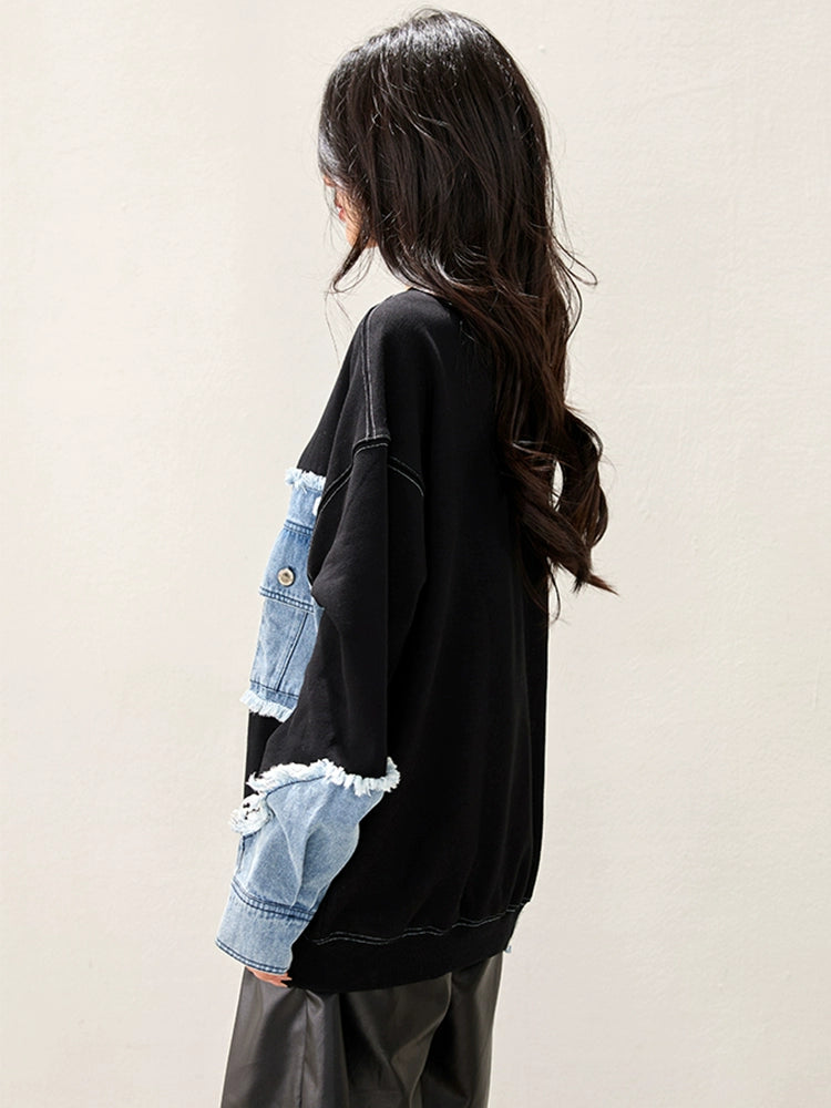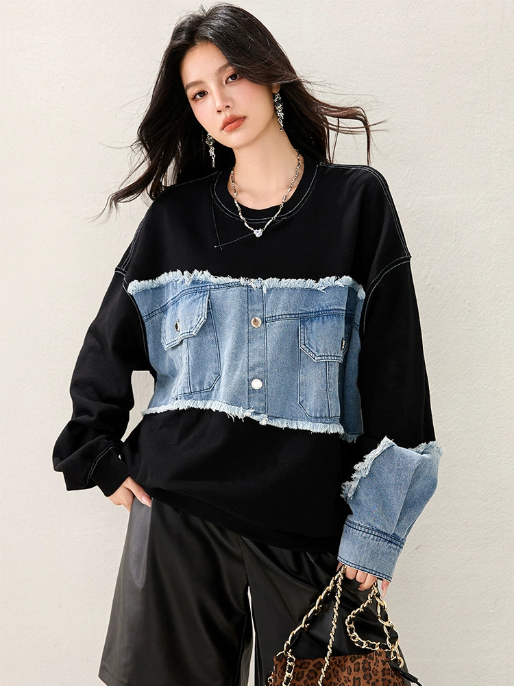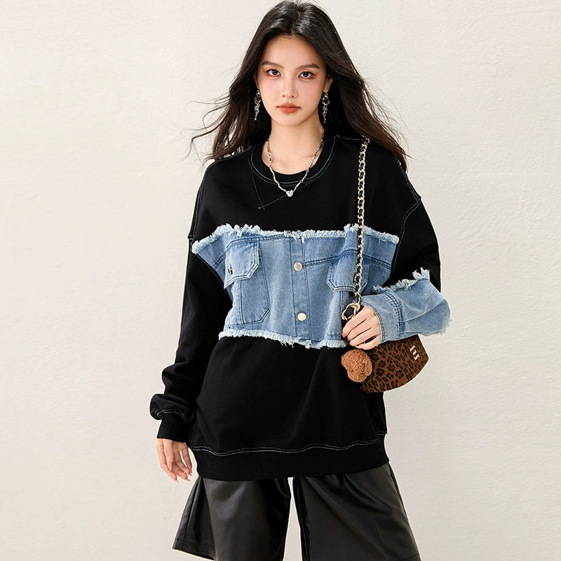 ブラックボディにデニムスリーブを組み合わせたフェイクレイヤード風デザイン。袖の切りっぱなし加工がヴィンテージ感を演出。ゆるめのシルエットで抜け感があり、カジュアルにもモードにも使える万能トップス。