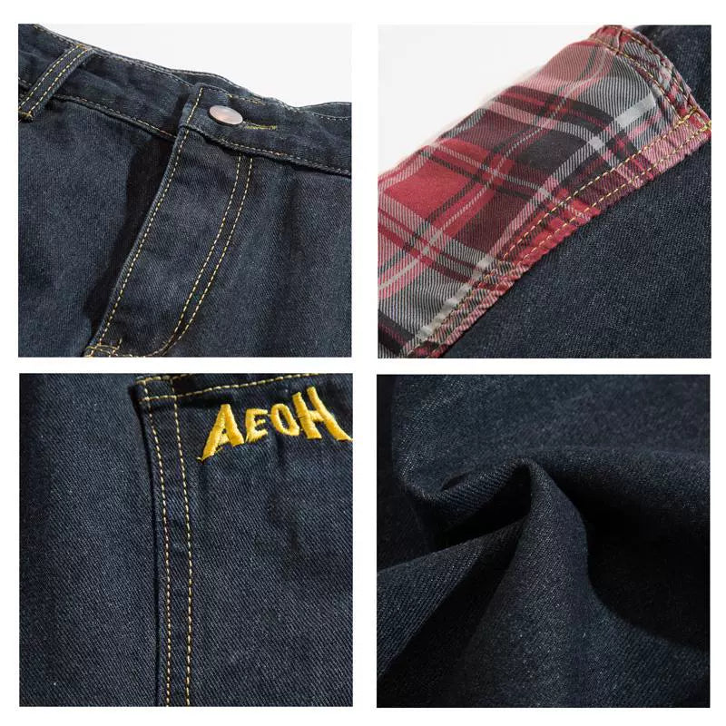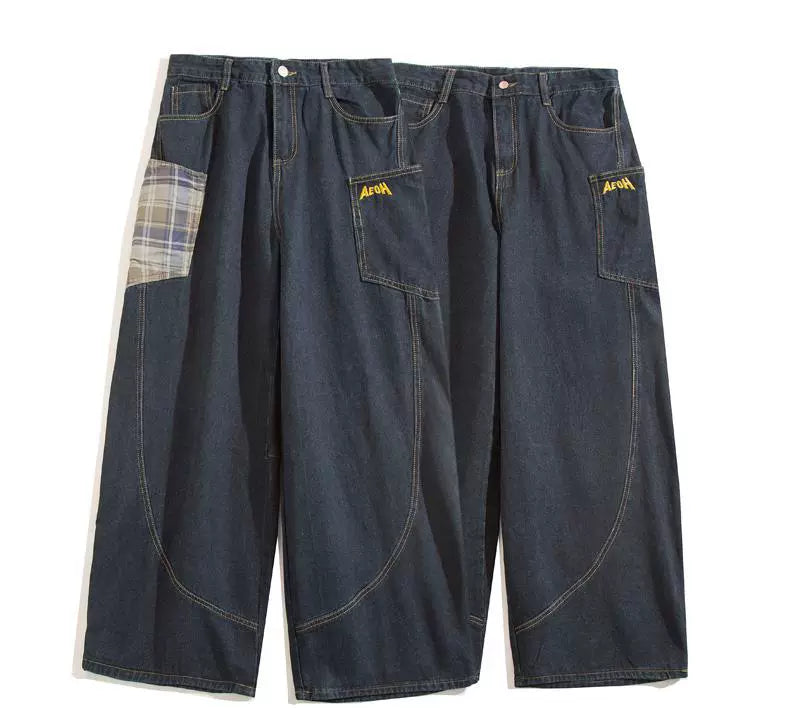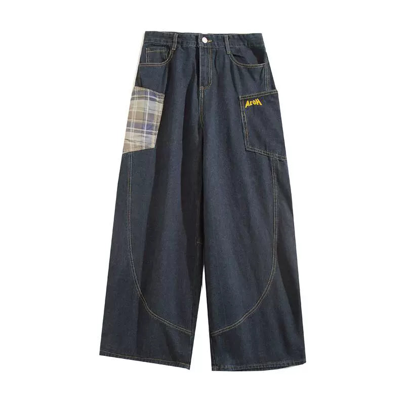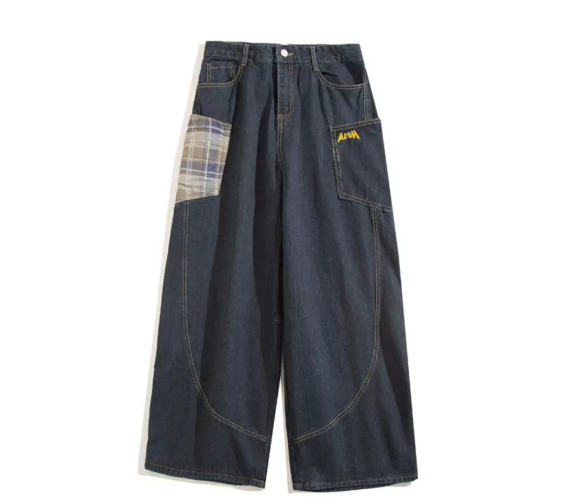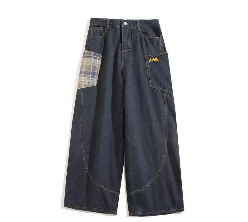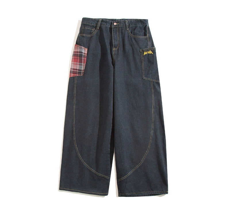大きめポケットとカーブステッチが特徴的なヴィンテージ風デニム。格子柄パッチが個性をプラスし、カジュアルにもストリートにもマッチするワイドシルエット。ヒップラインにゆとりを持たせた設計で、男女問わずゆるく履けるデザイン。