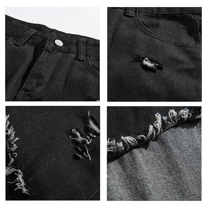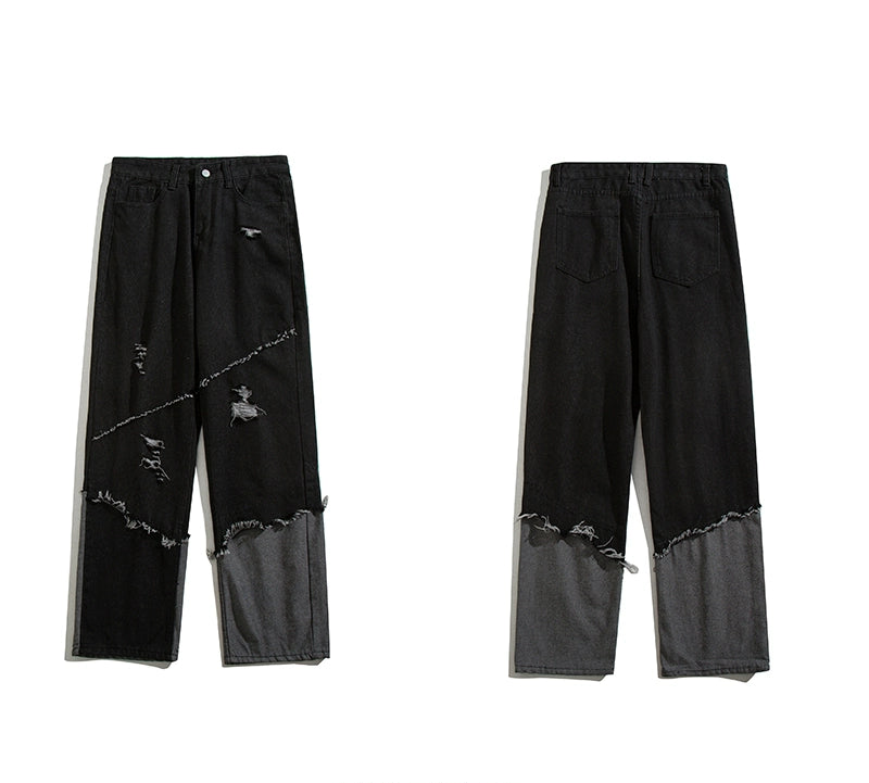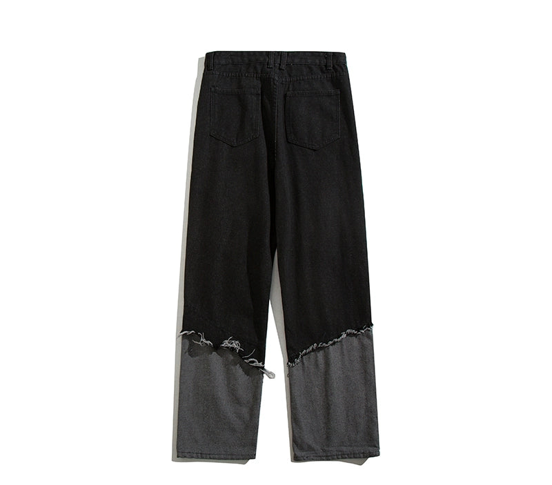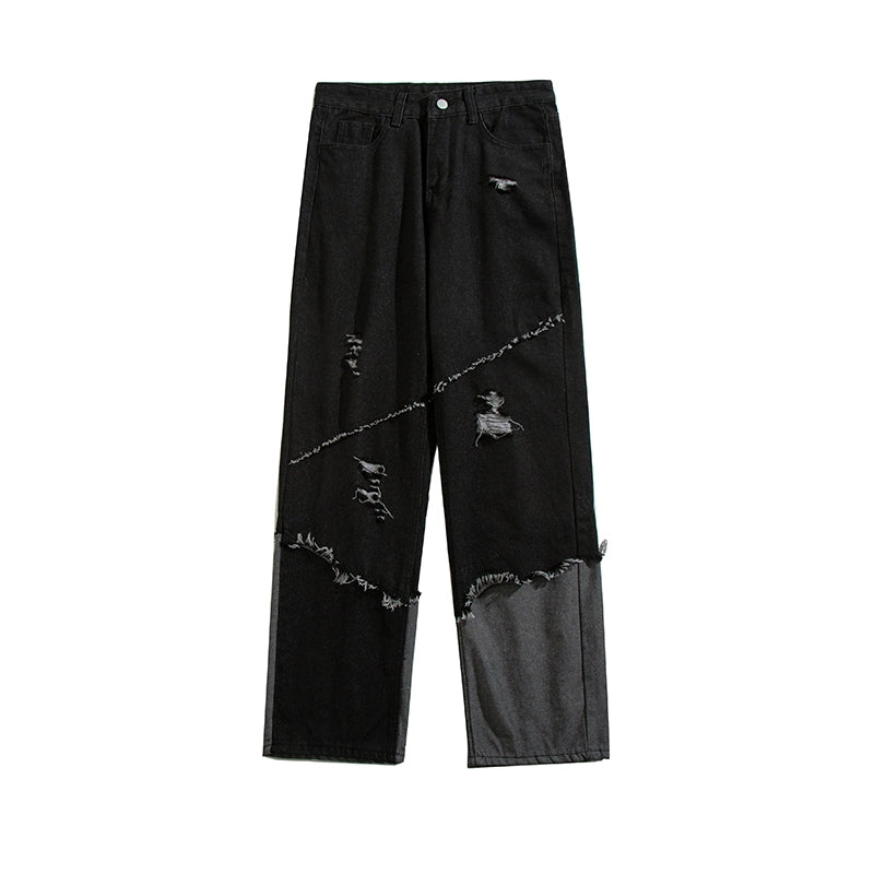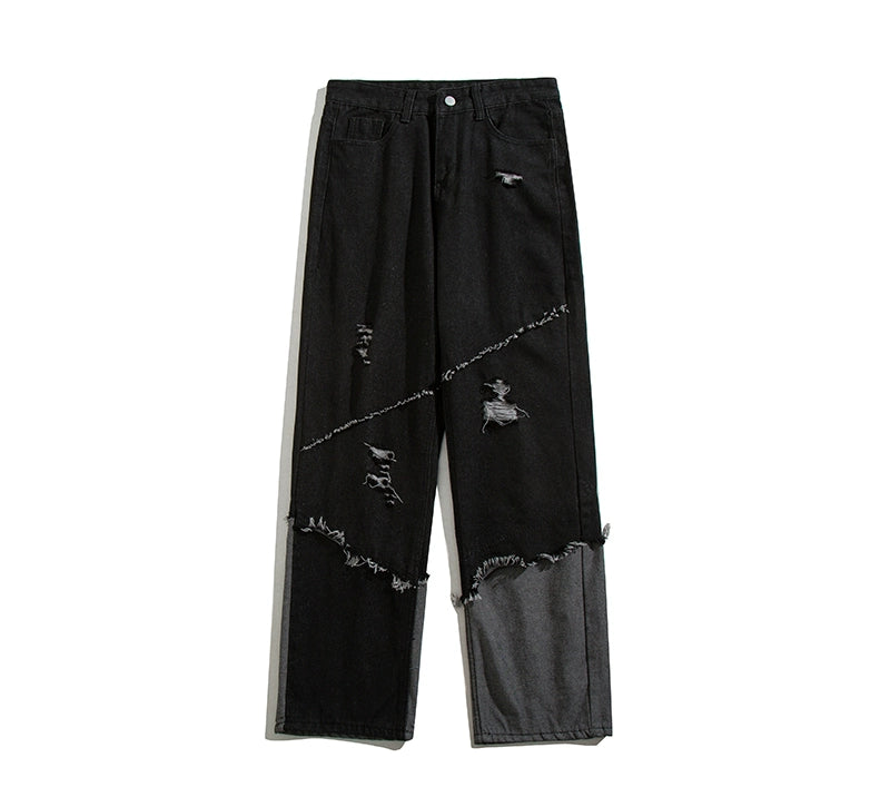 左右非対称の生地切り替えが印象的な、暗黒系ストリートデニム。ヴィンテージ感あるウォッシュ加工に加え、ラフなダメージ仕上げでモード感を演出。ゆるやかなワイドシルエットで性別問わず着用可能。