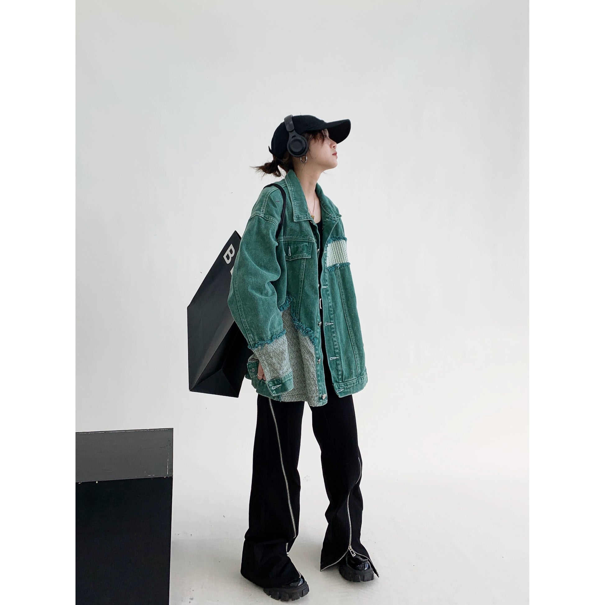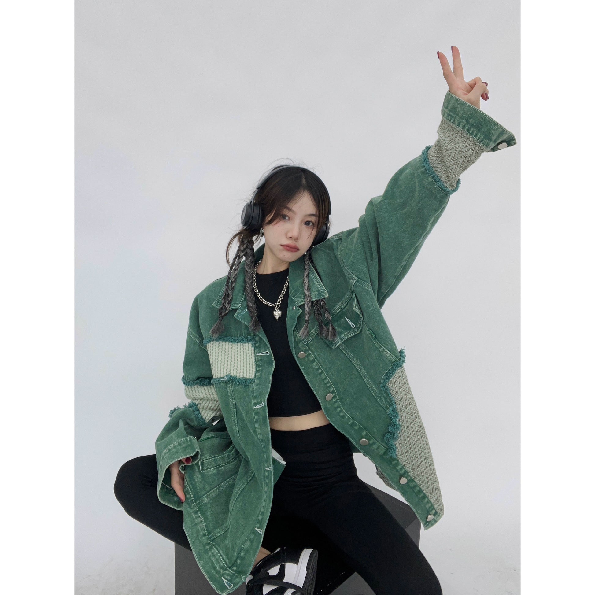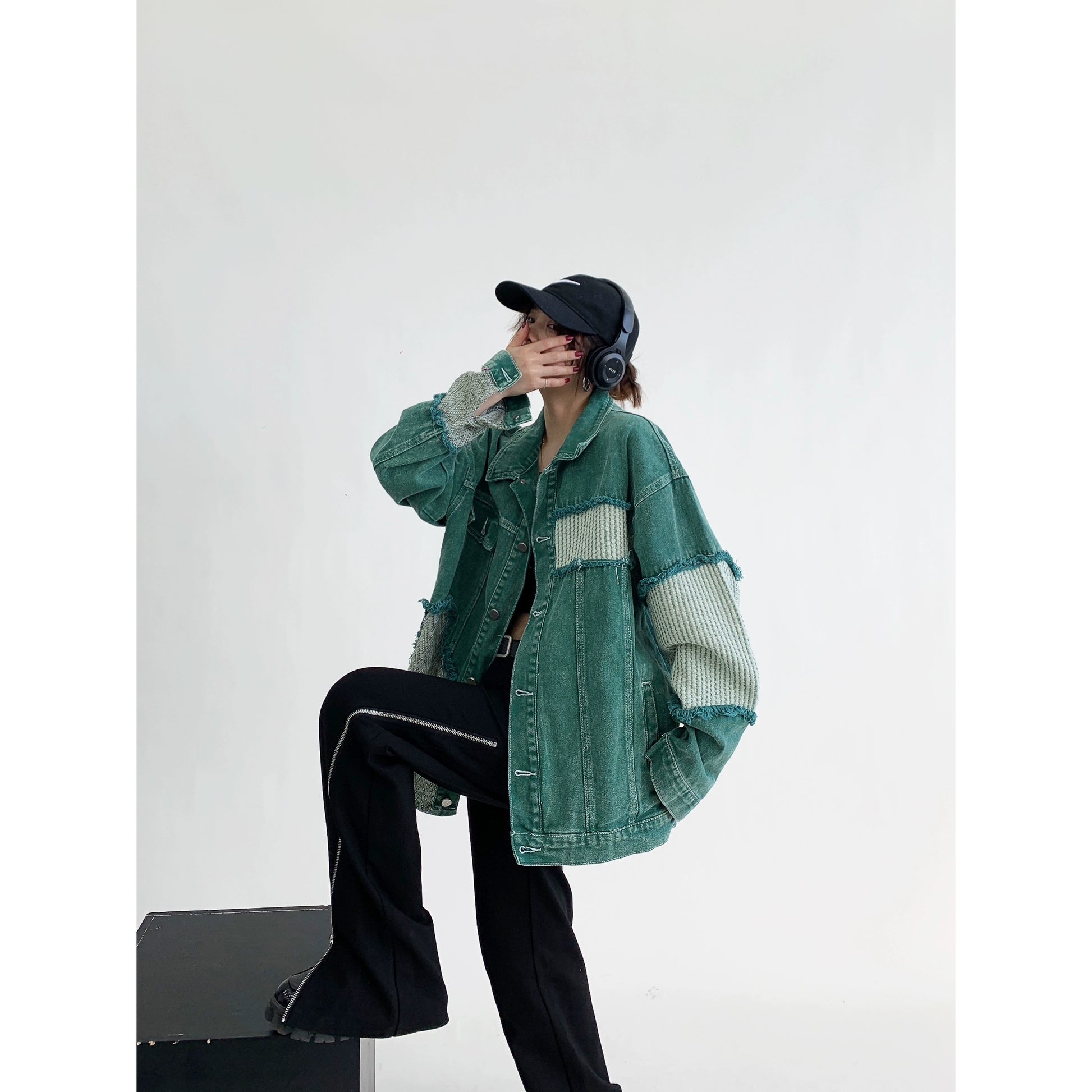 ウォッシュ加工を施したグリーンデニムに、ニットやヘリンボーン生地を大胆にパッチワークしたデザインジャケット。ユーズド感のあるフェードカラーが特徴で、ストリートから古着ミックスまで幅広く対応。ドロップショルダーのオーバーサイズ設計で男女兼用におすすめ。