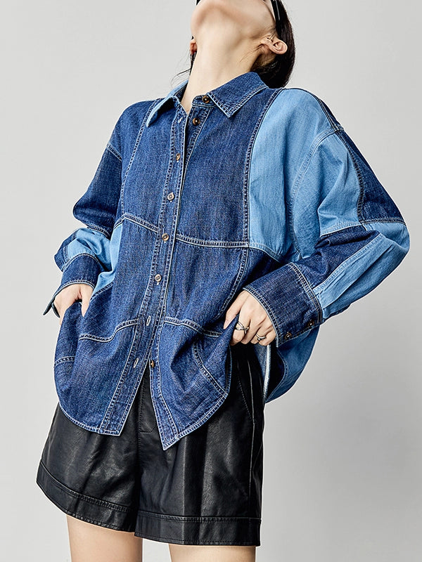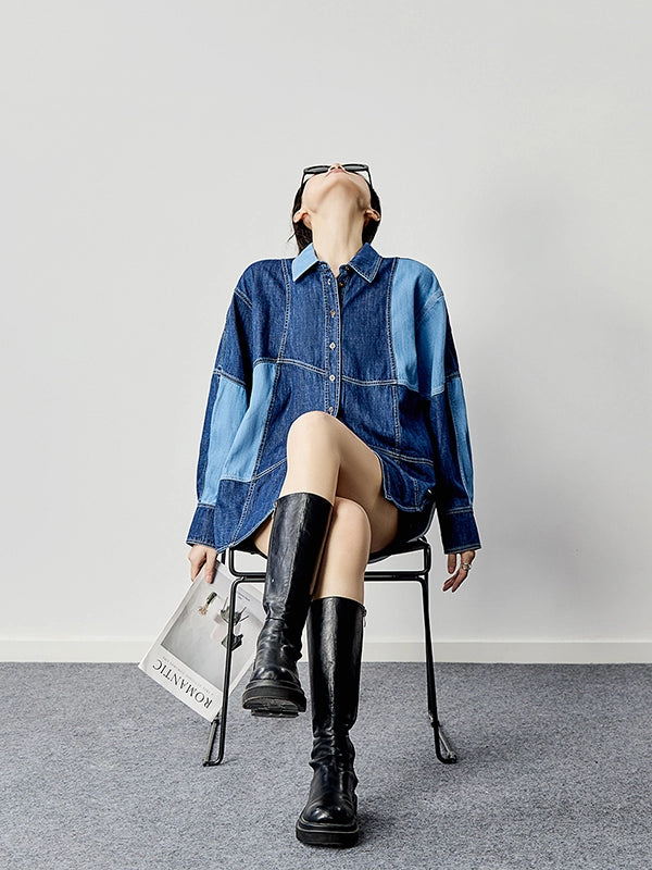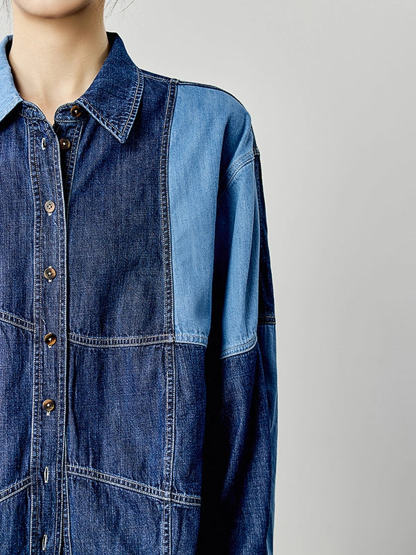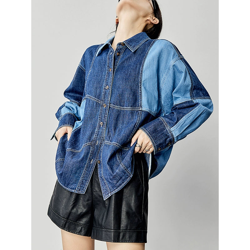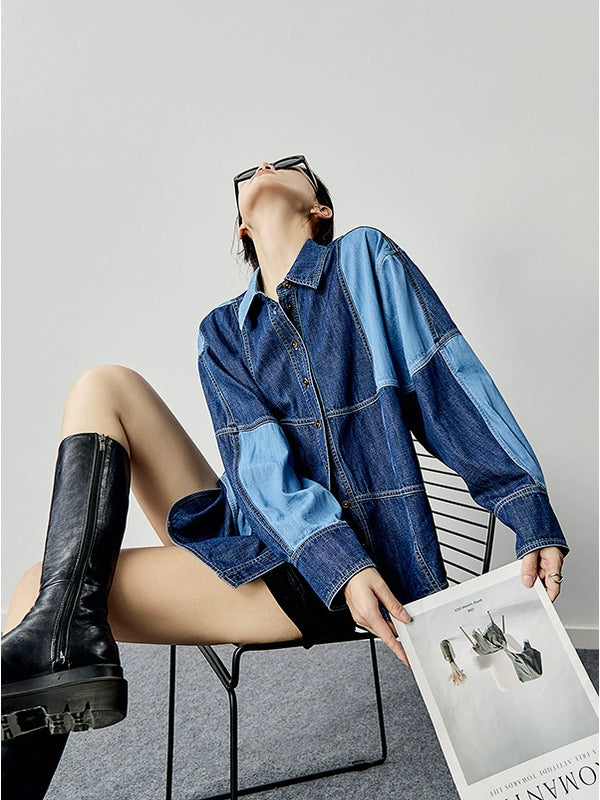 濃淡の異なるデニム生地を大胆に切り替えたデザインシャツ。ステッチラインとボリュームスリーブが印象的で、羽織るだけでコーデが締まる一枚。厚みのあるコットンデニム素材で、春秋のライトアウターとしても◎。