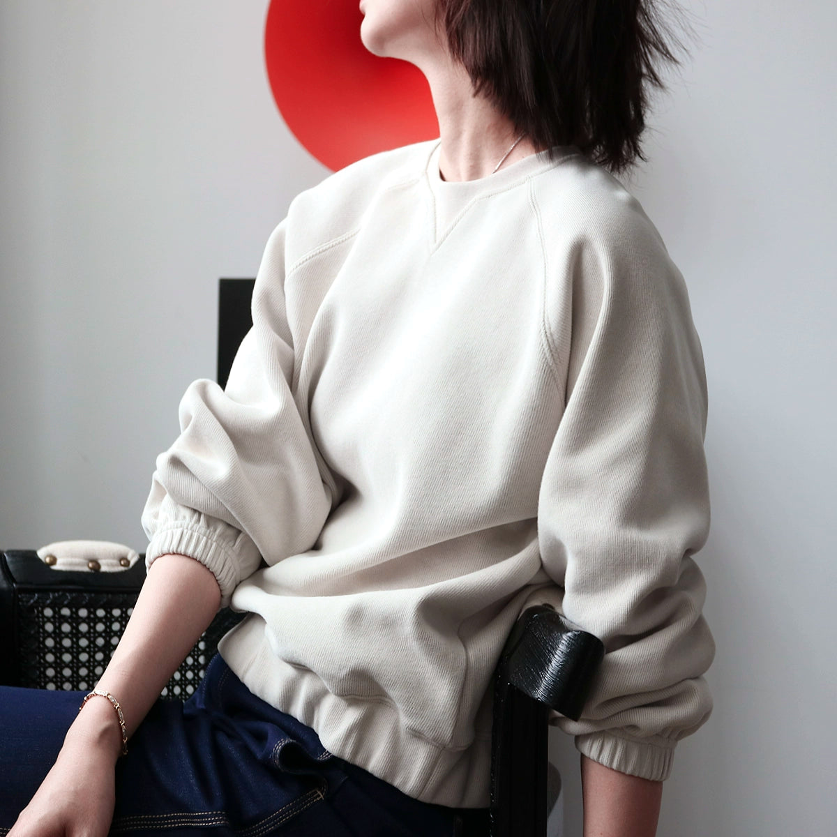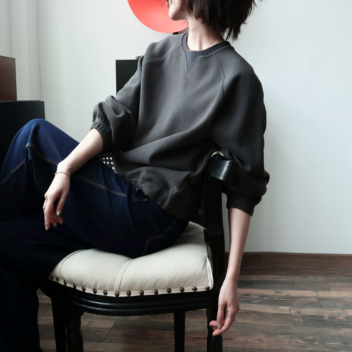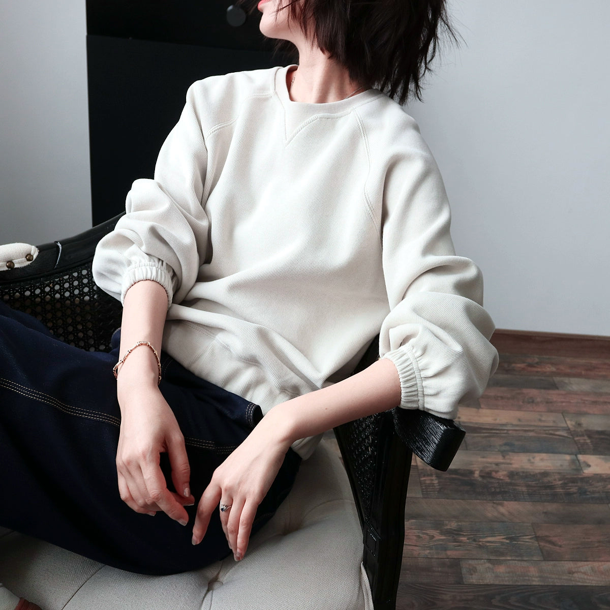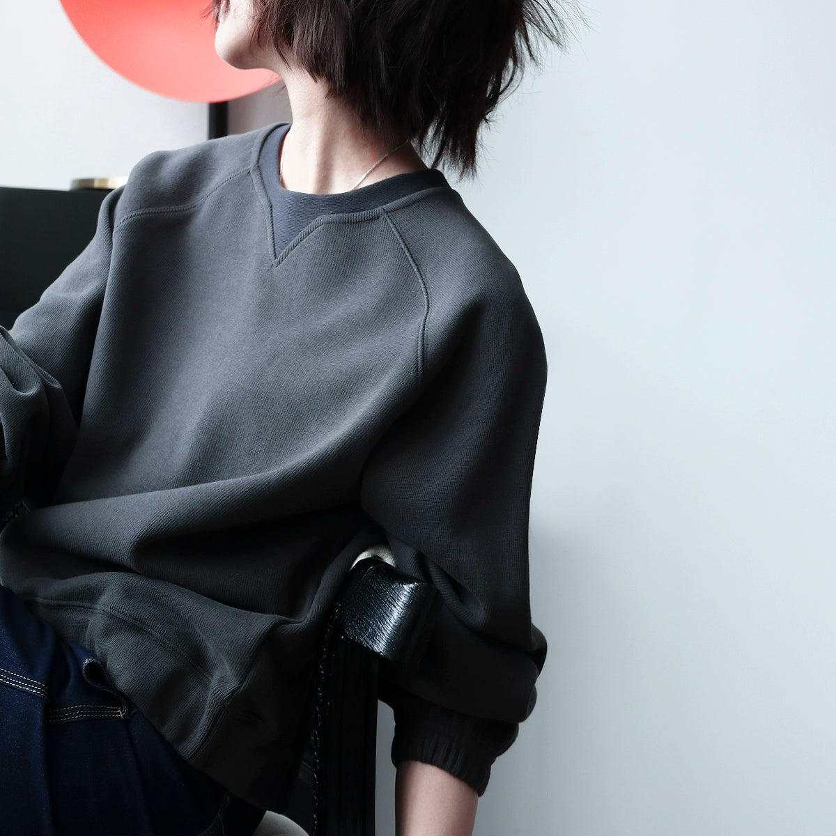 程よい抜け感のあるVネックデザインが特徴のゆるだぼスウェット。体のラインを拾わないシルエットで、ラフなのに上品に見える一枚。柔らかな素材感でデイリーに使いやすく、デニム・スカート問わず合わせやすい万能トップス。長めの袖が華奢見えを演出し、ミニマルながら「大人の余裕」を引き出すデザイン。秋〜冬のレイヤードにも最適。