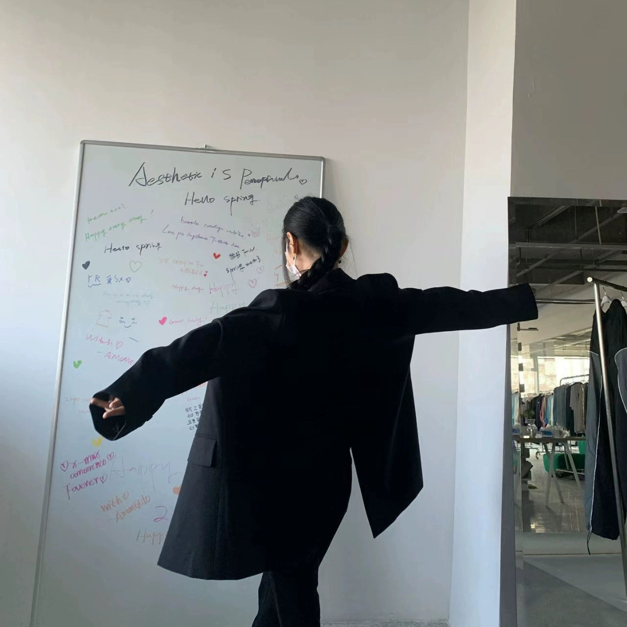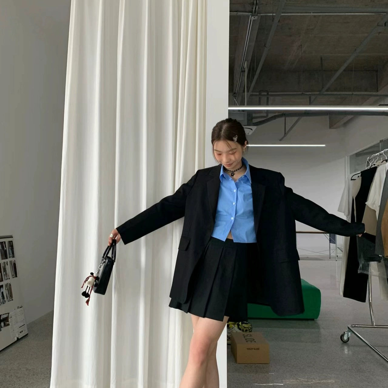 程よいハリと落ち感のある生地で、身体のラインをきれいに見せる修身シルエット。男女中性スタイルで、フォーマルにもストリートにも馴染む1枚です。