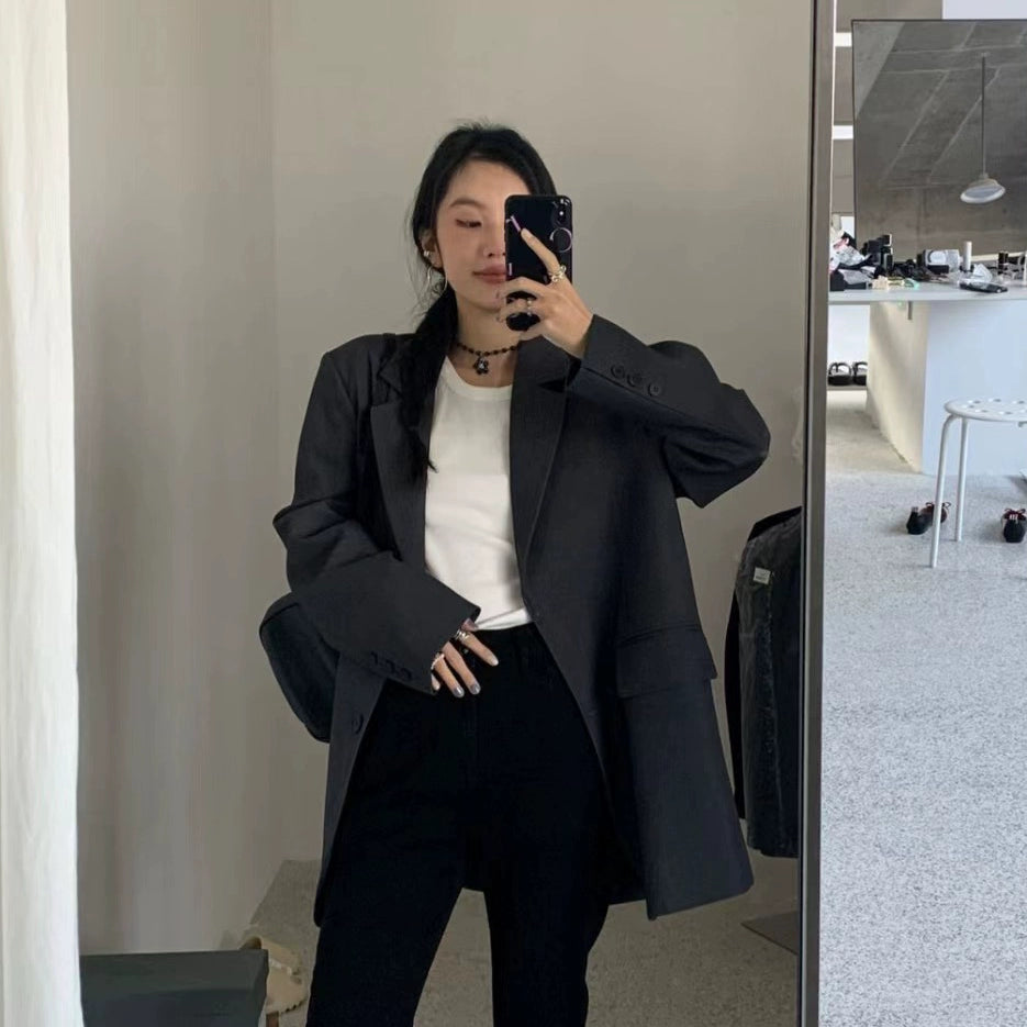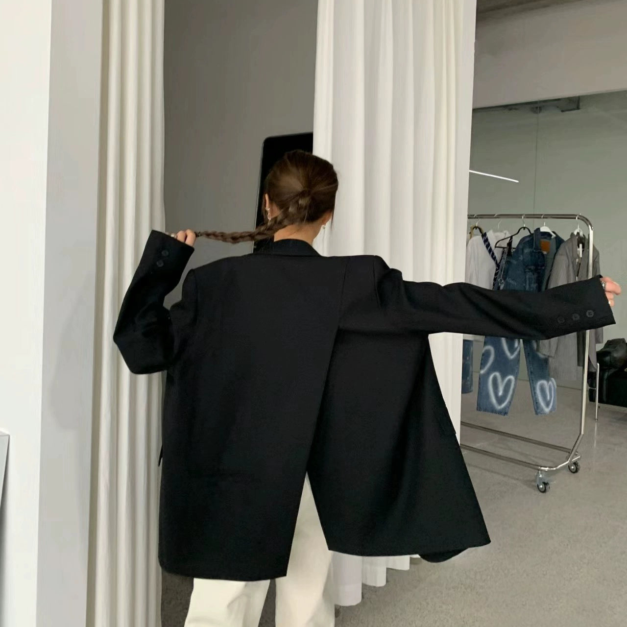 後ろに入ったスリットデザインが印象的な、2025春夏新作のブラックテーラードジャケット。軽やかに羽織れる薄手仕様ながら、立体感のあるフォルムでこなれ感を演出。肩に少しゆとりを持たせたオーバーサイズシルエットで、羽織るだけで大人の抜け感をプラスします。カジュアルにもフォーマルにも合わせやすく、デニム・スラックス・スカートなど幅広くスタイリング可能。