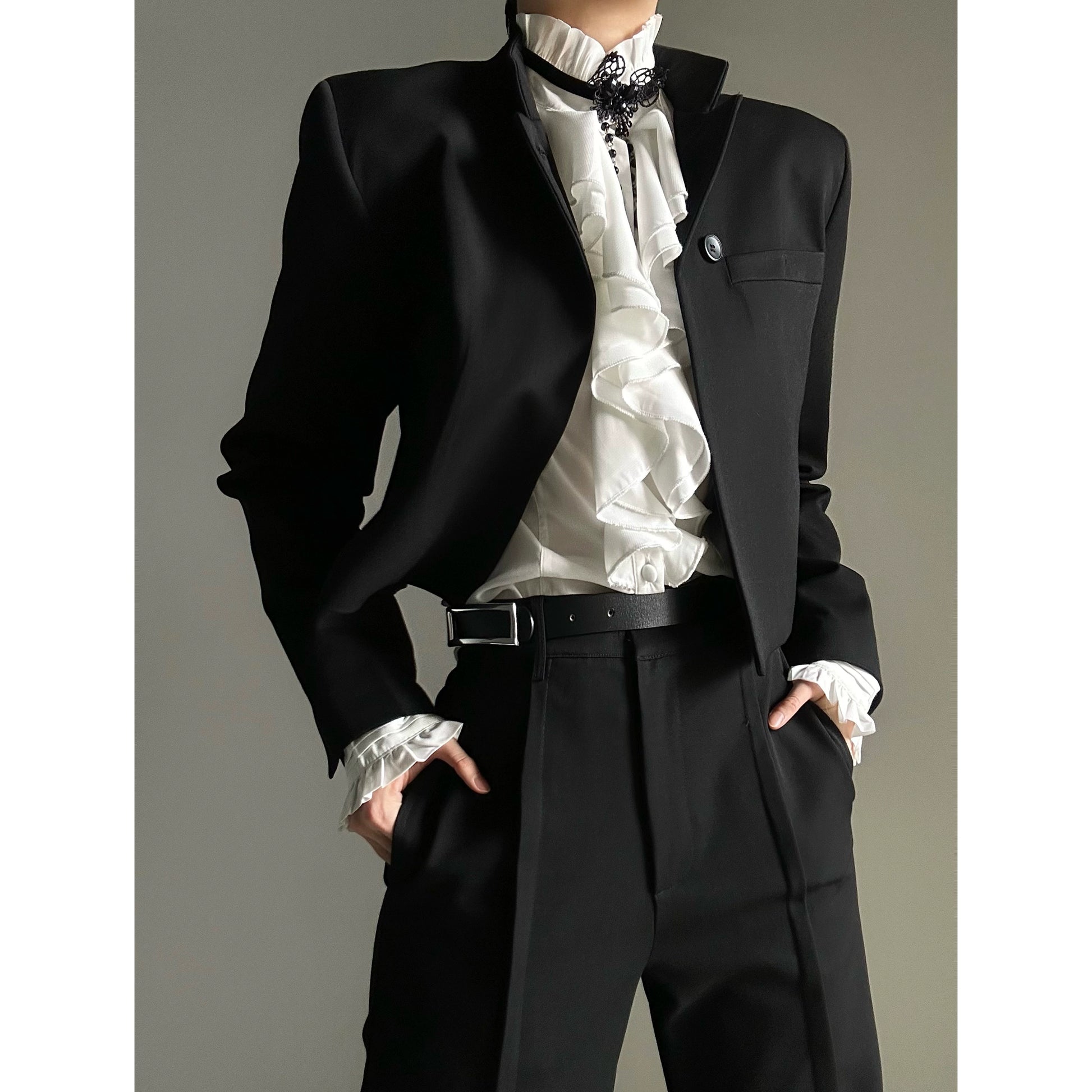 程よいハリと落ち感のある生地で、身体のラインをきれいに見せる修身シルエット。男女中性スタイルで、フォーマルにもストリートにも馴染む1枚です。