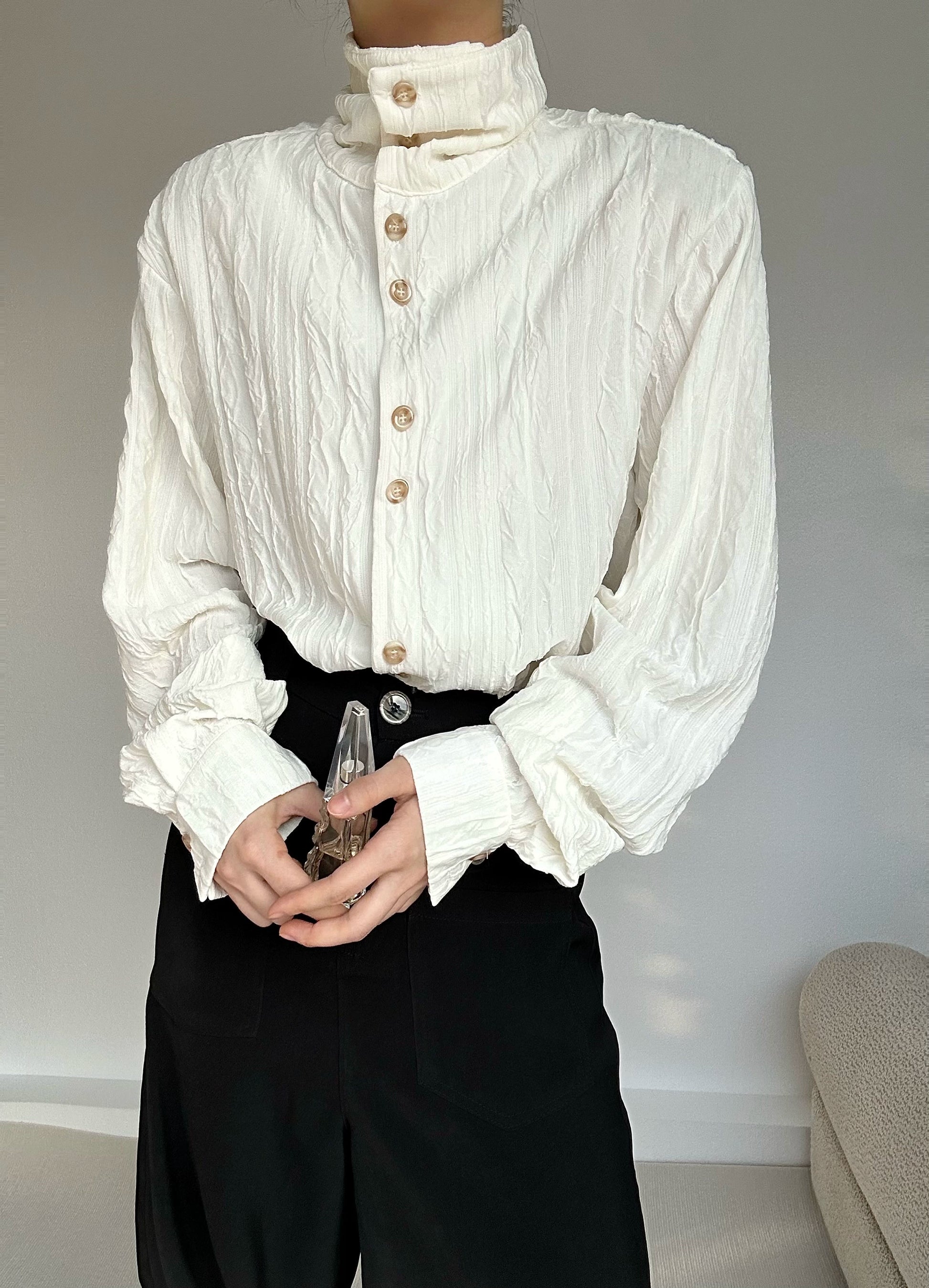 立体的な「肌理感」素材が特徴のスタンドカラーシャツ。表面に凹凸のある生地が陰影を生み、上品な抜け感とモードな印象を両立。中性的なデザインで男女問わず着用でき、タックイン・レイヤードどちらでも美しいシルエットを演出します。軽量ながら保温性もあり、秋冬のベースレイヤーとしても最適。(ブラックとホワイトの2種類)