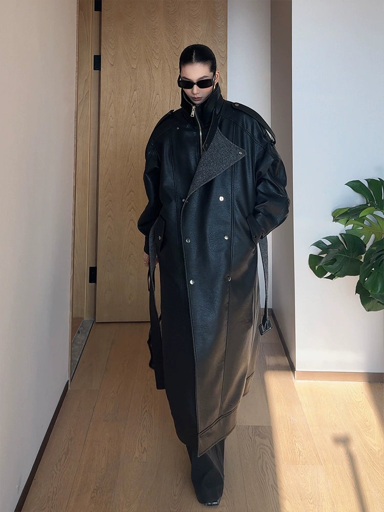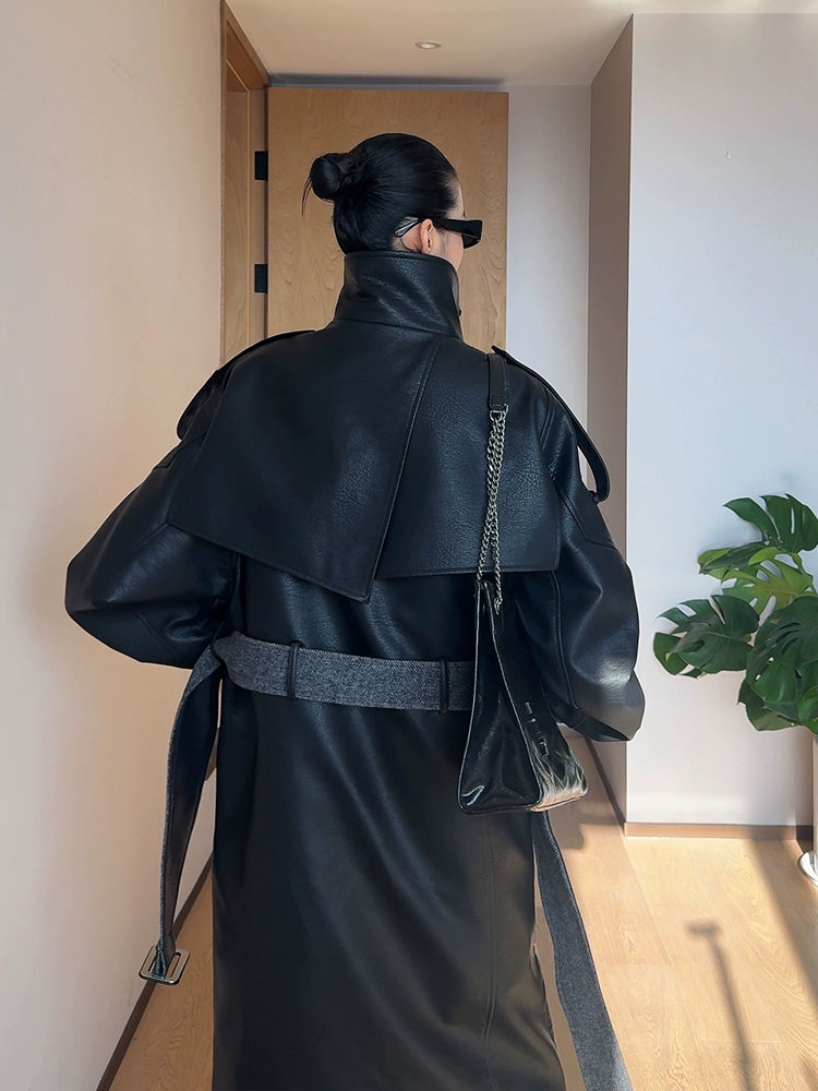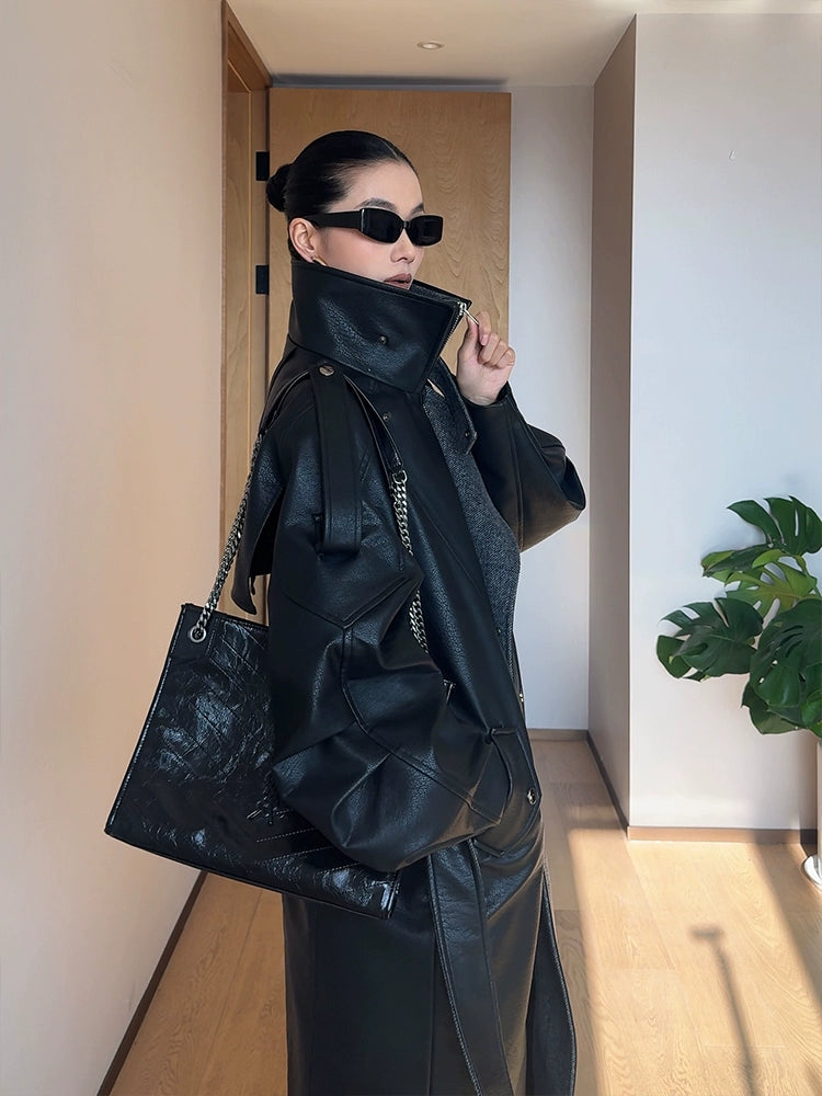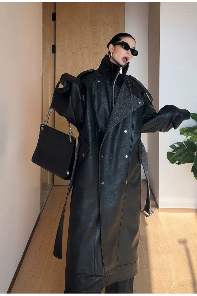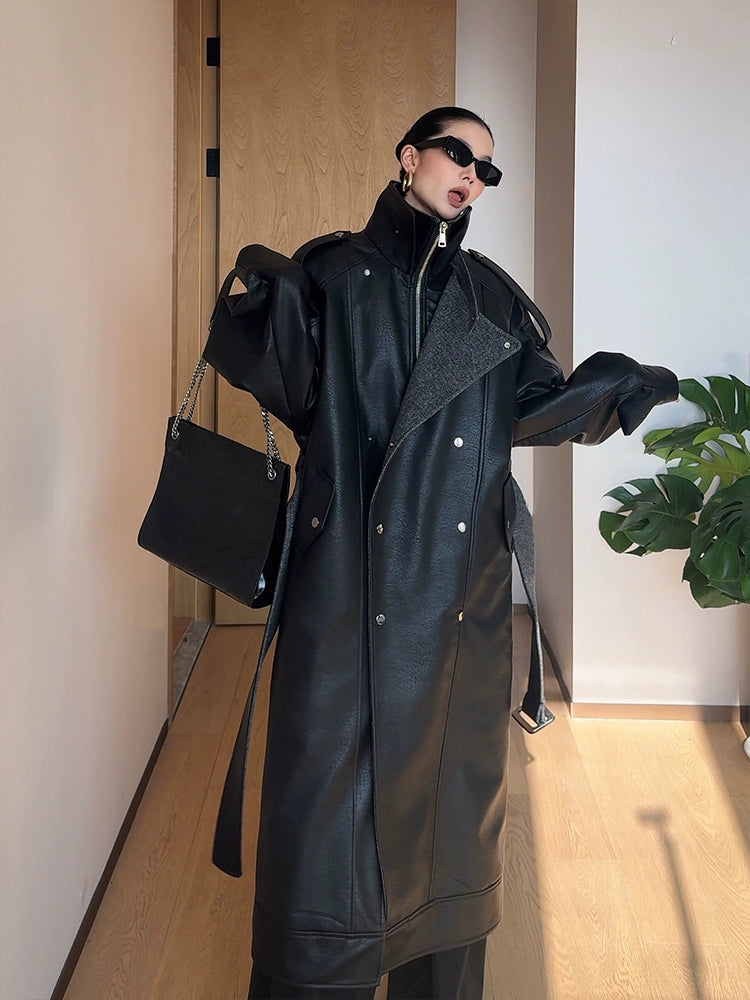 高品質フェイクレザーとウール混生地を使用し、重厚感がありながら動きやすい構造。取り外し可能なダウン風インナーベスト付きで、秋〜冬までロングシーズン対応。立ち襟+オーバーサイズシルエットが小顔効果とスタイルアップを演出。ベルトでウエストマークも可能。S(85–130斤):着丈123/胸囲128/肩幅43/袖丈54。M(125–150斤):124/132/45/56。