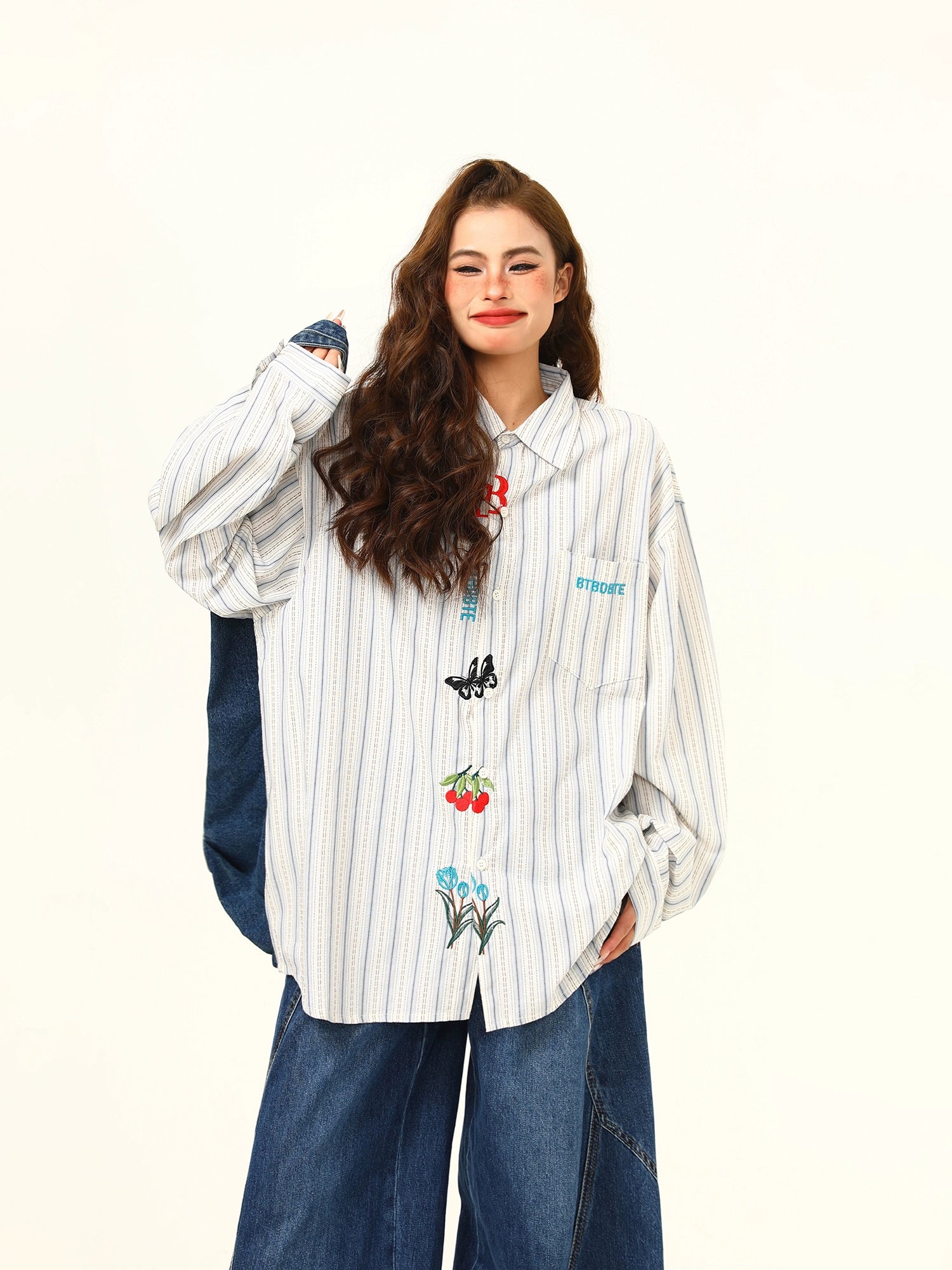 ホワイトベースに細ストライプ柄、胸元にはカラフルな刺繍モチーフを施したレトロな一枚。ゆるめのシルエットで抜け感があり、デニムとの相性抜群。美式ヴィンテージなムードを漂わせる、春秋に最適なライトシャツ。