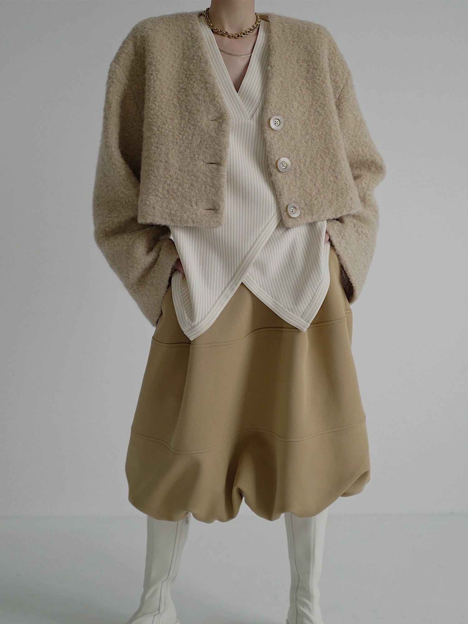 立体的な「肌理感」素材が特徴のスタンドカラーシャツ。表面に凹凸のある生地が陰影を生み、上品な抜け感とモードな印象を両立。中性的なデザインで男女問わず着用でき、タックイン・レイヤードどちらでも美しいシルエットを演出します。軽量ながら保温性もあり、秋冬のベースレイヤーとしても最適。(ブラックとホワイトの2種類)