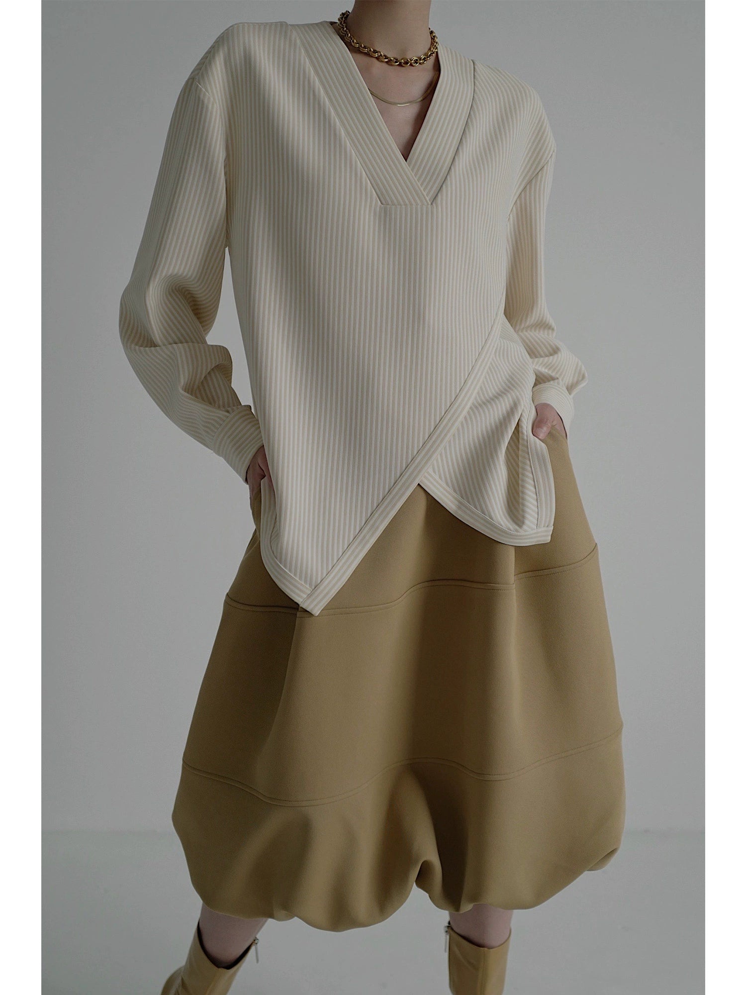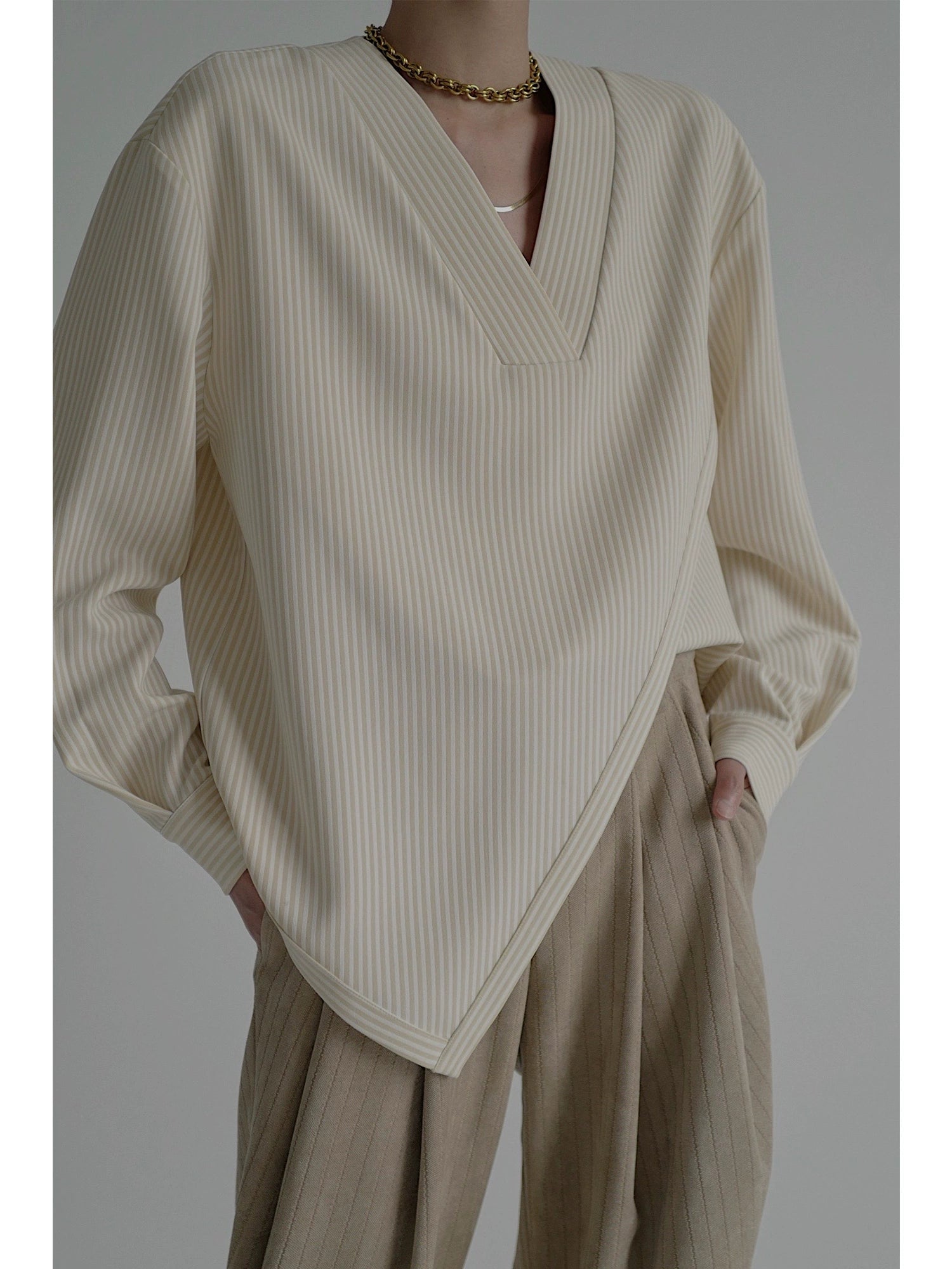 胸元の深Vラインとアシンメトリーなクロスデザインが印象的で、モード感と抜け感を両立した一枚。ストライプの立体織り素材でシルエットに陰影を生み、スタイルアップ効果も抜群。さらりとした肌触りで季節の変わり目にも快適に着用できます。