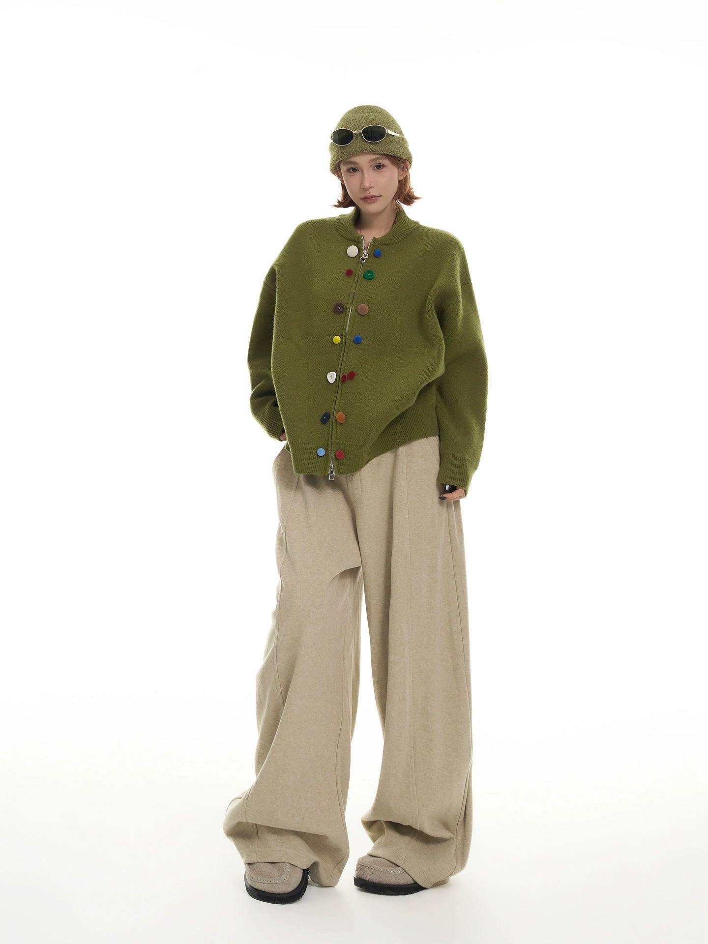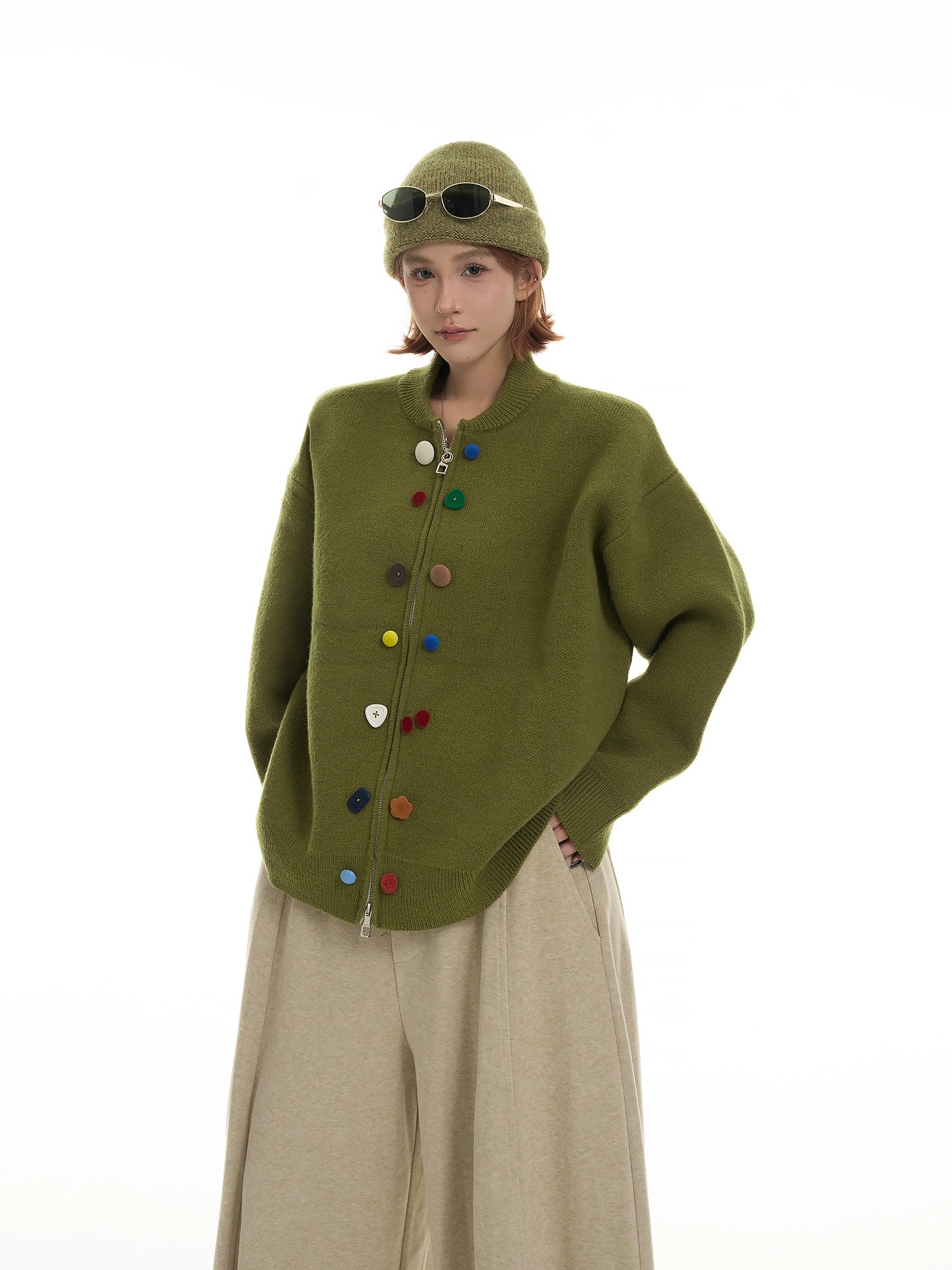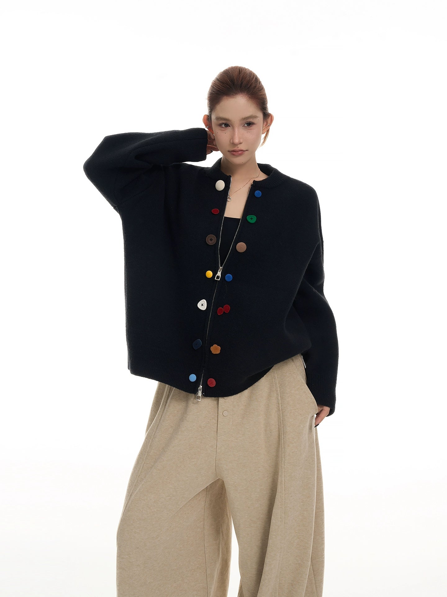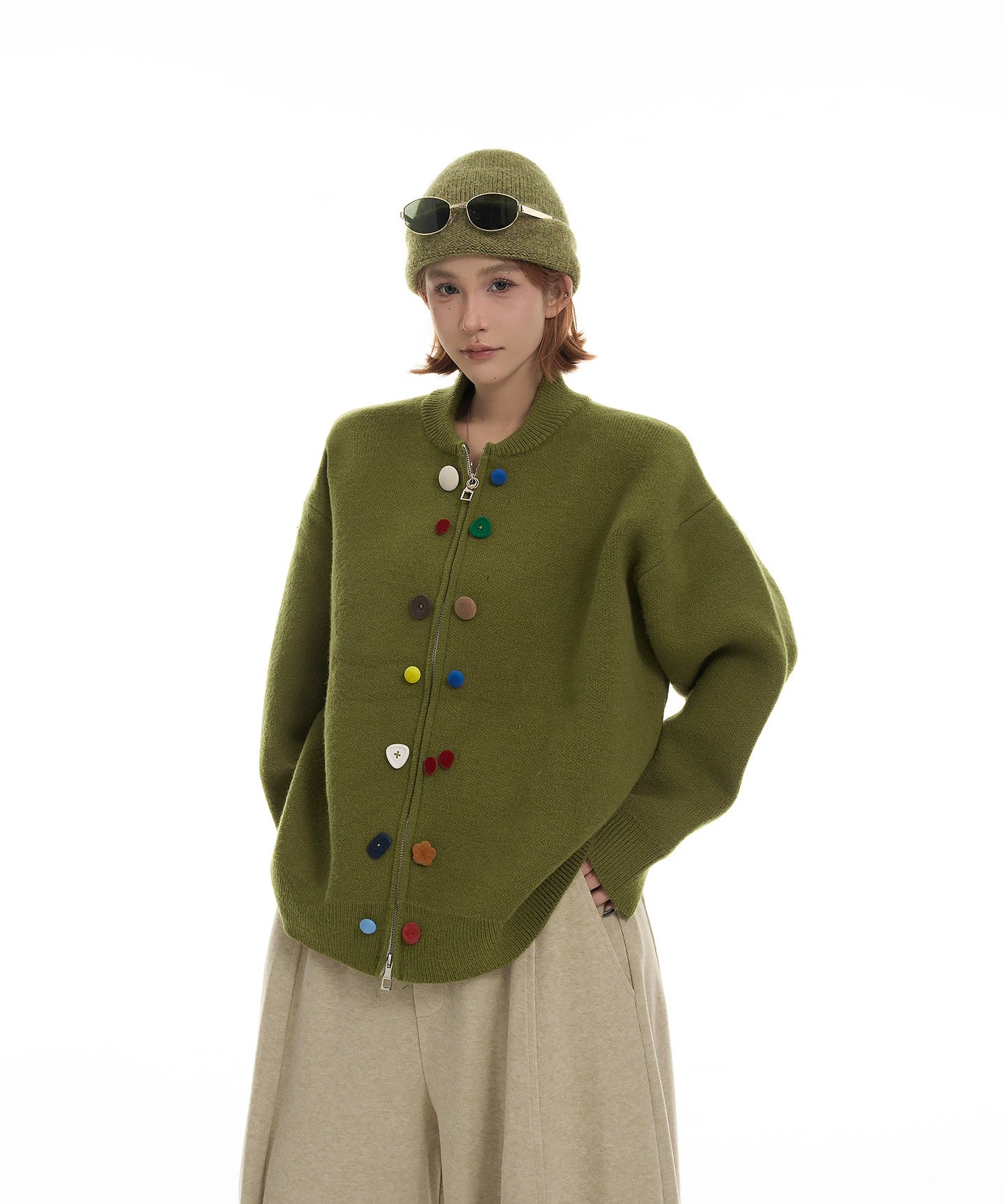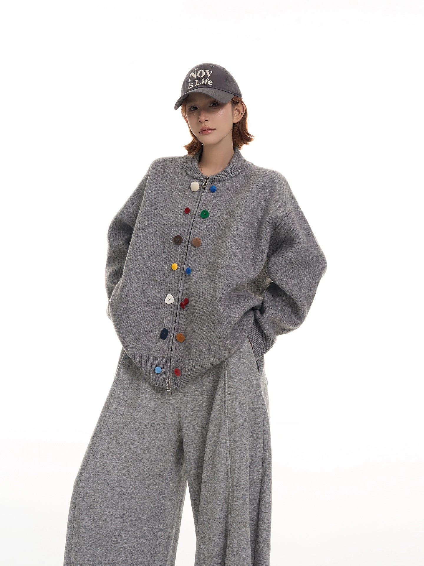 マルチカラーのボタンがアクセントになった、韓国系デザインのゆったりニットカーディガン。ふんわり柔らかい毛糸で着心地抜群。丸首デザインが顔周りをすっきり見せ、シンプルながら個性のある一枚。カジュアルにもフェミニンにも着回し可能。
