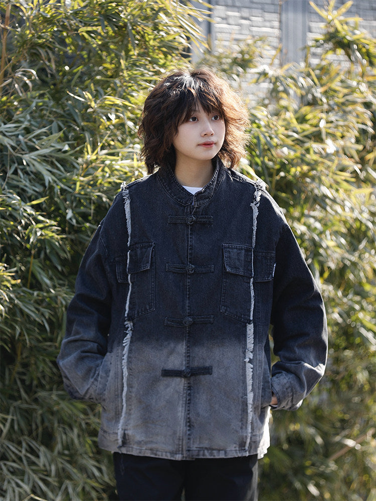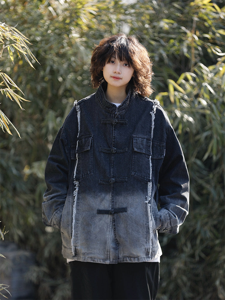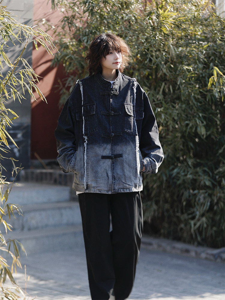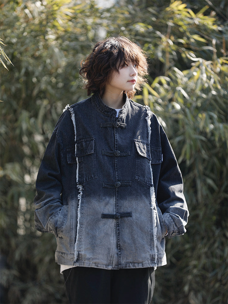 グラデーションのデニム切替が魅力のユニセックスアウター。ゆるめのシルエットで体型を選ばず、古着ライクな風合いが一枚で雰囲気を作れる主役級アイテム。裏地つきで春秋・初冬まで長く使える万能アウター。