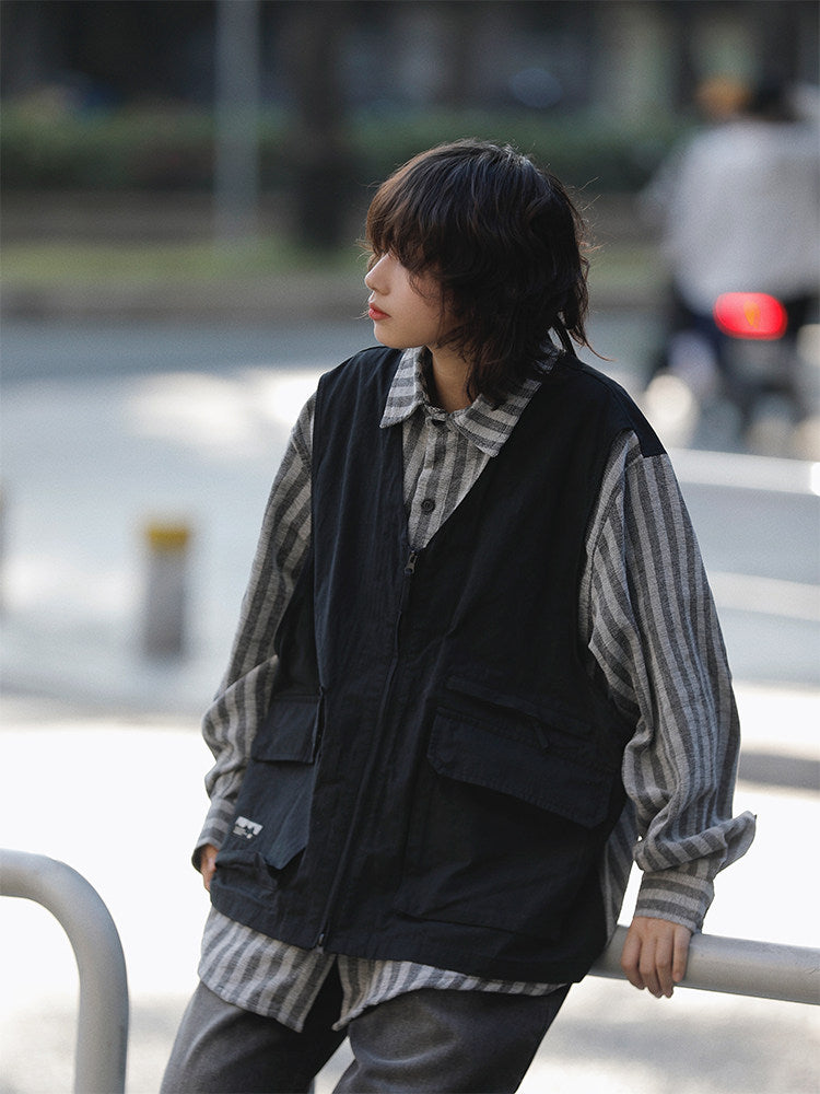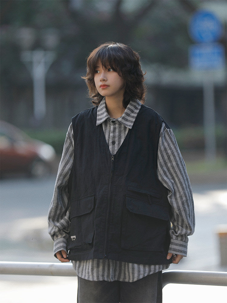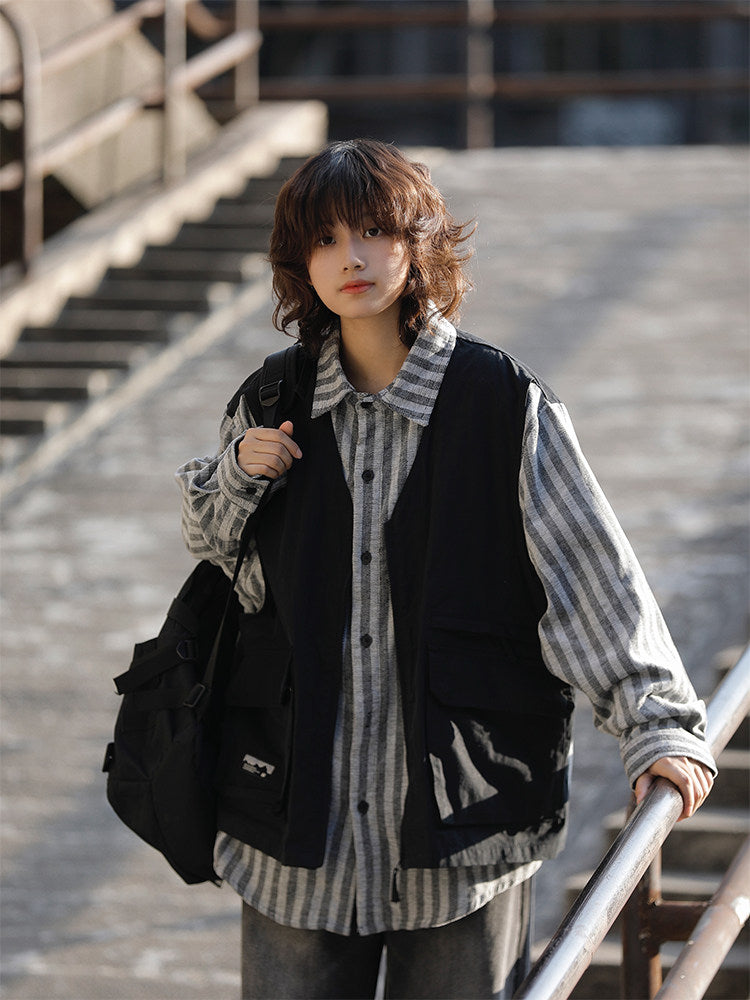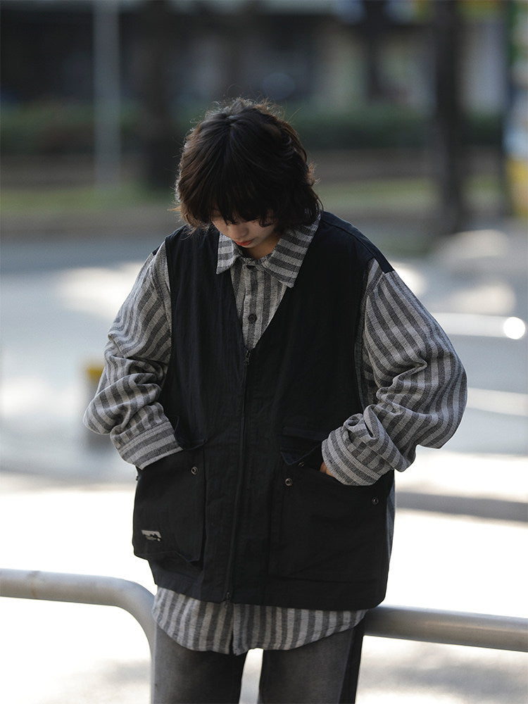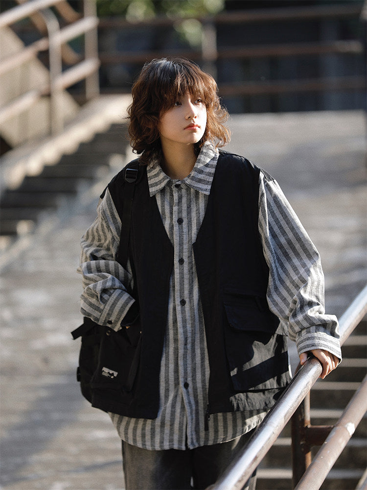 春秋日系ストライプ柄フェイクレイヤード・ワークベストシャツ(CZ404)