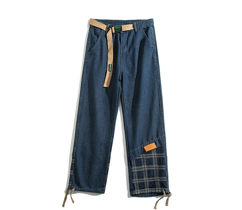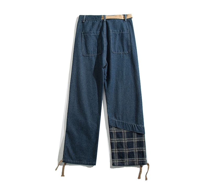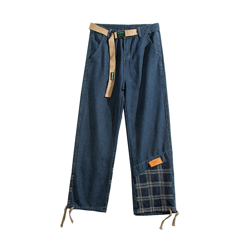 裾のチェック柄切り替えが個性を引き立てる高街系デニム。ヴィンテージウォッシュ加工で程よい色落ち感を演出し、ワイドシルエットがスタイルを拾わず脚長効果◎。ストリートから韓国系まで幅広く着こなせるユニセックスデザイン。