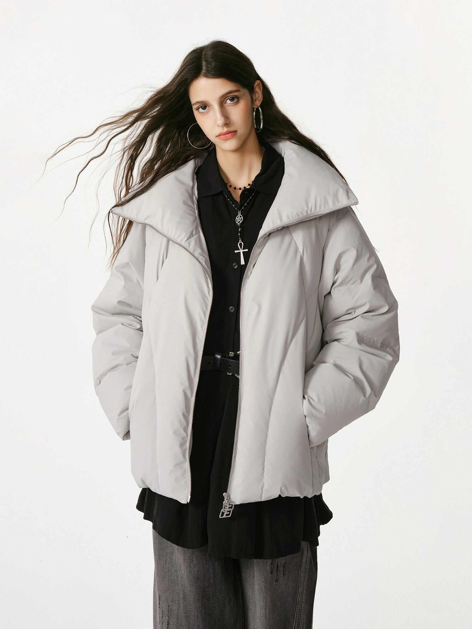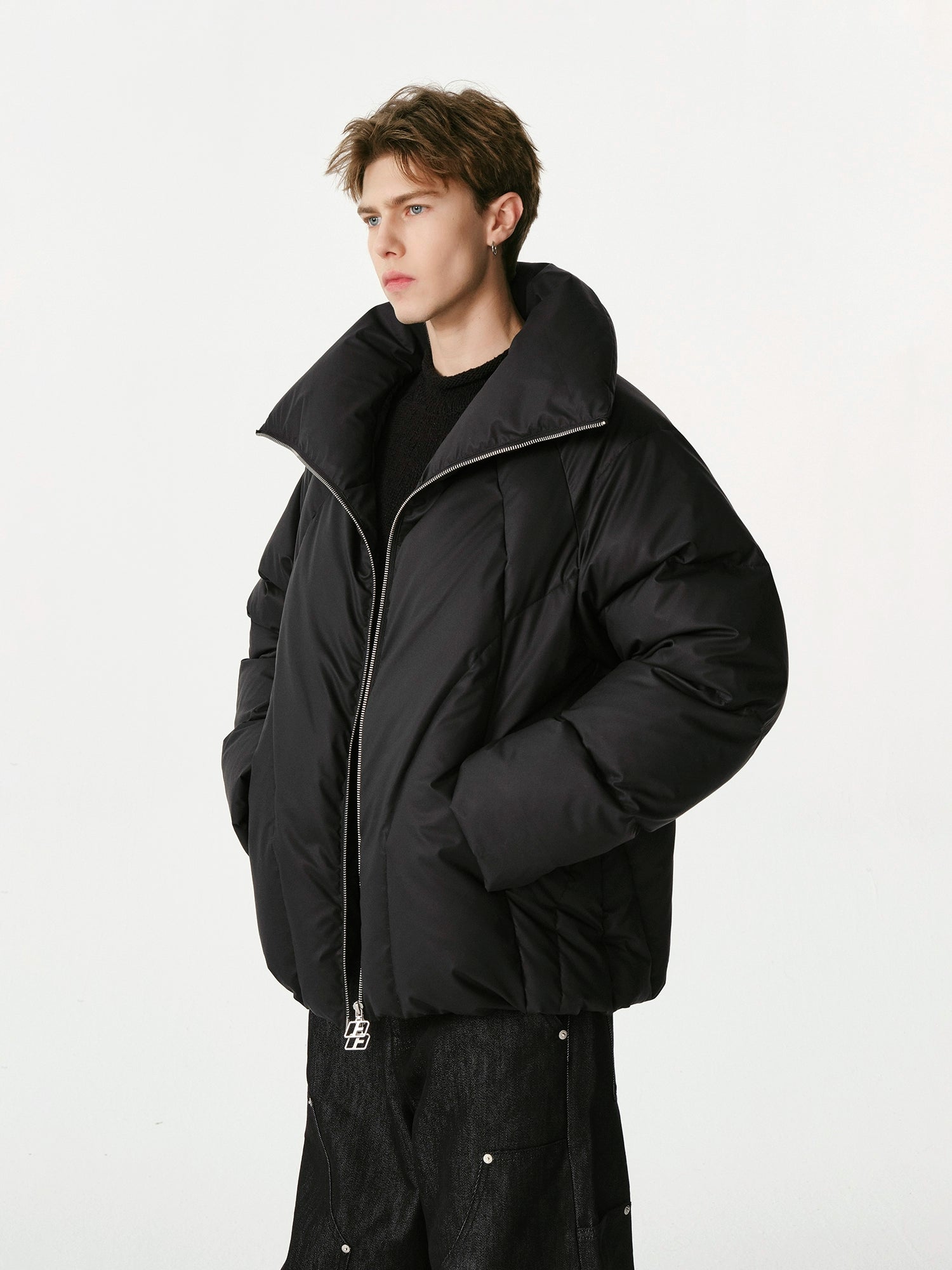 首元までしっかり覆う立ち襟デザインで冷気の侵入を防ぎ、シンプルながら高級感のあるフォルムが特徴。