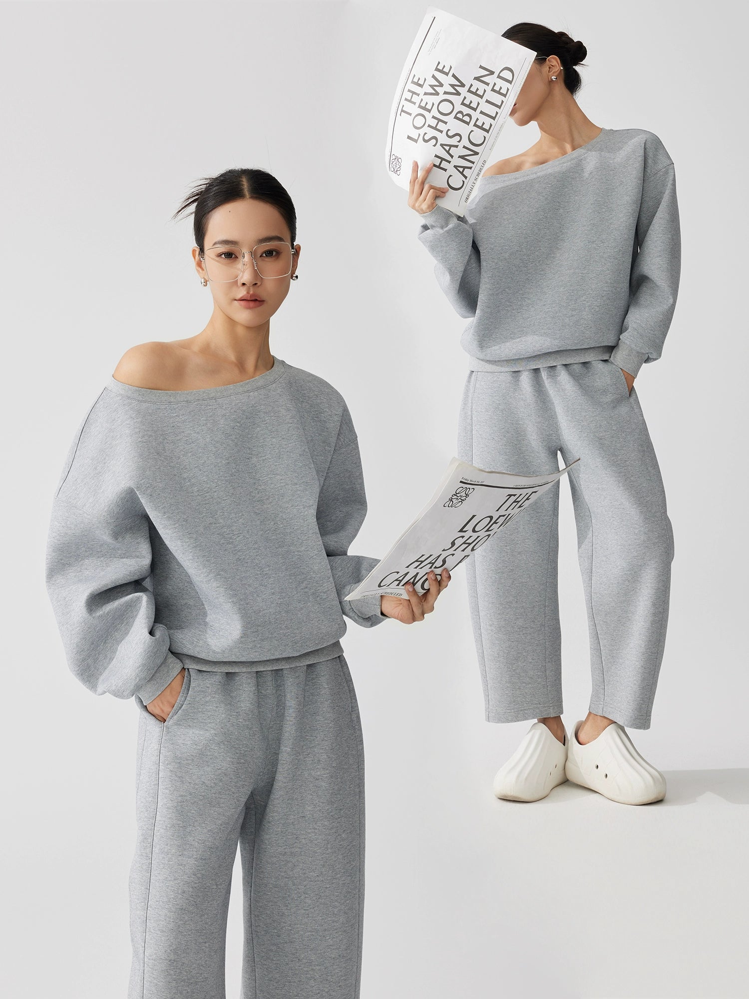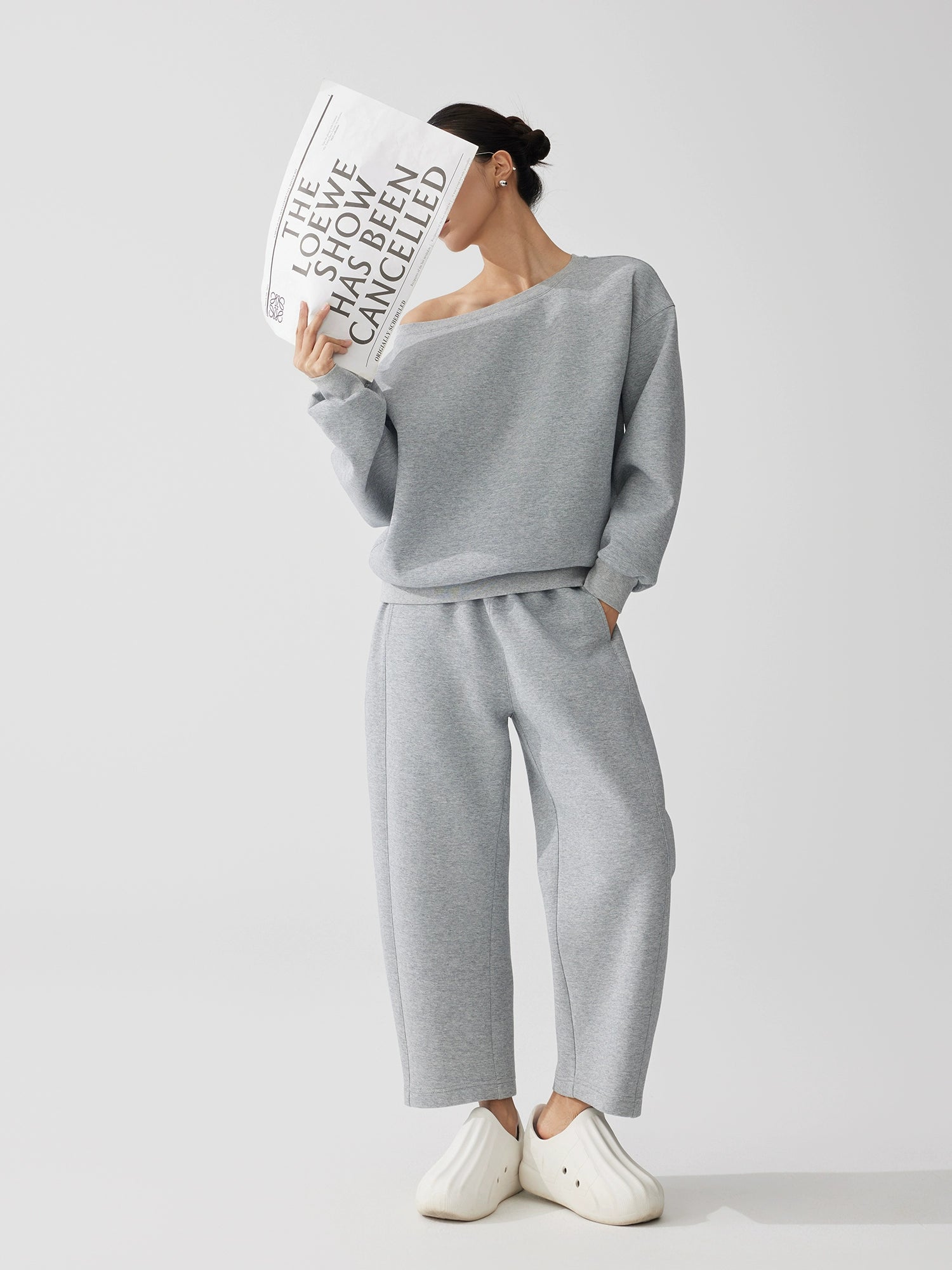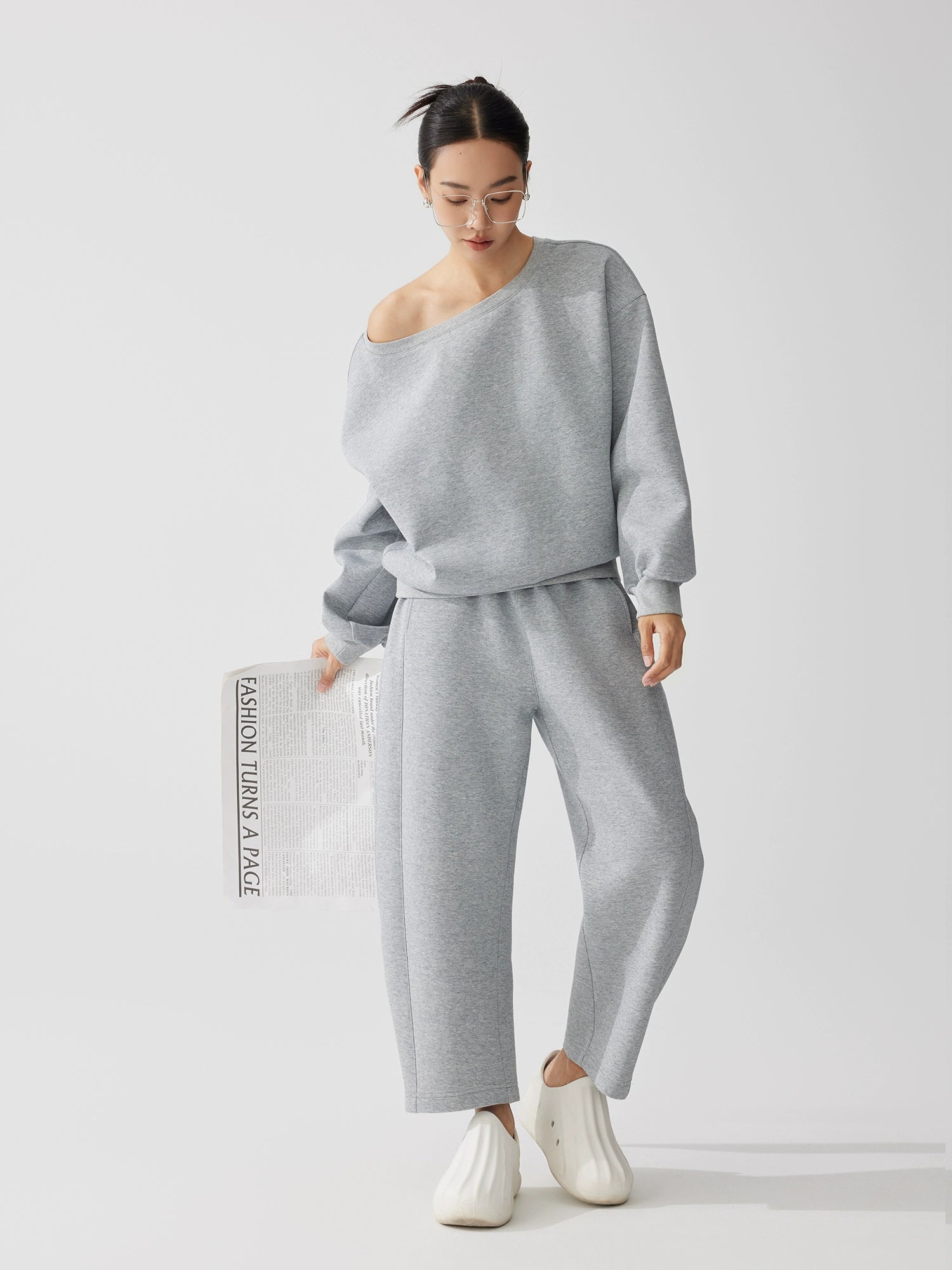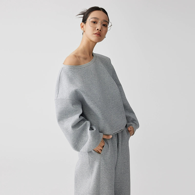 デコルテを美しく見せる斜めワンショルダーのトップスと、空気感のあるストレートシルエットのスウェットパンツを組み合わせた上下(別売り)ラフさと女性らしさを両立したデザインで、日常使いからワンマイルまで幅広く活躍。柔らかく軽い素材で着心地も抜群。春先にちょうど良い薄手スウェット生地。