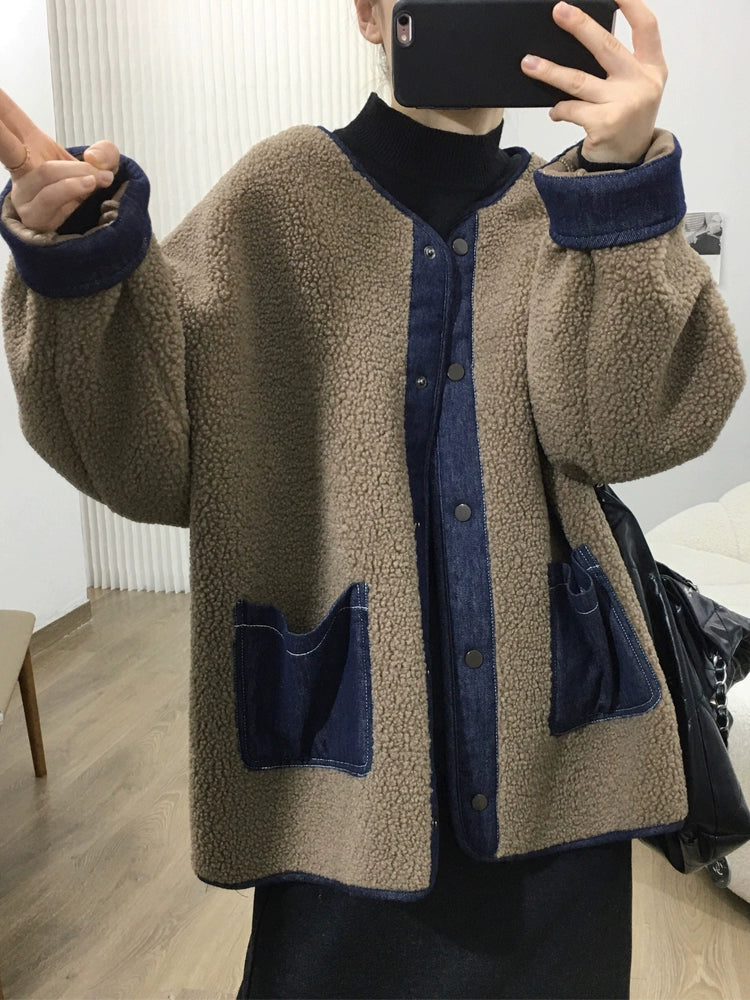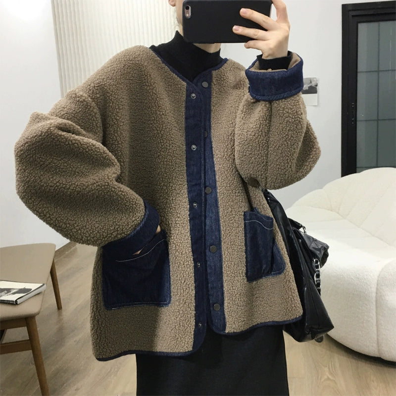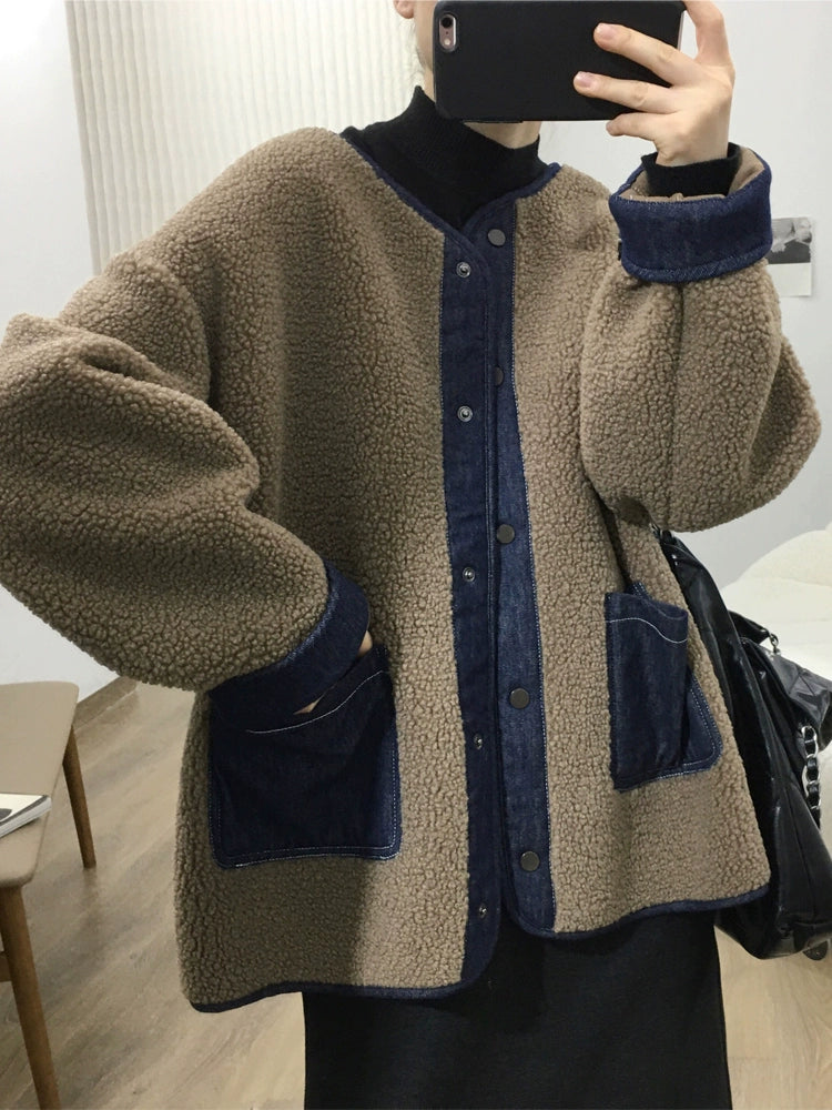 ふんわり柔らかいボア素材に、デニム生地を組み合わせた配色デザインが特徴の冬アウター。ゆったりとしたシルエットで重ね着もしやすく、軽量ながら保温性も抜群。襟・前立て・ポケットに施された牛仔切り替えがカジュアルなアクセントをプラスします。