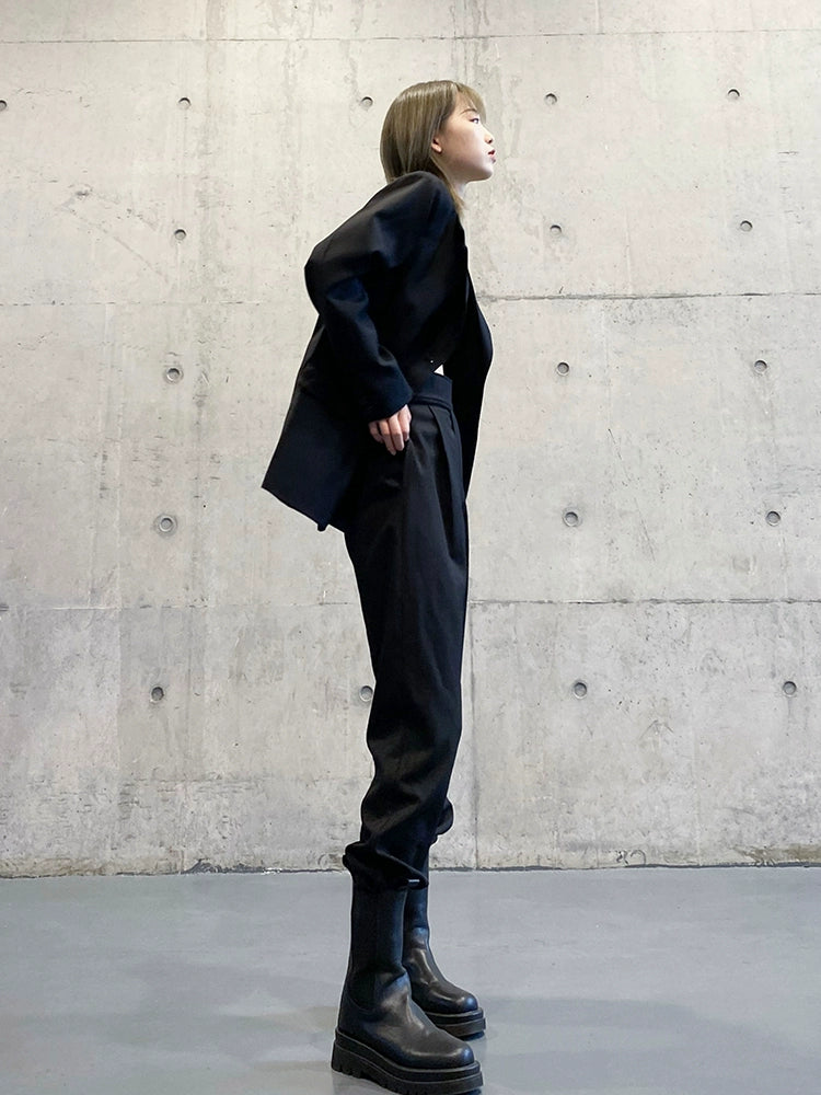 程よいハリと落ち感のある生地で、身体のラインをきれいに見せる修身シルエット。男女中性スタイルで、フォーマルにもストリートにも馴染む1枚です。