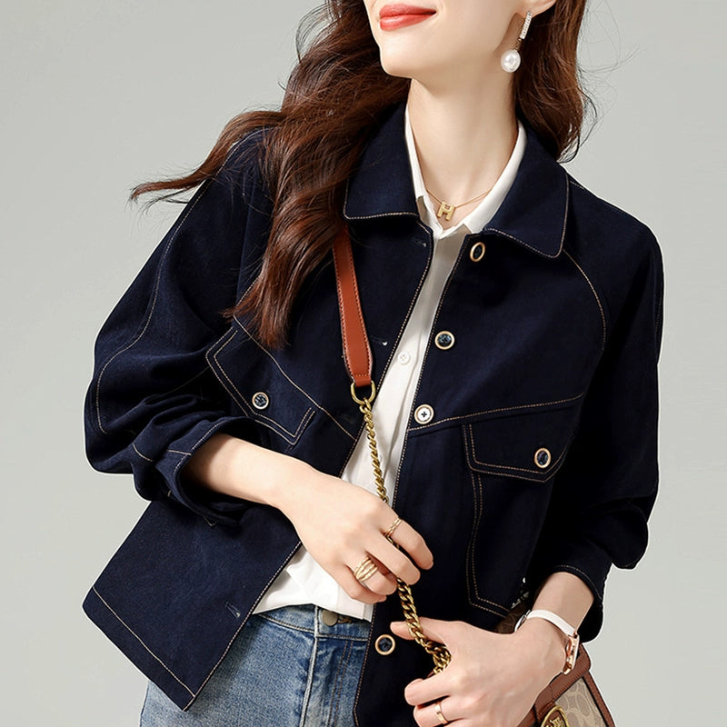デニム素材をベースにしたショート丈の中綿ジャケット。程よく厚みのあるキルティング裏地でしっかり暖かく、秋冬の防寒にも最適。小柄な方にもバランスよく着こなせる丈感で、デニム特有のカジュアルさと上品さを両立。オーバーすぎないシルエットで、パンツにもスカートにも合わせやすい万能アイテムです。